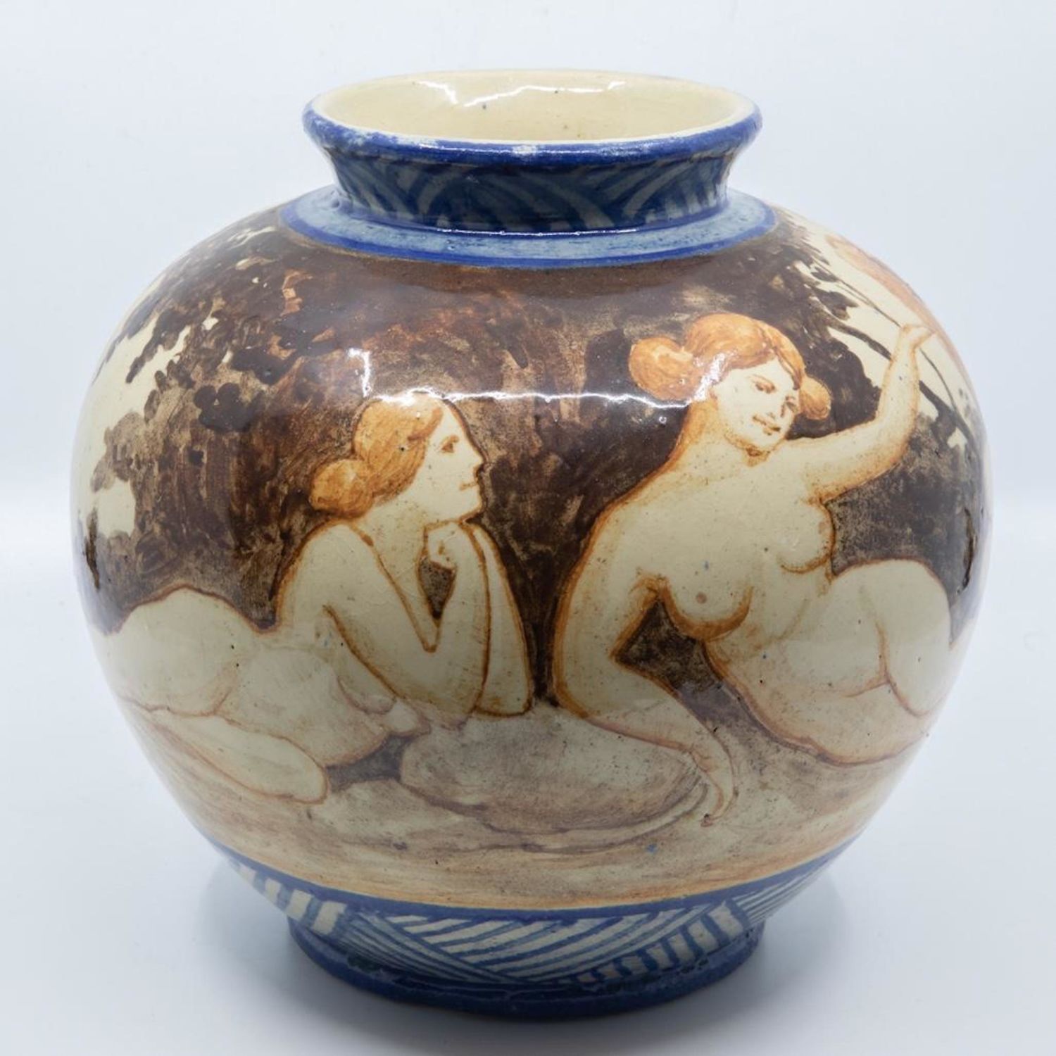RORSTRAND Vase artist signed decorated in the art nouveau/art deco style with reclining nudes, Sweden, early 20th century Glazed earthenware Manufacturer mark artist signed NTE. Measure approx 8 1/4 good condition