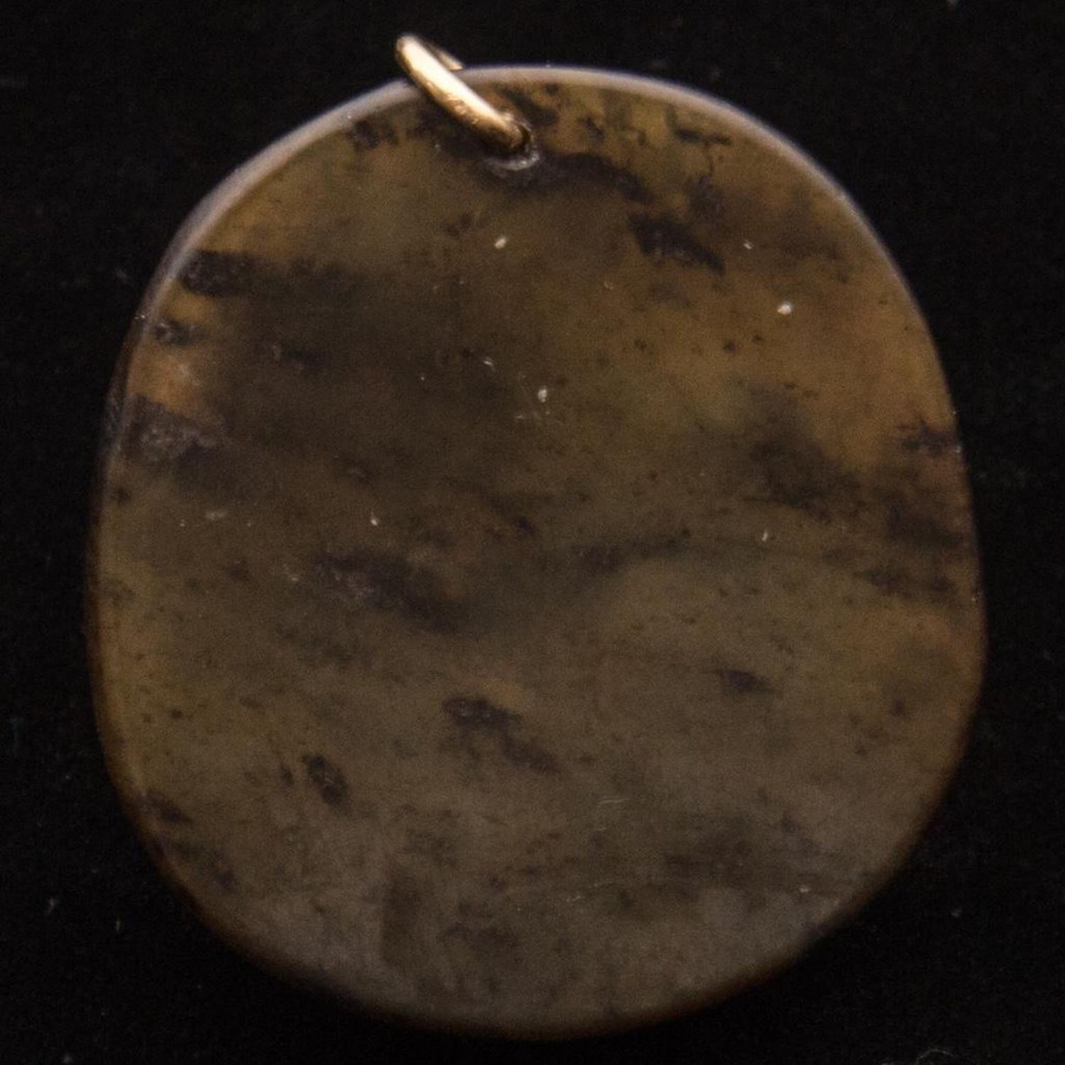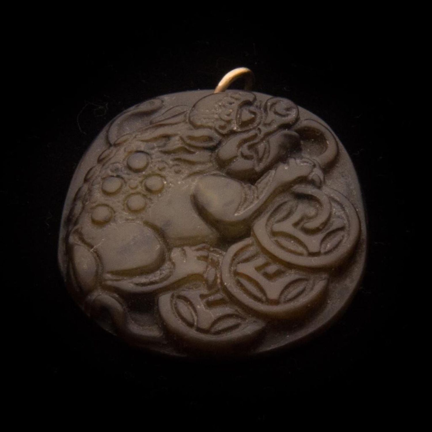 Chinese hard stone/nephrite pendent with 14k gold loop depicting mythical creatures. Measures 2" approx at longest point overall good condition