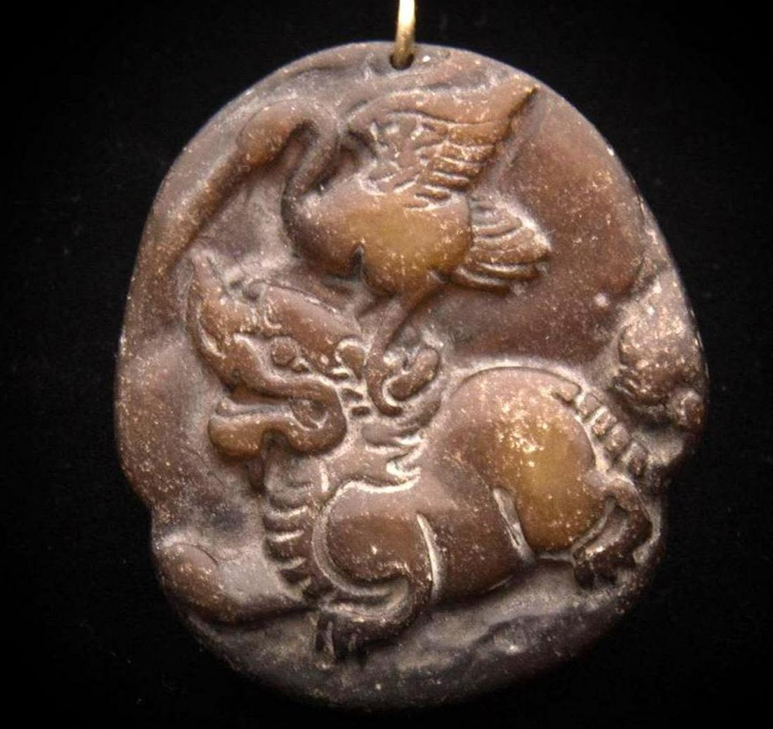 Chinese hard stone/nephrite pendent with 14k gold loop.depicting mythical creatures approx 2" and longest point overall good condition