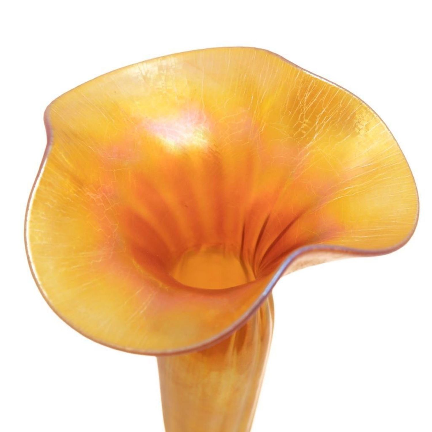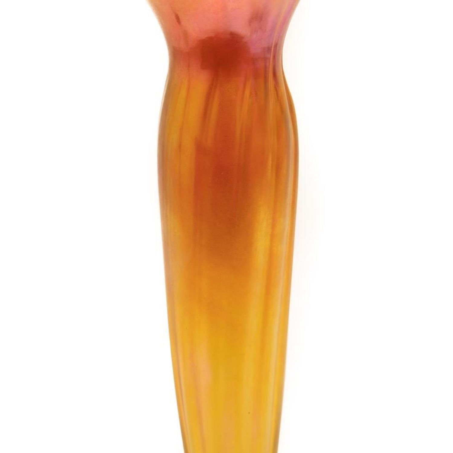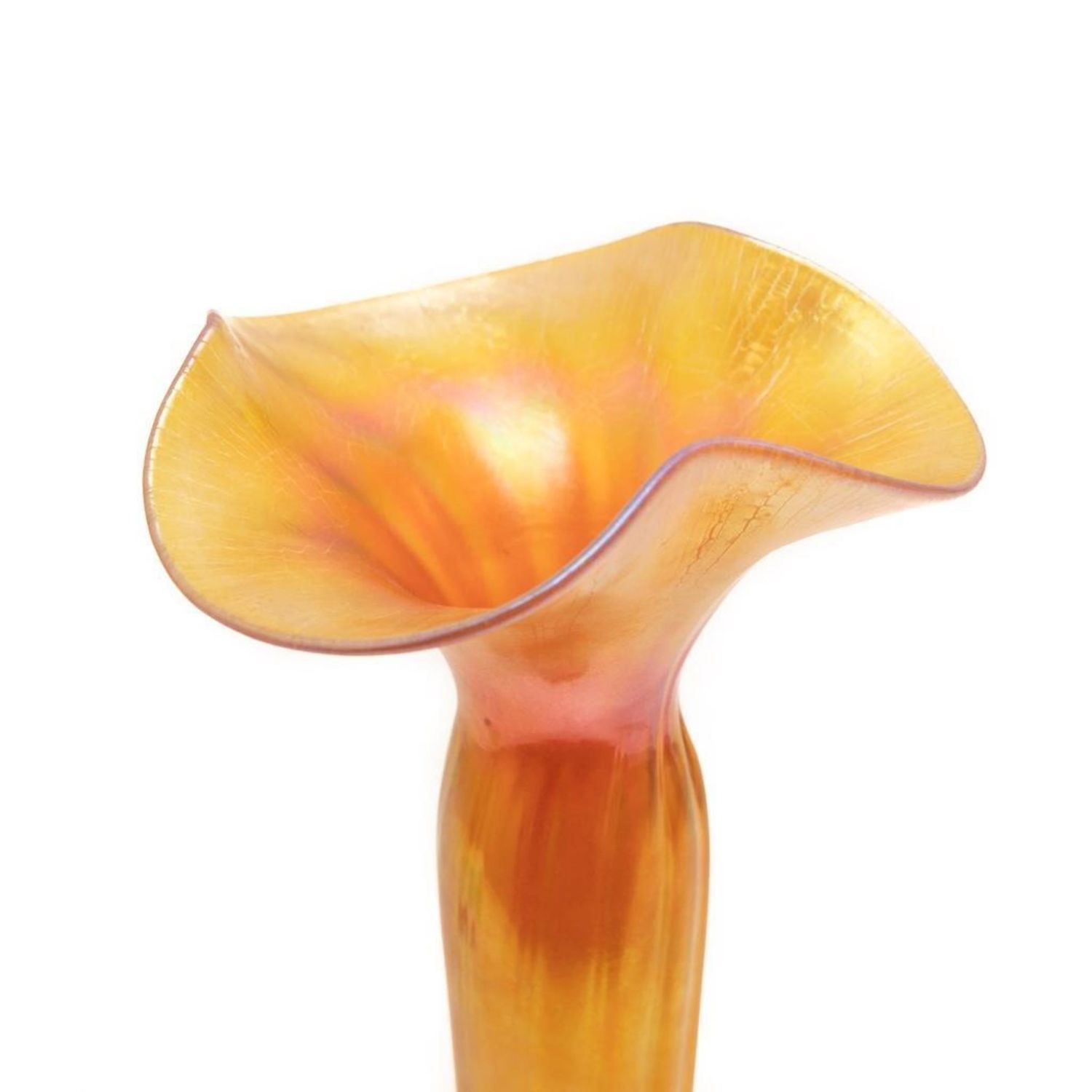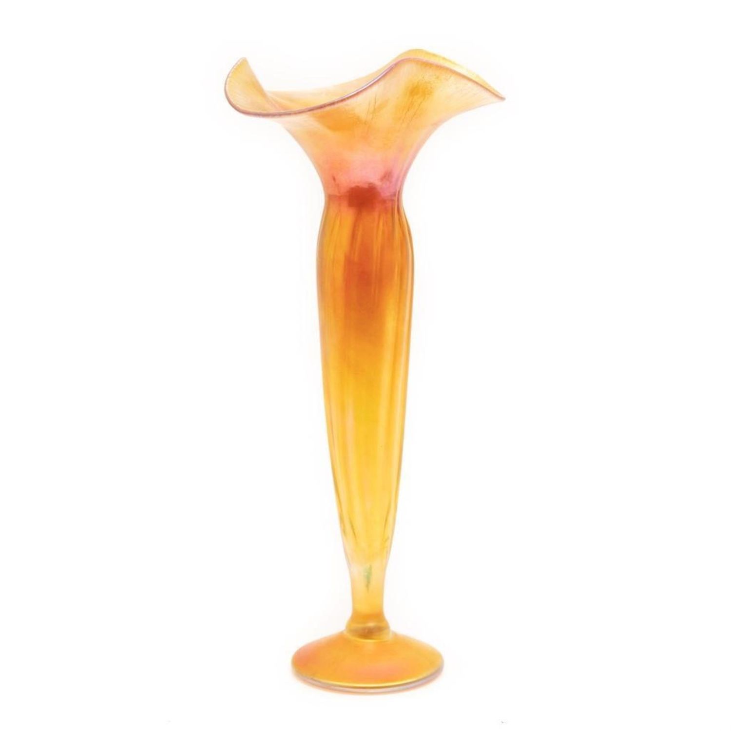 Iridescent art glass tall vase signed LCT Favrile m-4914 on bottom, ht. 13 in. good condition. This is probably Lunberg Studio