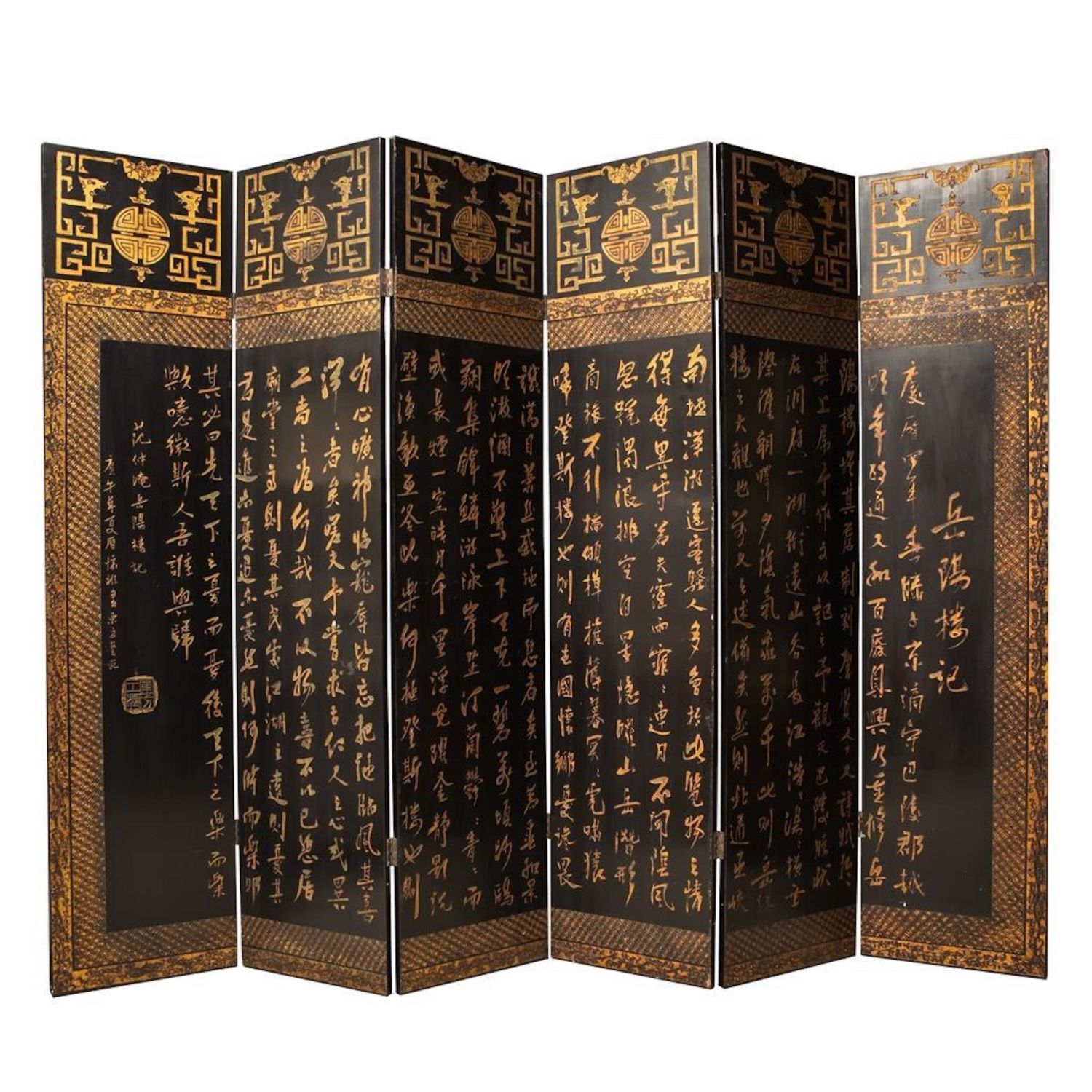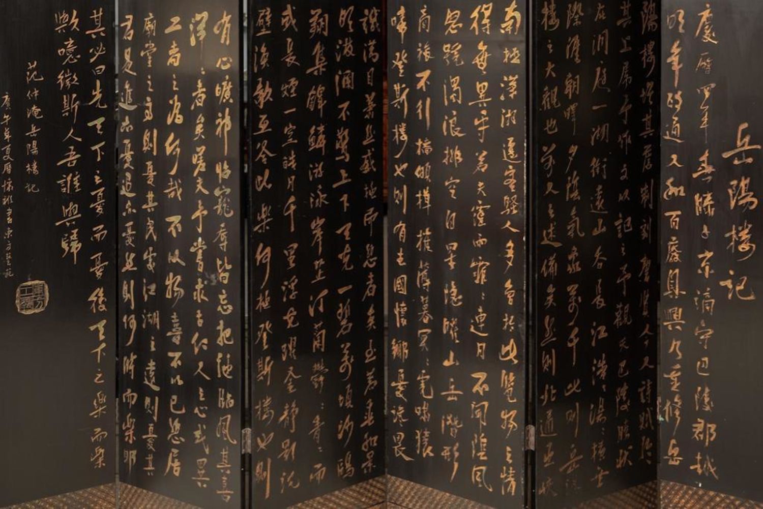 Asian Chinese antique 6 panel Calligraphy decorated screen early 20th century 78"h x 108"w ..The following is a rough translation: It’s called Yue Yang Lou Ji or Memorial to the Yue Yang Tower, it’s an essay written in 1046 by a guy who was demoted from central government to provincial government (wrongfully in his opinion). The bulk of the essay is just praising the natural scenery, but in the end he makes a brief exclamation on how difficult it was to govern (“Being high in the courts and you worry about the people, being away in the country and you worry about the monarch” & “one must worry oneself before the rest of the world worries, and enjoy oneself after the rest of the world can enjoy”)