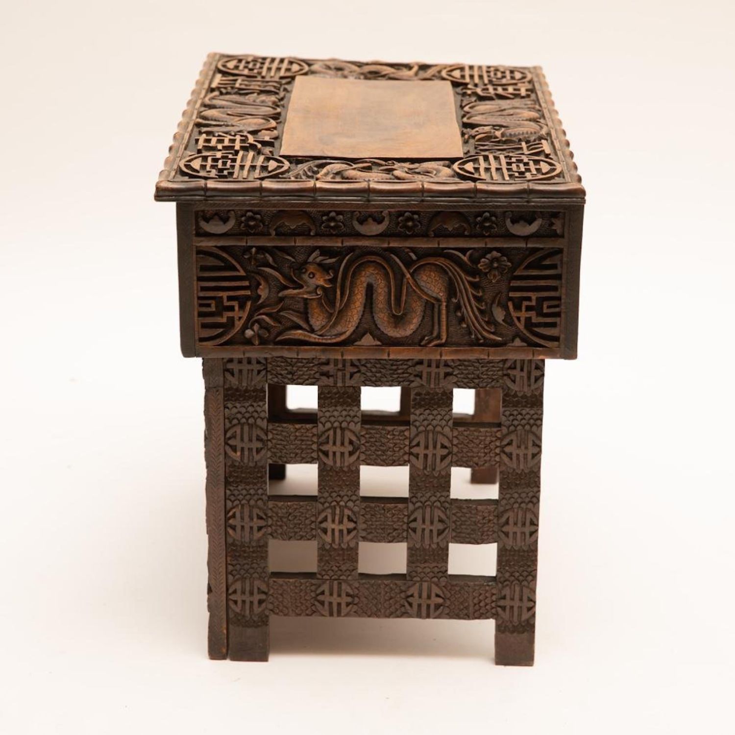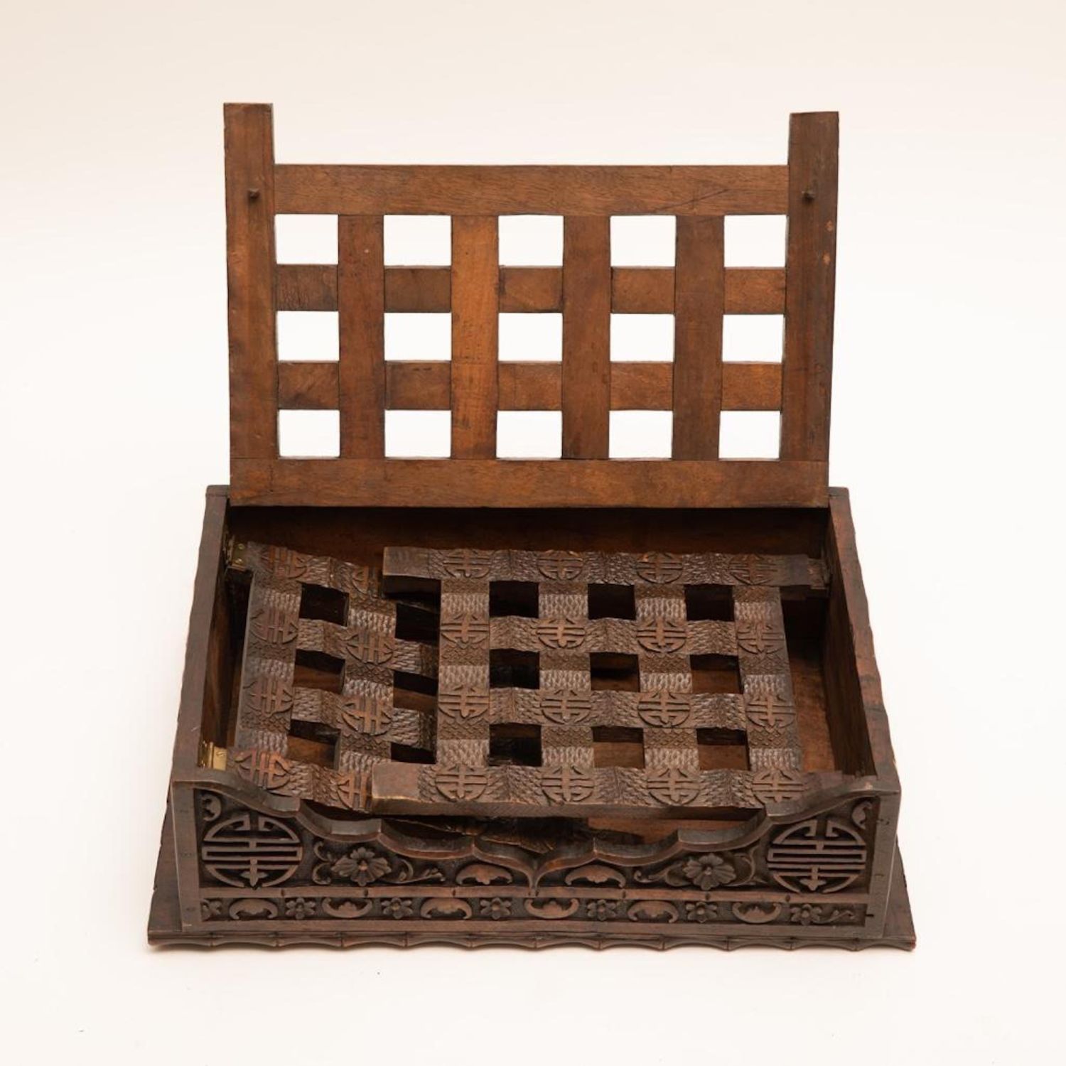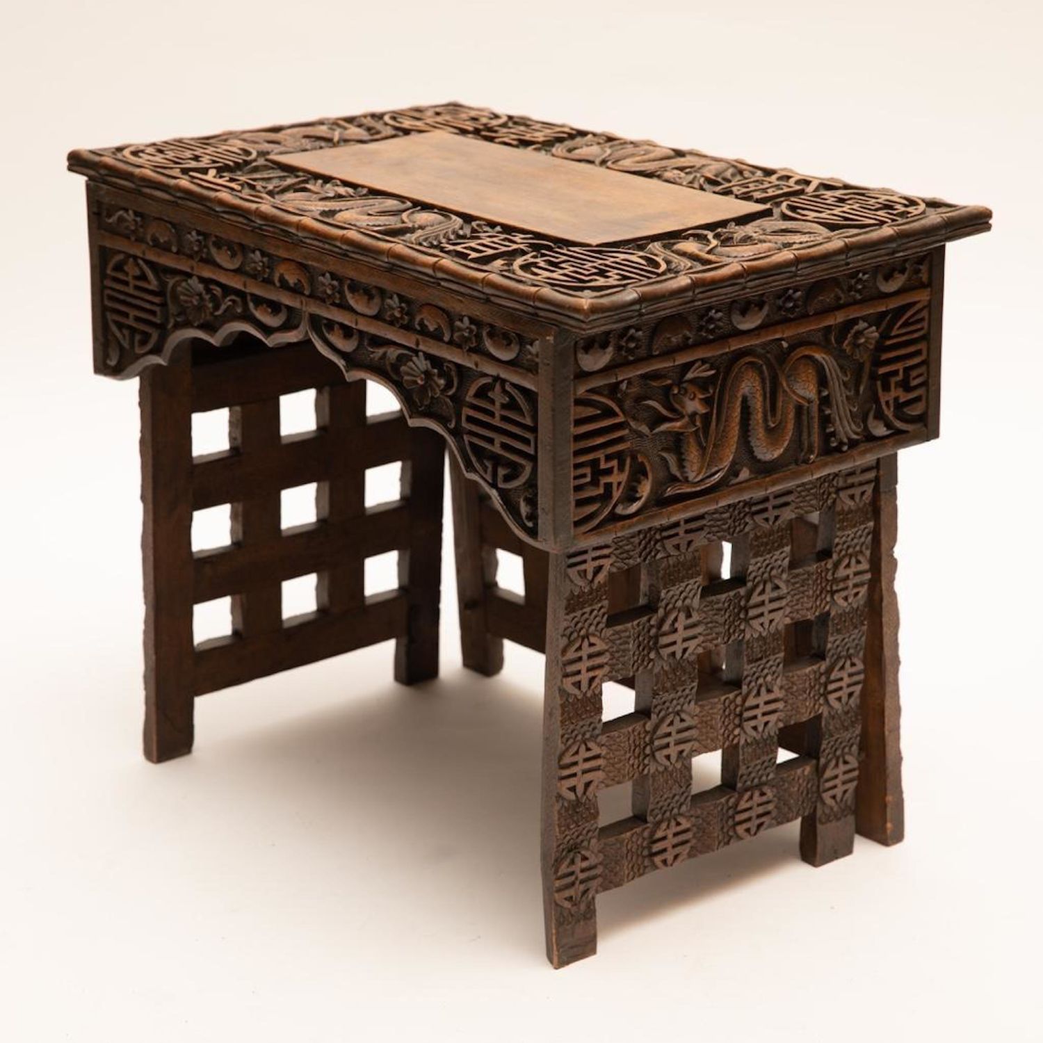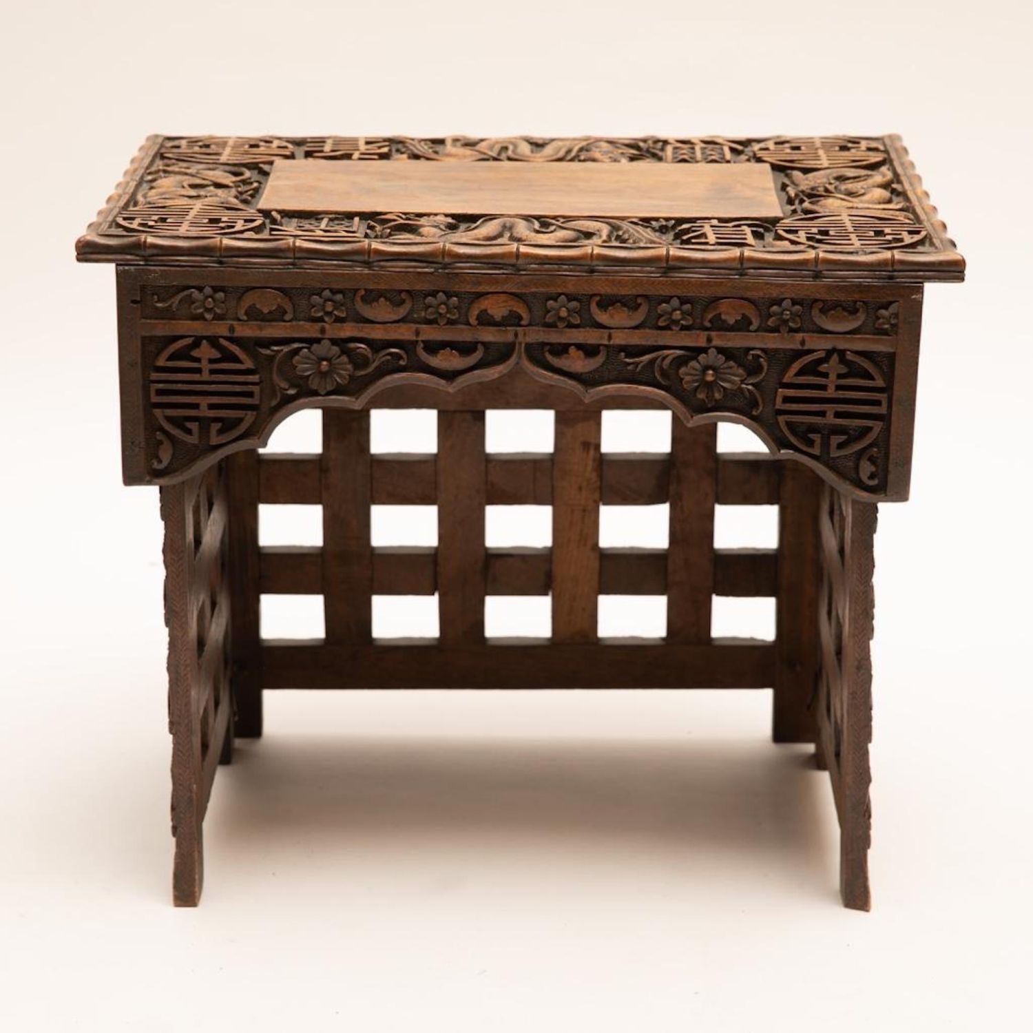 Antique Fold up Chinese carved Hardwood Table. measures 14.5"H x 17"Wx 11.25"D overall good condition