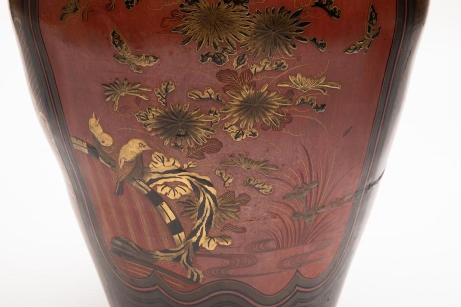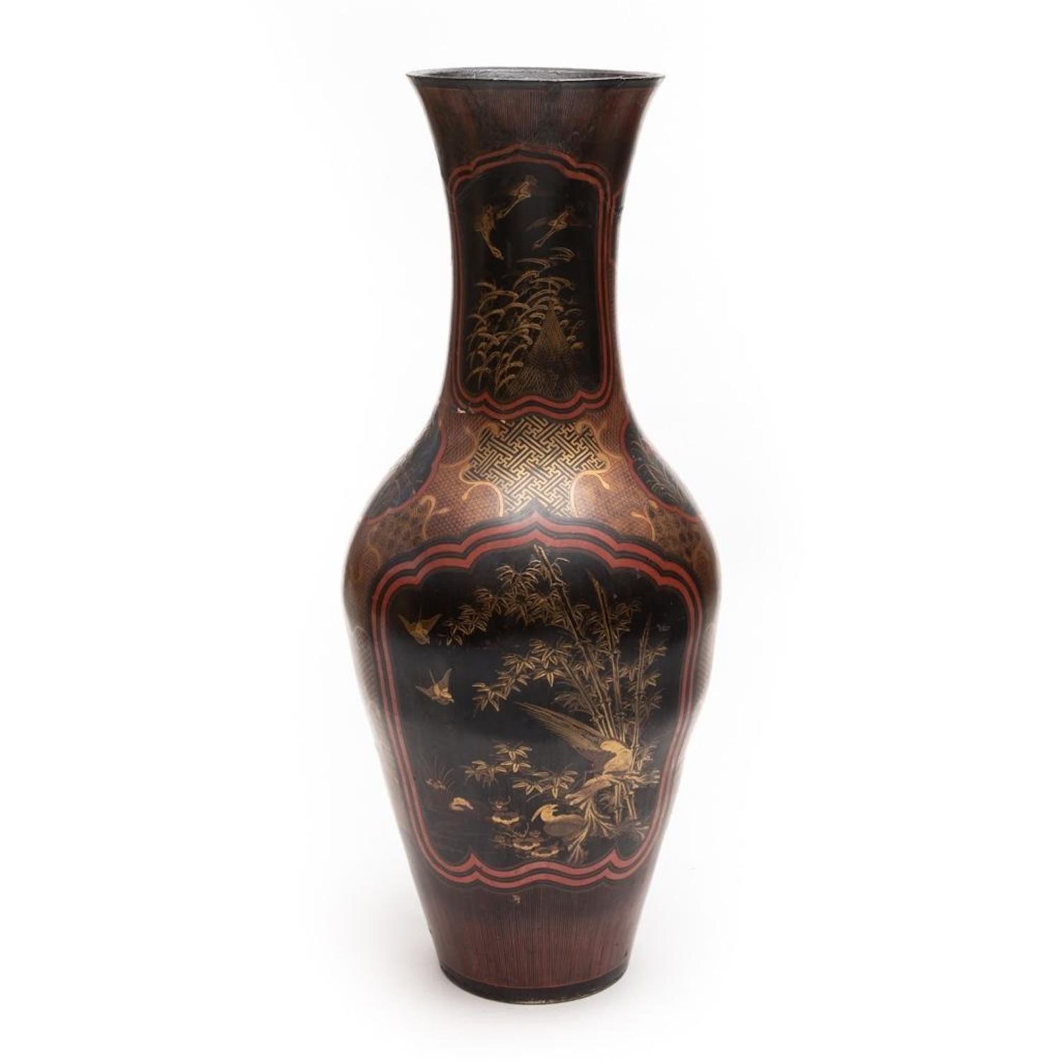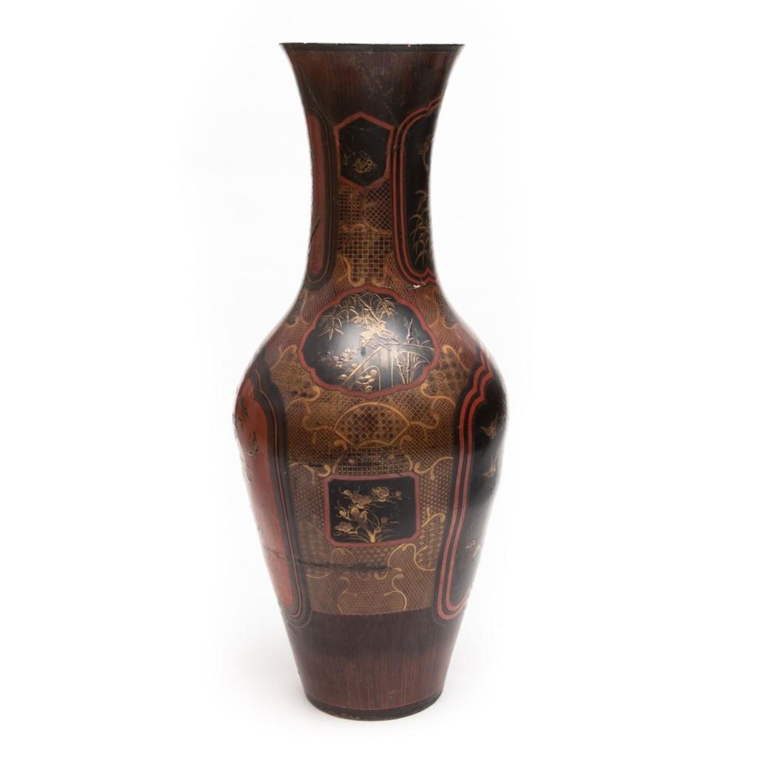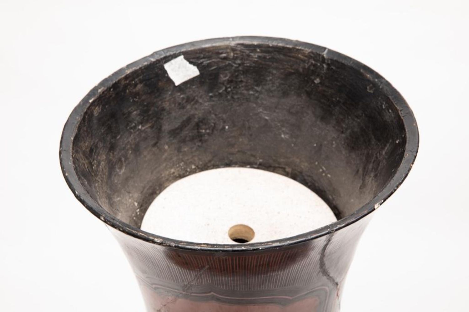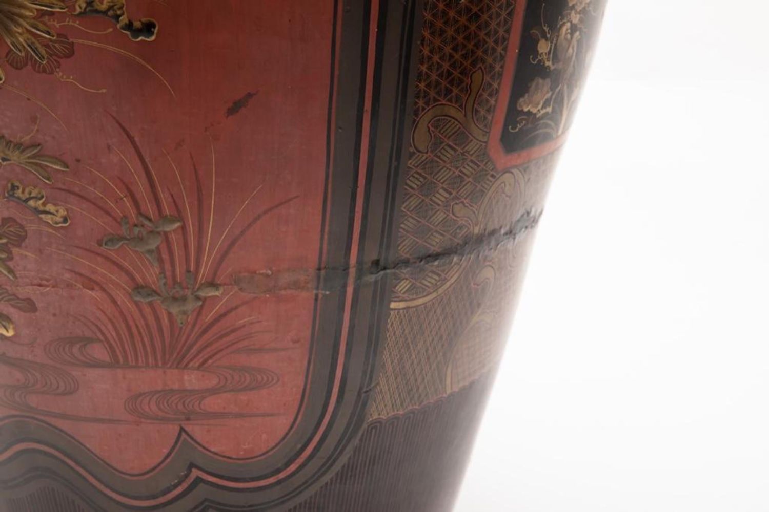 Meiji Japanese Palace size urn Black and Red Lacquered Pottery Vase. Measures 44"H x 18 1/2 in. diam. Restoration work visible. A 9 inch age crack with losses on the lower body. Minor scuffing on the interior and chips to the rim.