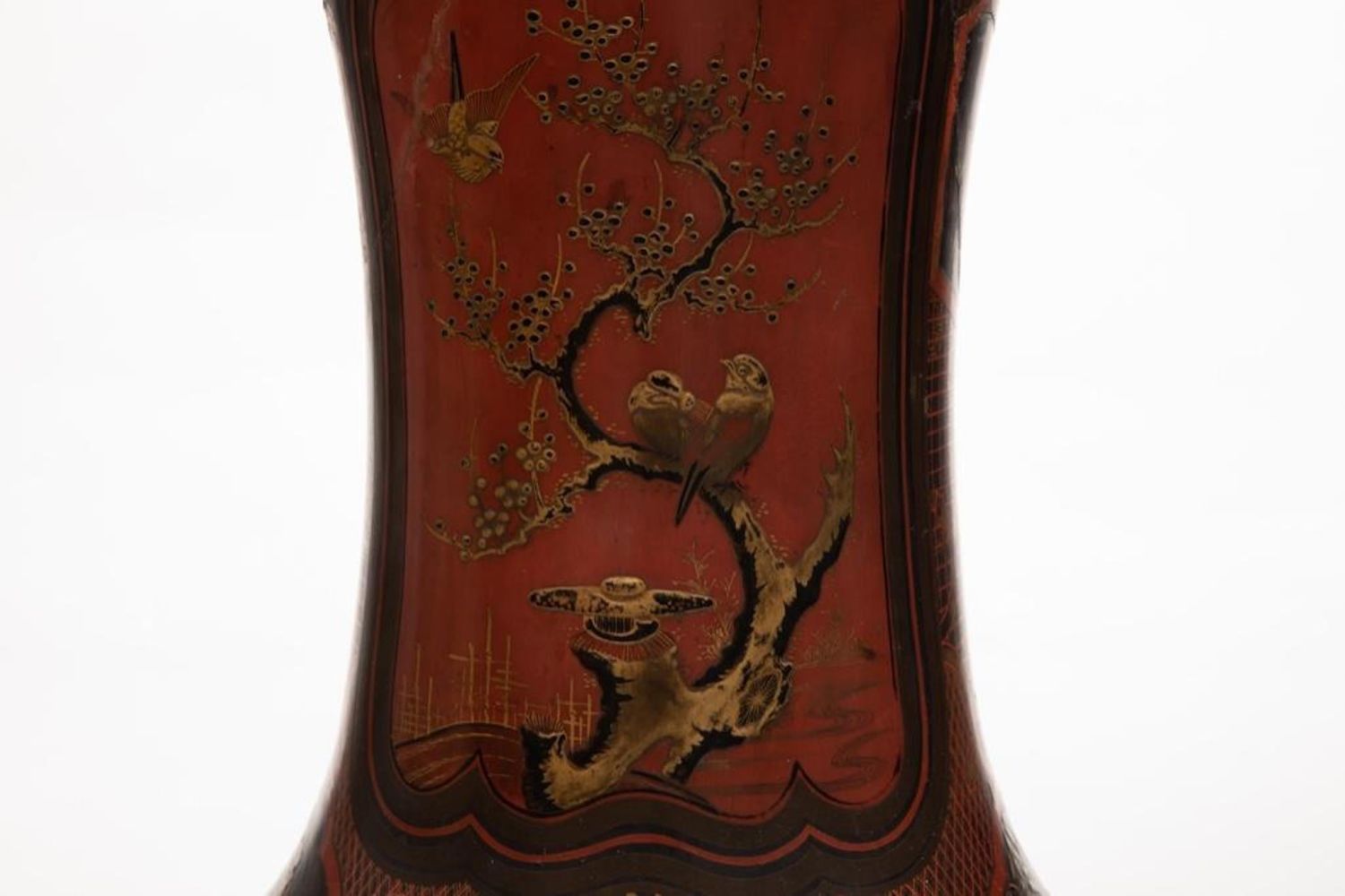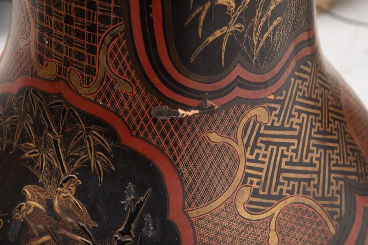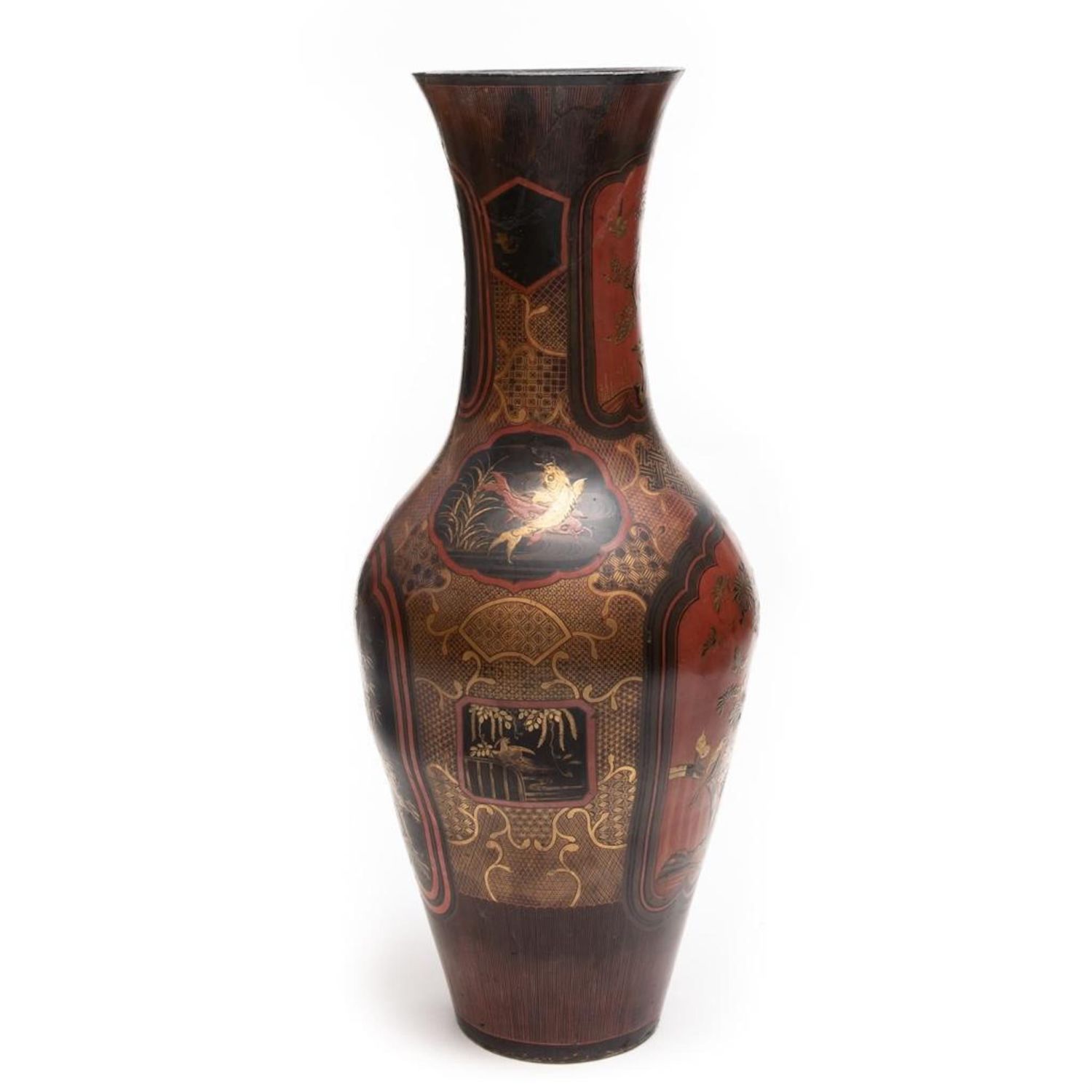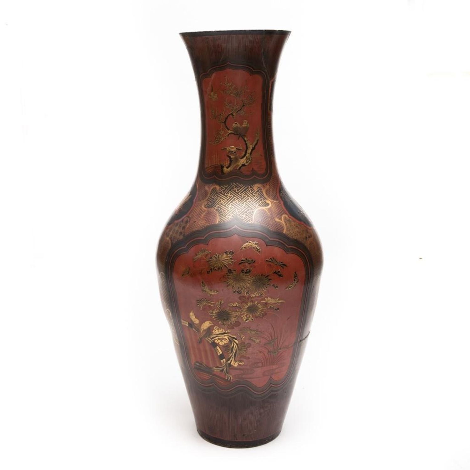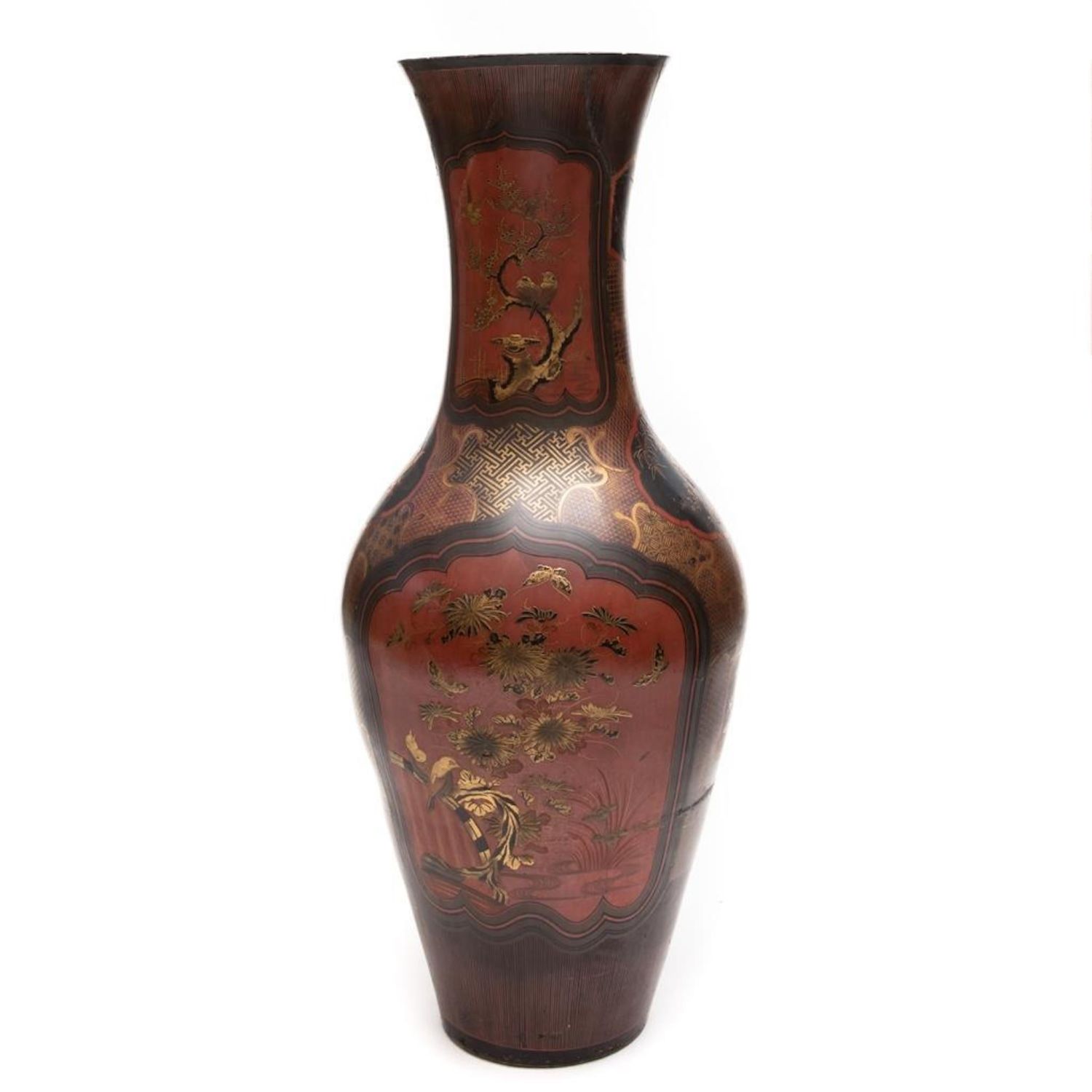 Meiji Japanese Palace size urn Black and Red Lacquered Pottery Vase. Measures 44"H x 18 1/2 in. diam. Restoration work visible. A 9 inch age crack with losses on the lower body. Minor scuffing on the interior and chips to the rim.