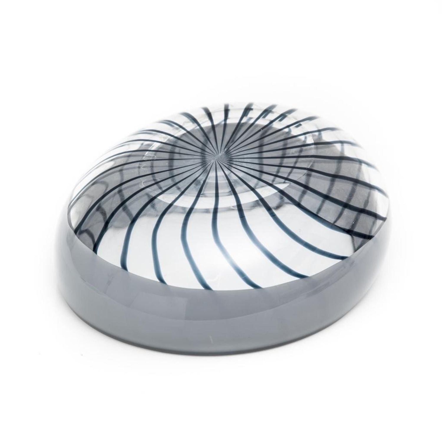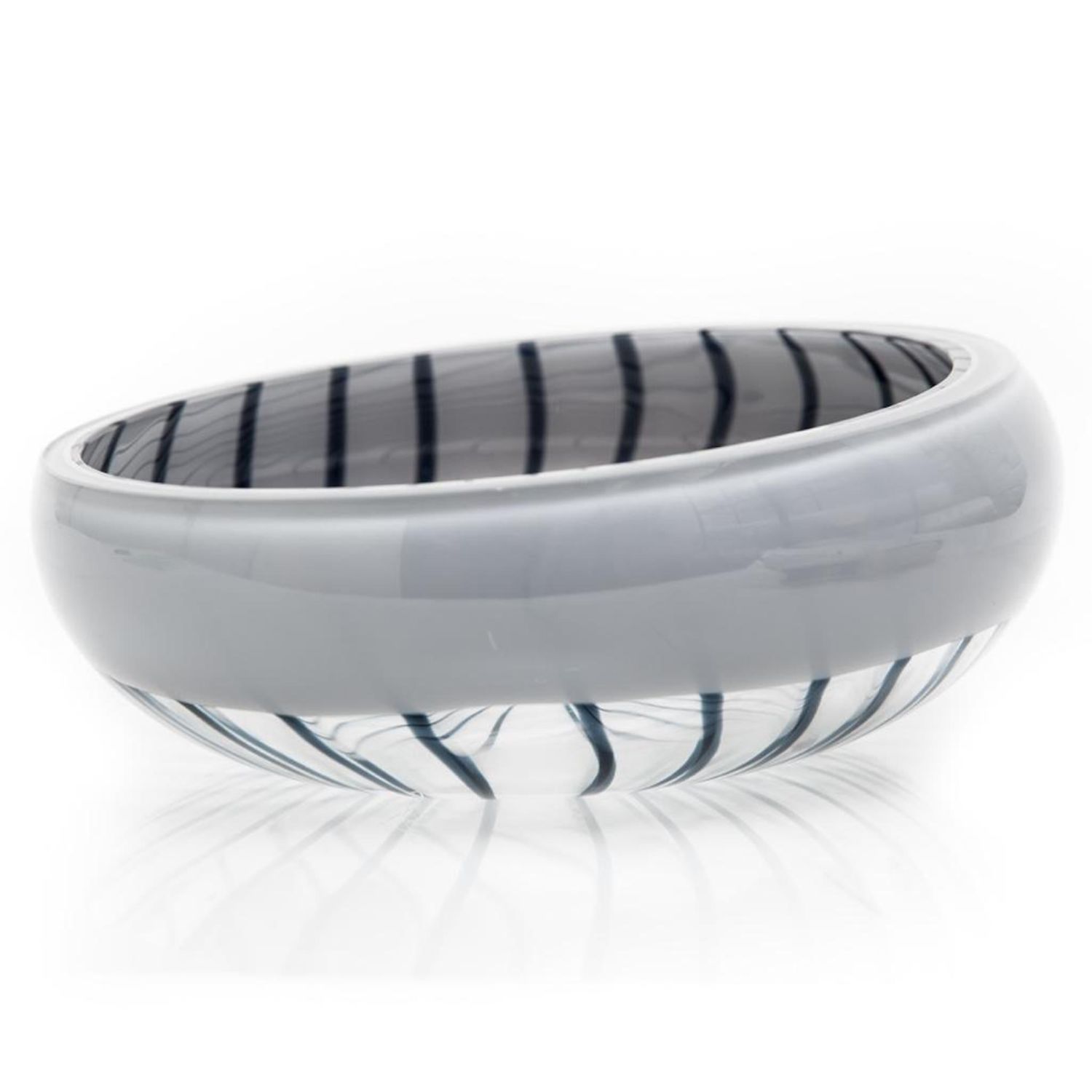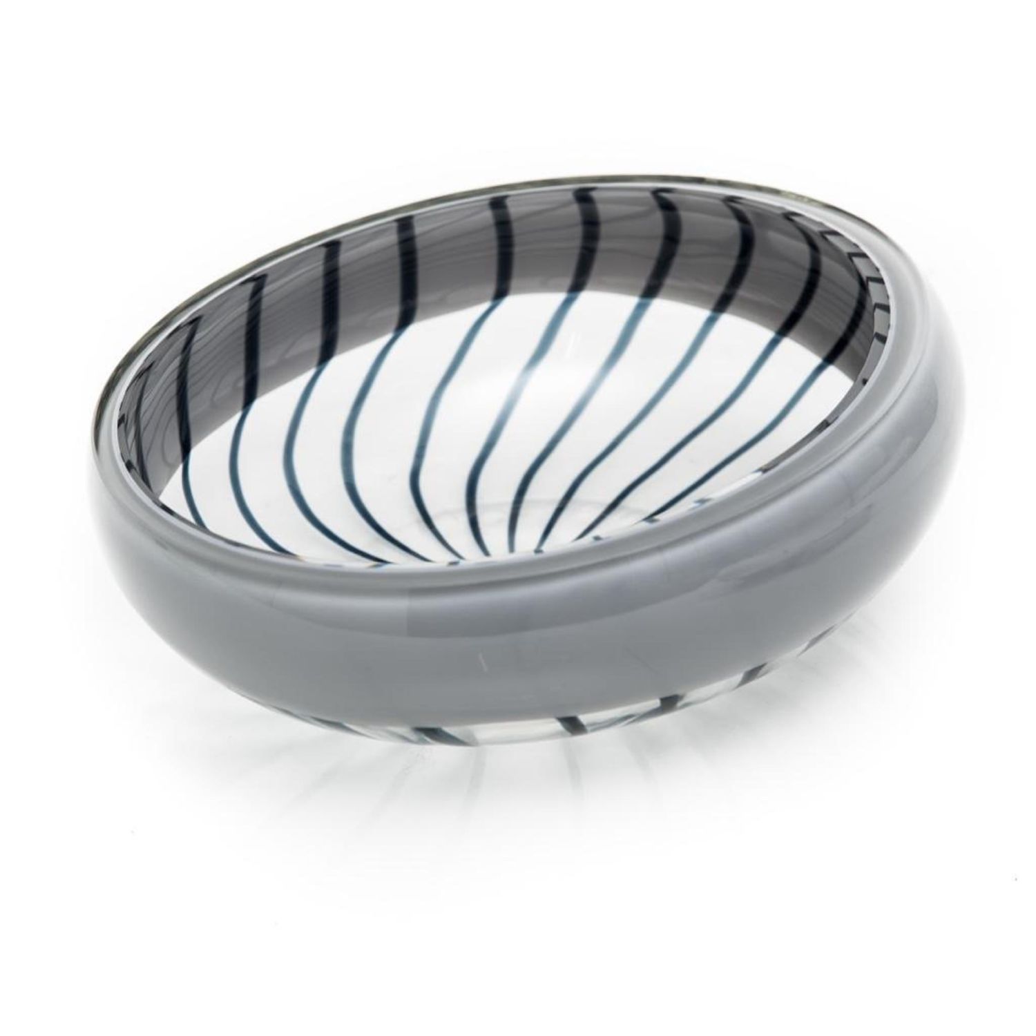 Nicely done Livio Seguso 20th Century Modern Murano Striped Art Glass Bowl. The art glass bowl is of clear blown glass with a grey rim and decorated with swirl of dark blue stripes. The Bowl is signed on the bottom "Des L Seguso" Seguso is one of the most esteemed, historical and respected glass manufacturers on the island of murano, 12"L x 10"W x 4.5"H Approx. good condition