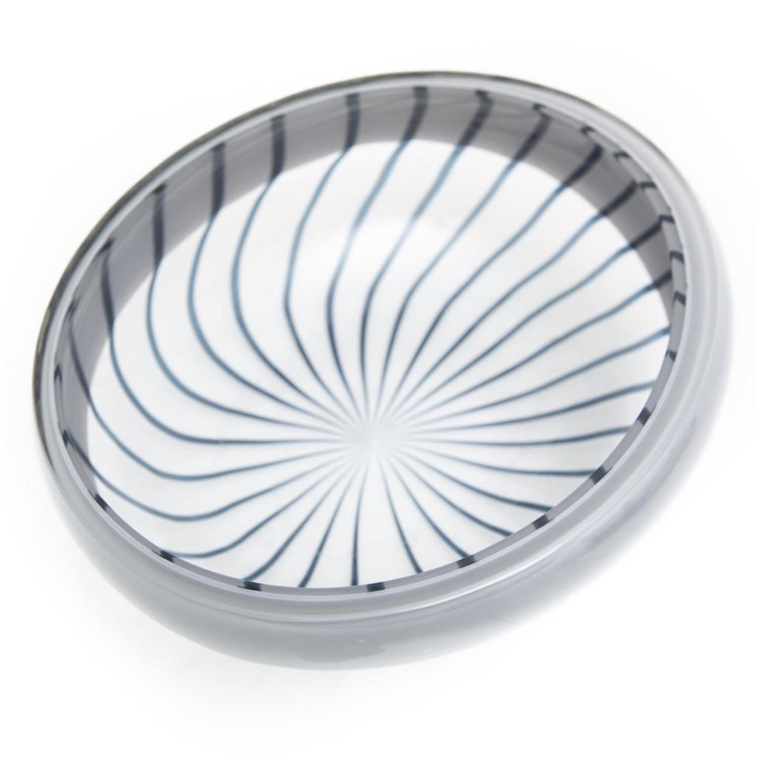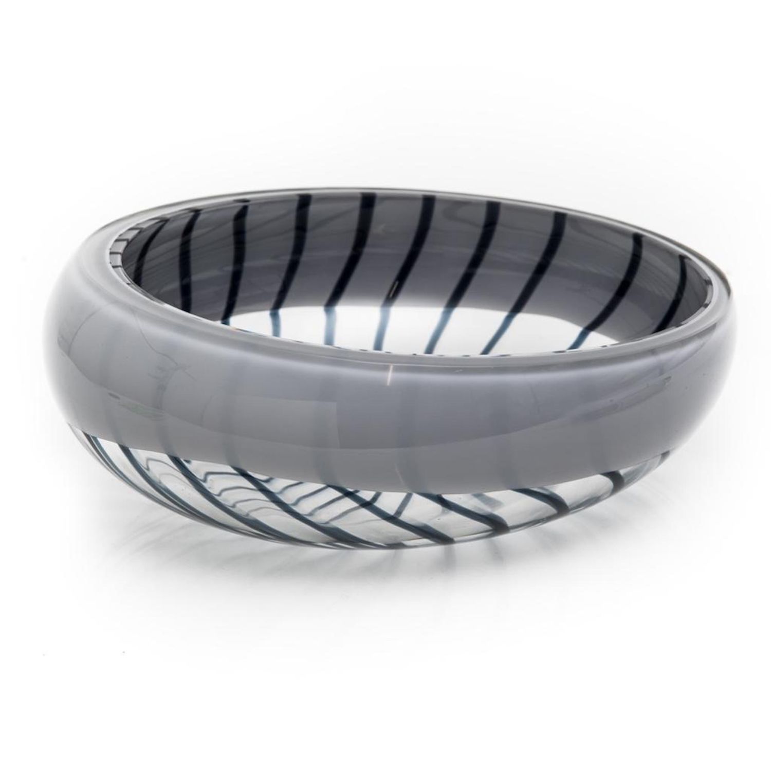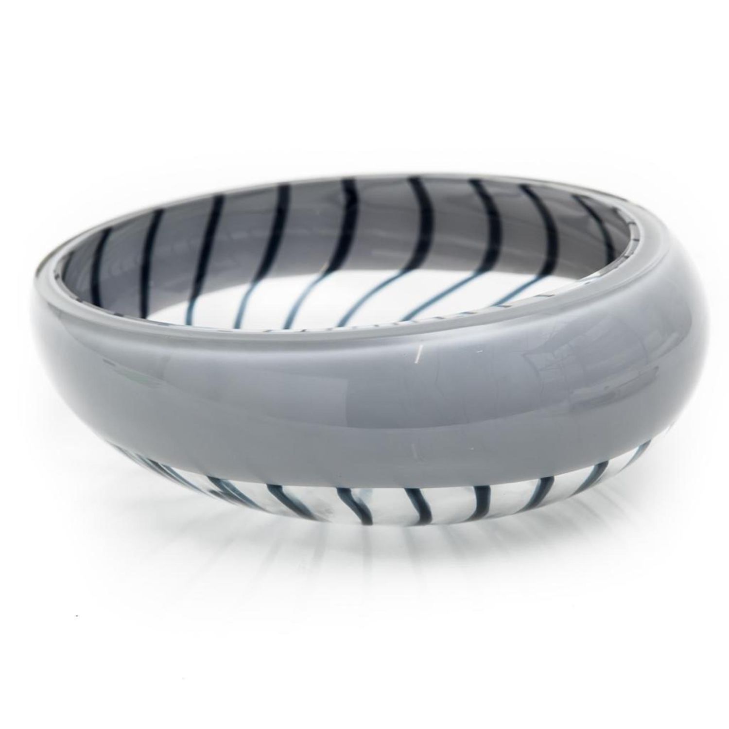 Nicely done Livio Seguso 20th Century Modern Murano Striped Art Glass Bowl. The art glass bowl is of clear blown glass with a grey rim and decorated with swirl of dark blue stripes. The Bowl is signed on the bottom "Des L Seguso" Seguso is one of the most esteemed, historical and respected glass manufacturers on the island of murano, 12"L x 10"W x 4.5"H Approx. good condition