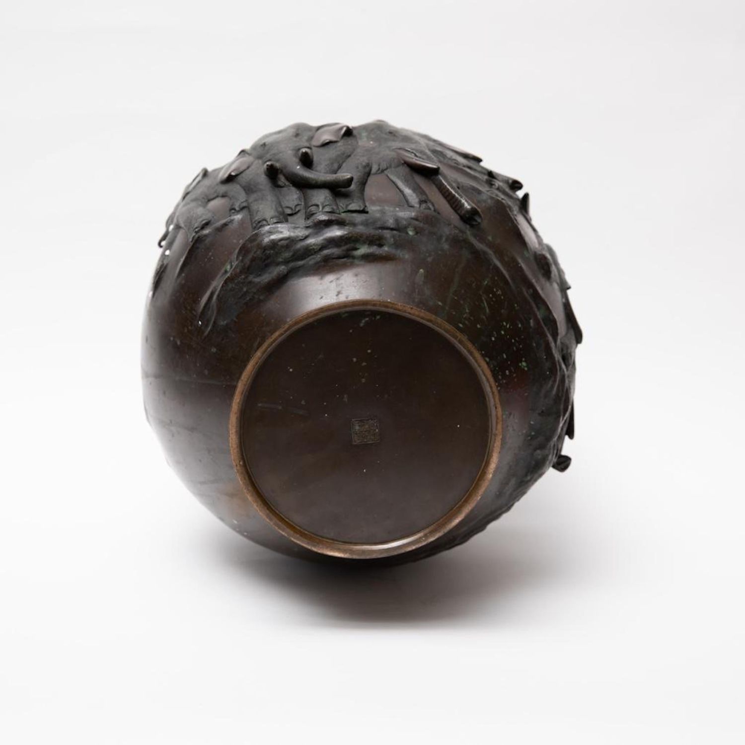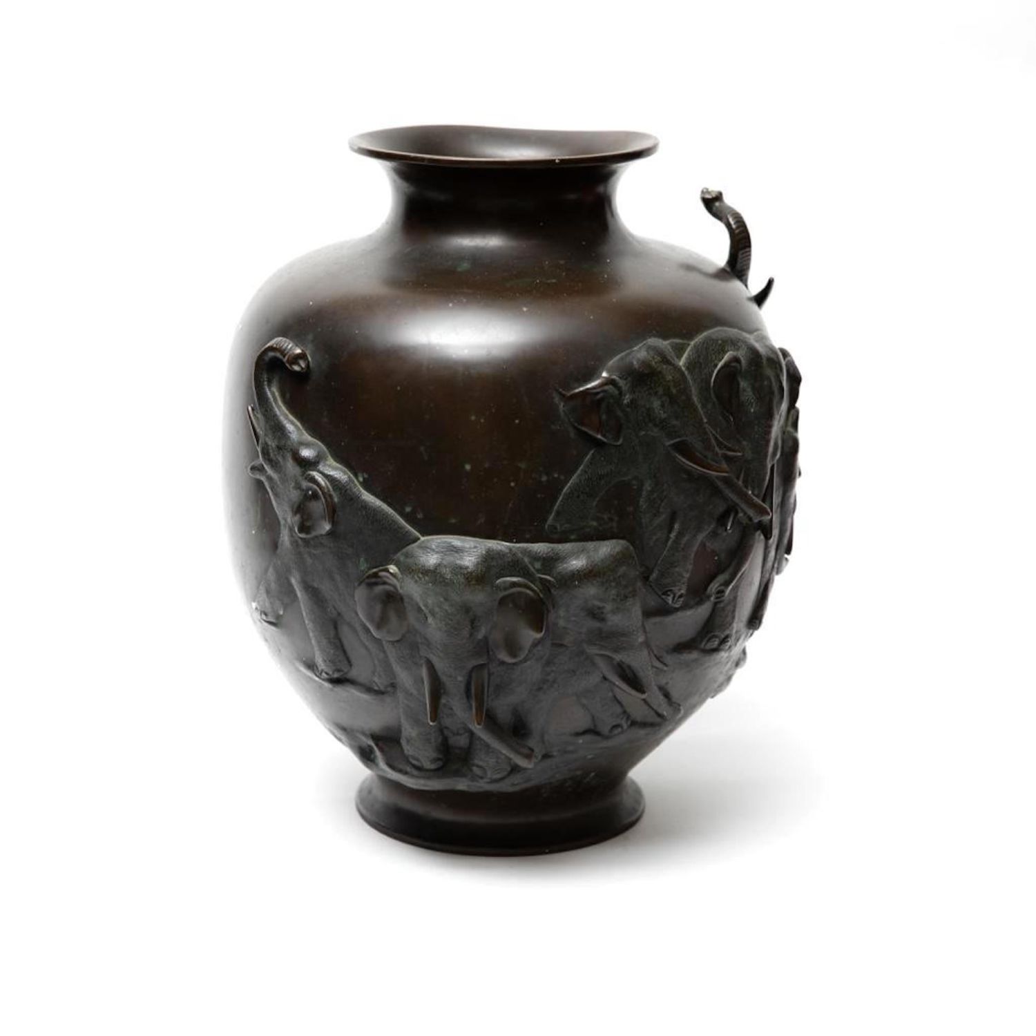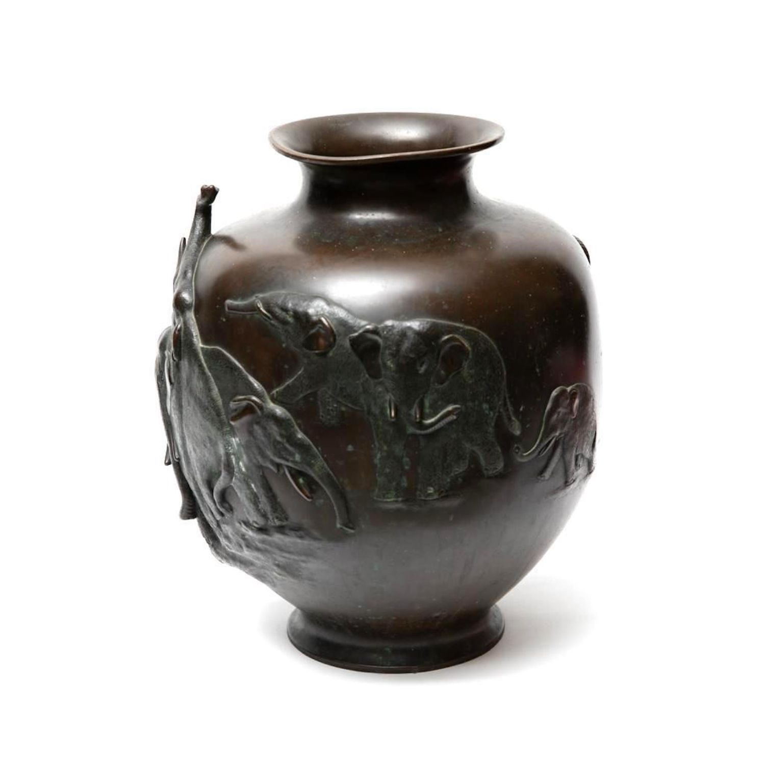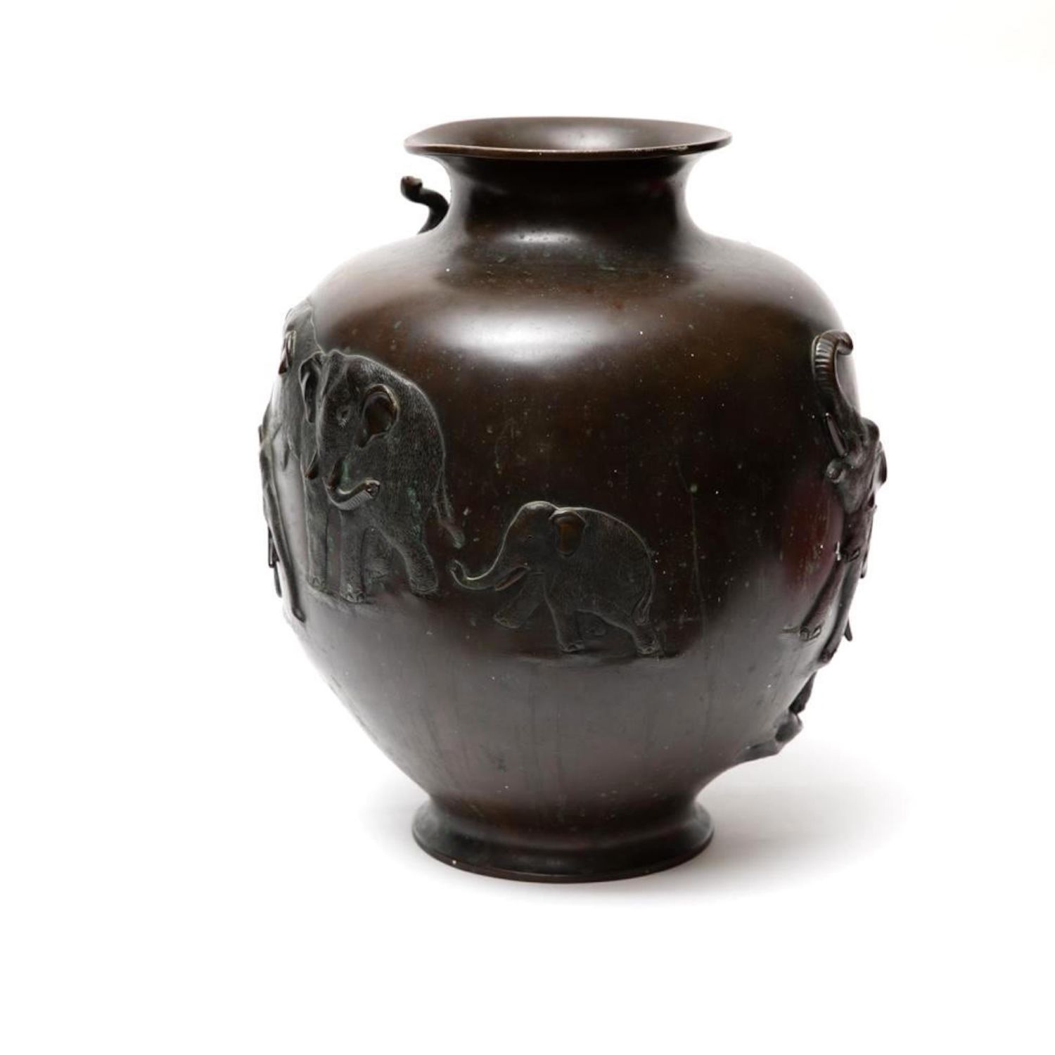 very cool…Meiji Japanese bronze baluster jar with elephant motif. Cast in relief with continuous frieze of elephants, the base with six-character maker marks. Approximate height: 15 1/4"H x 13"D overall good condition