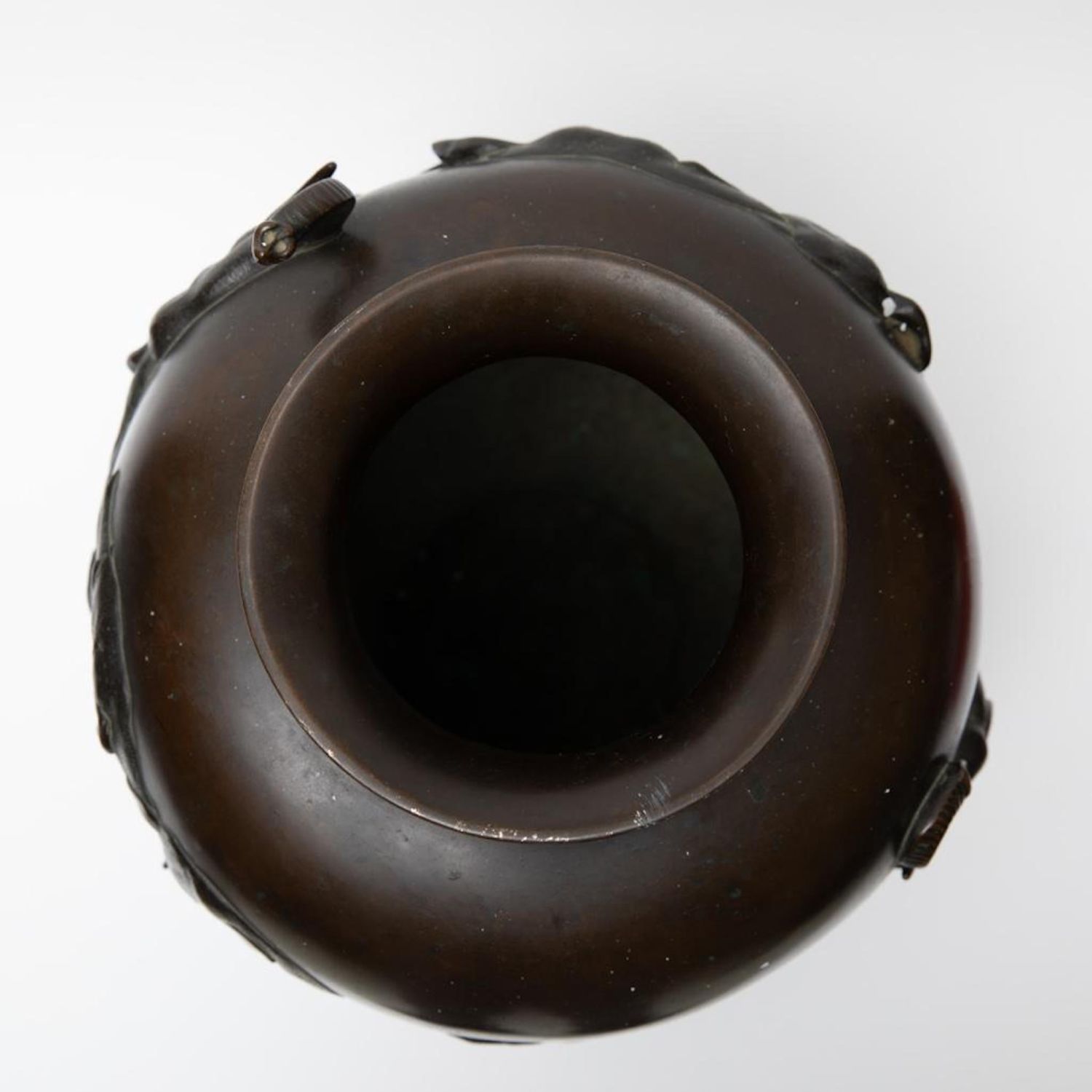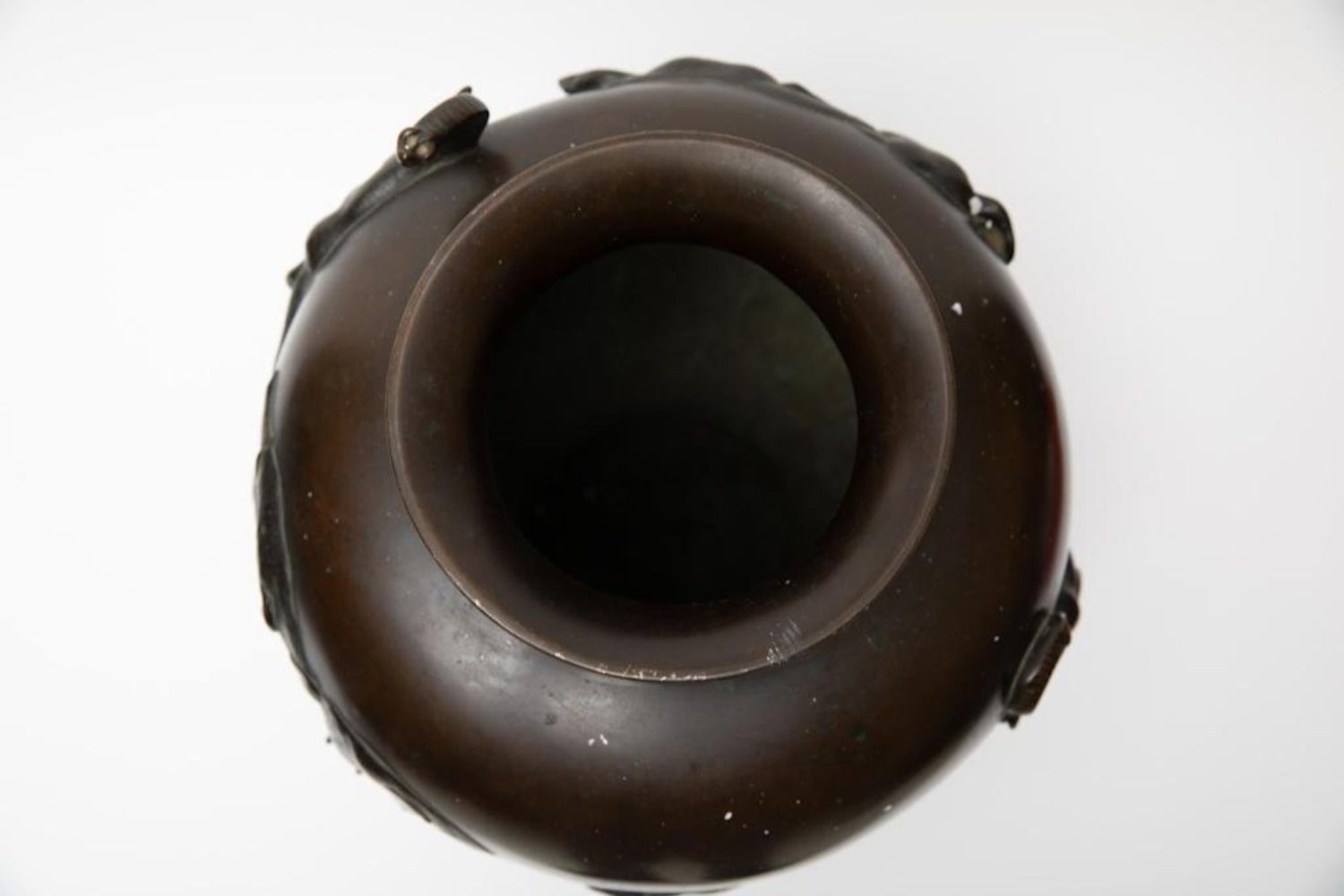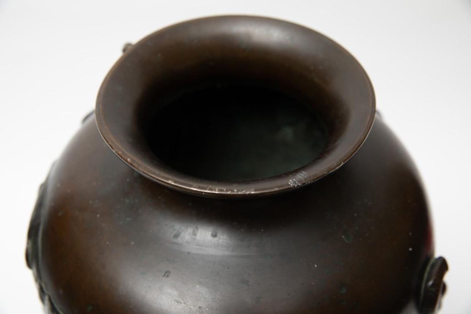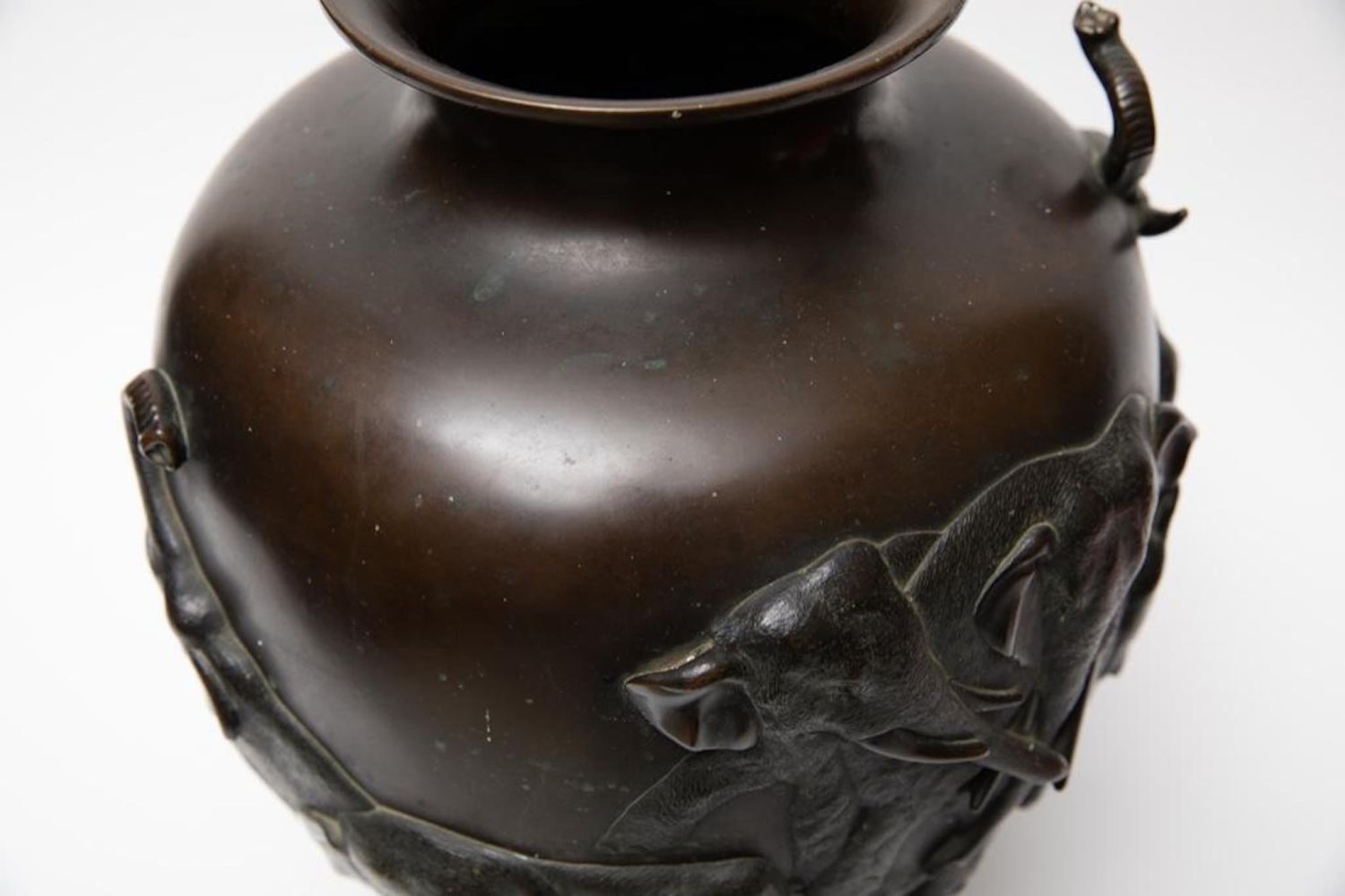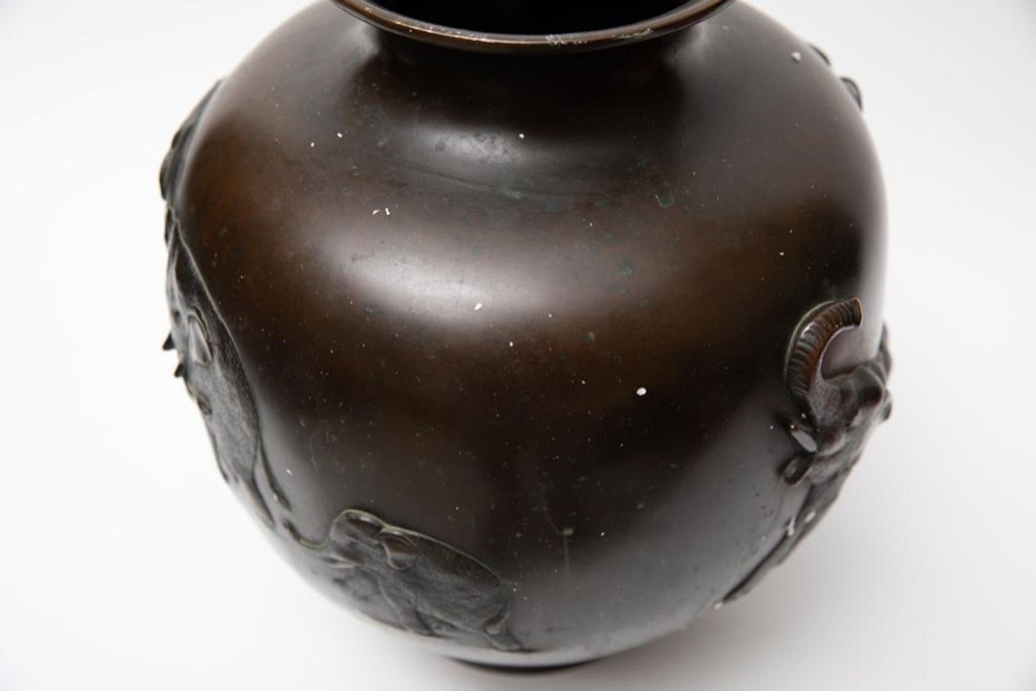 very cool…Meiji Japanese bronze baluster jar with elephant motif. Cast in relief with continuous frieze of elephants, the base with six-character maker marks. Approximate height: 15 1/4"H x 13"D overall good condition