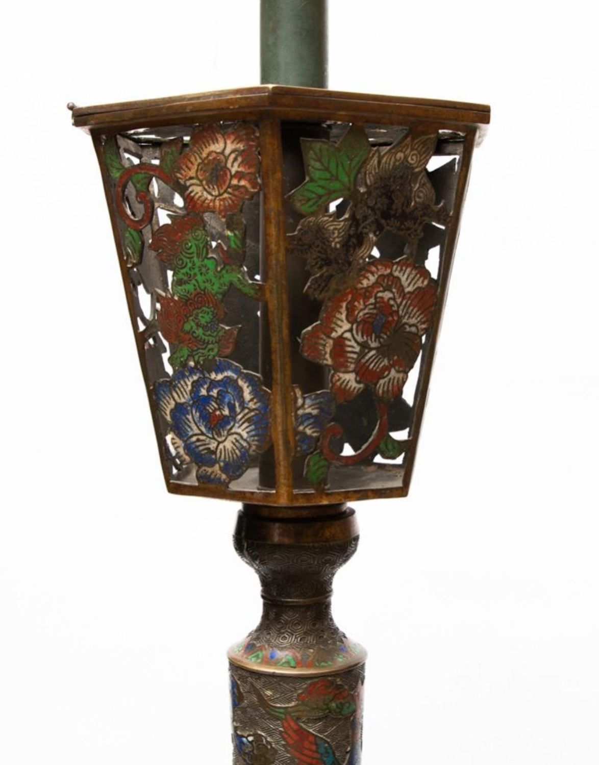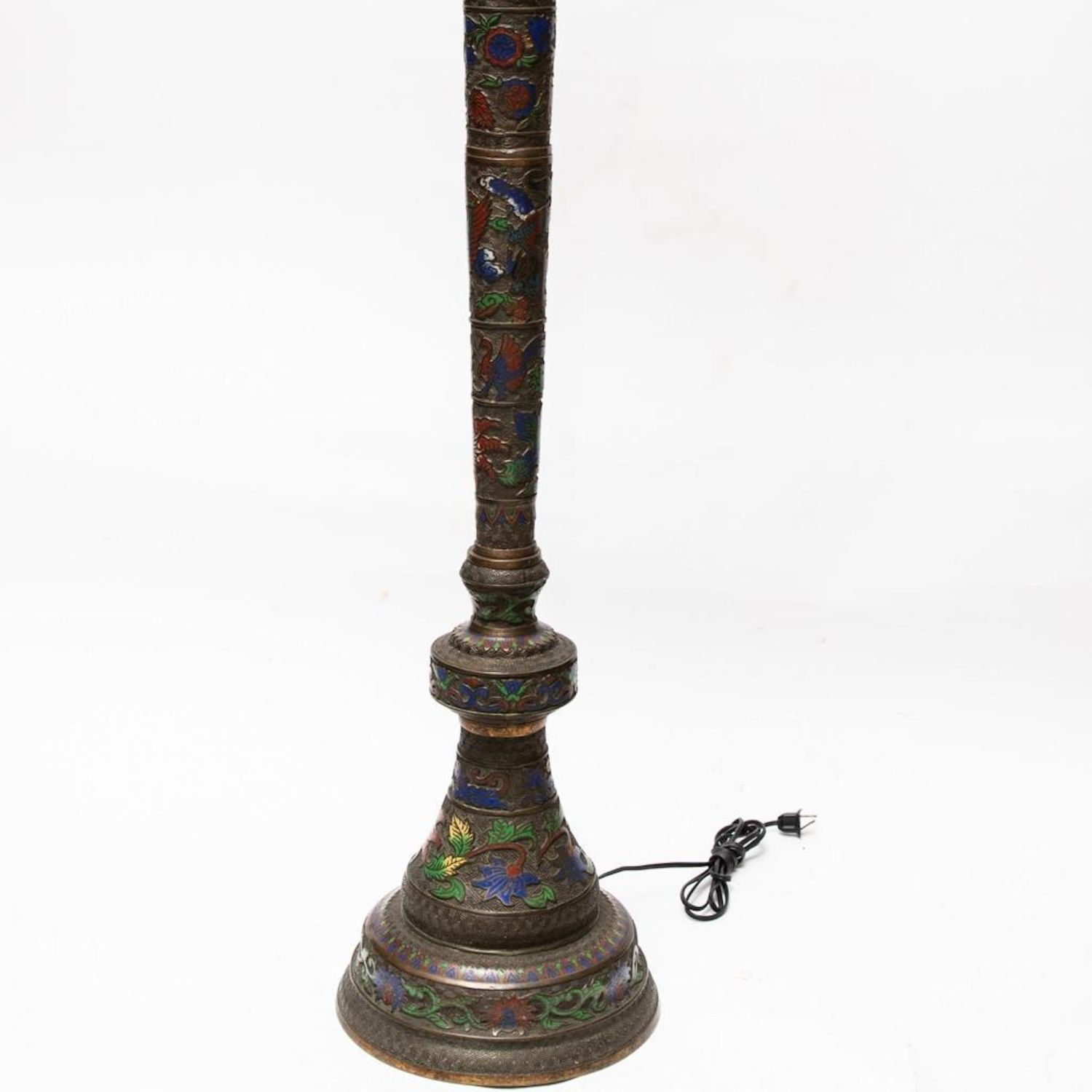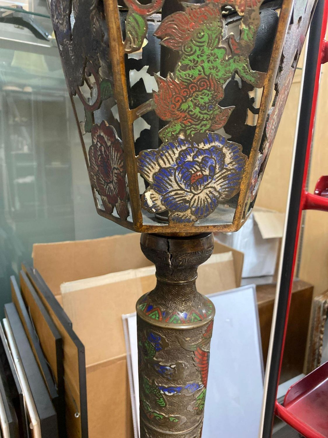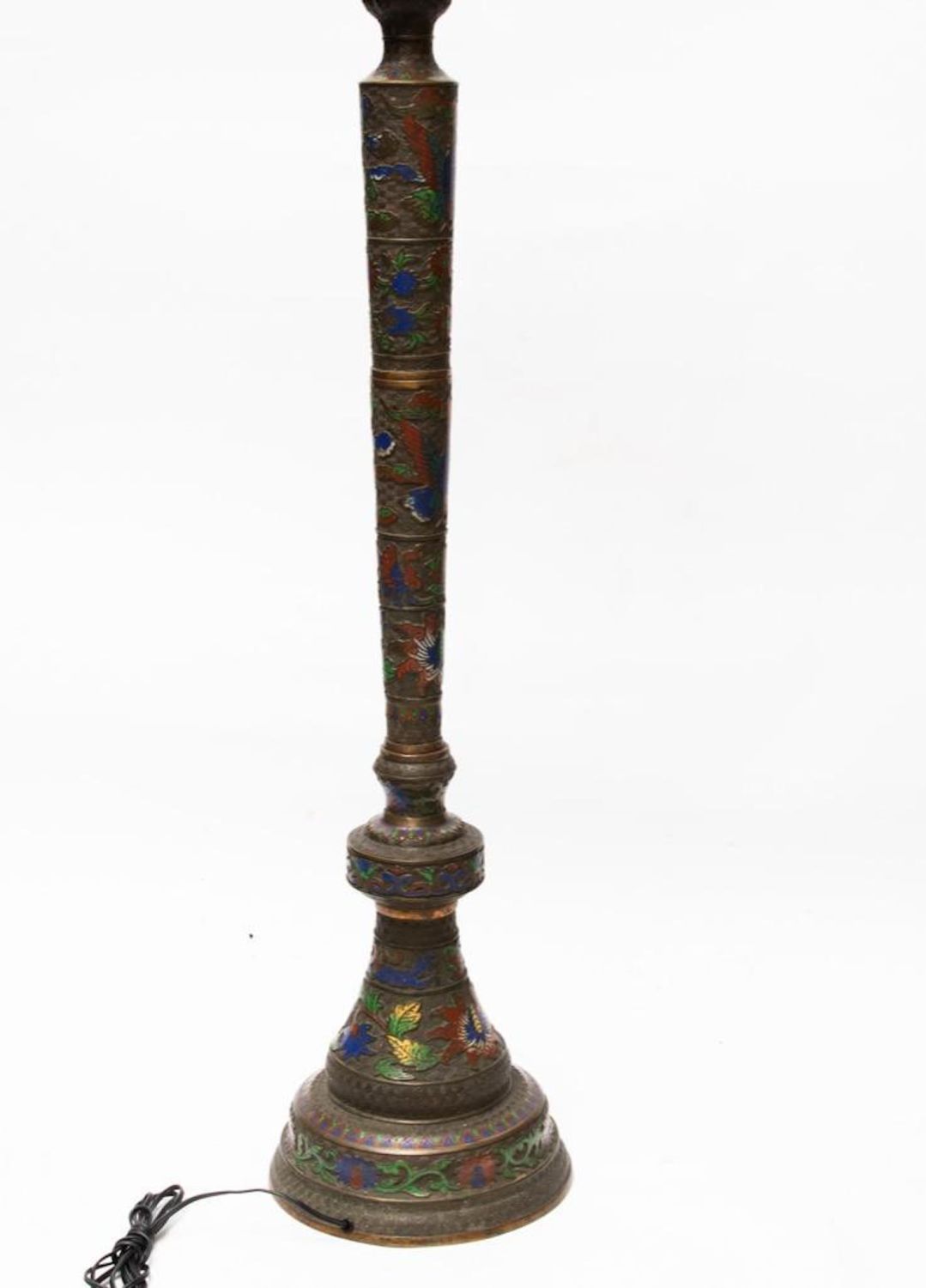 Asian Chinese Cloisonne floor lamp. Circa 1940. 60 3/4" h x 10 3/4" diameter. Good condition overall but there is a crack in the metal. Please refer to photos. It does not move and it is not loose.