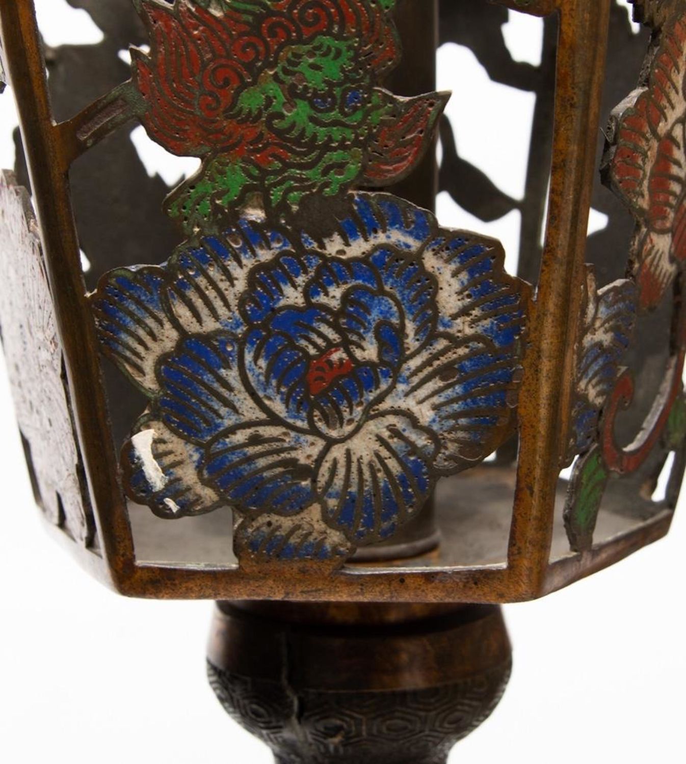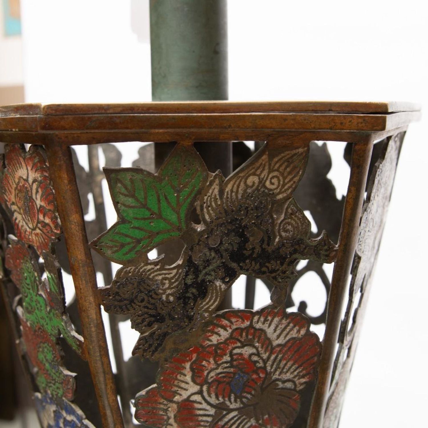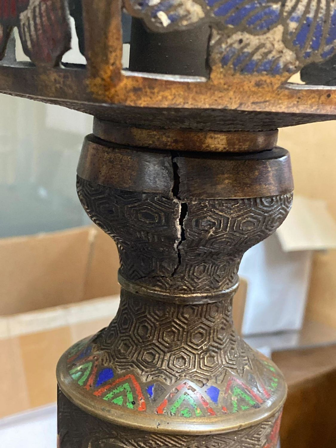Asian Chinese Cloisonne floor lamp. Circa 1940. 60 3/4" h x 10 3/4" diameter. Good condition overall but there is a crack in the metal. Please refer to photos. It does not move and it is not loose.
