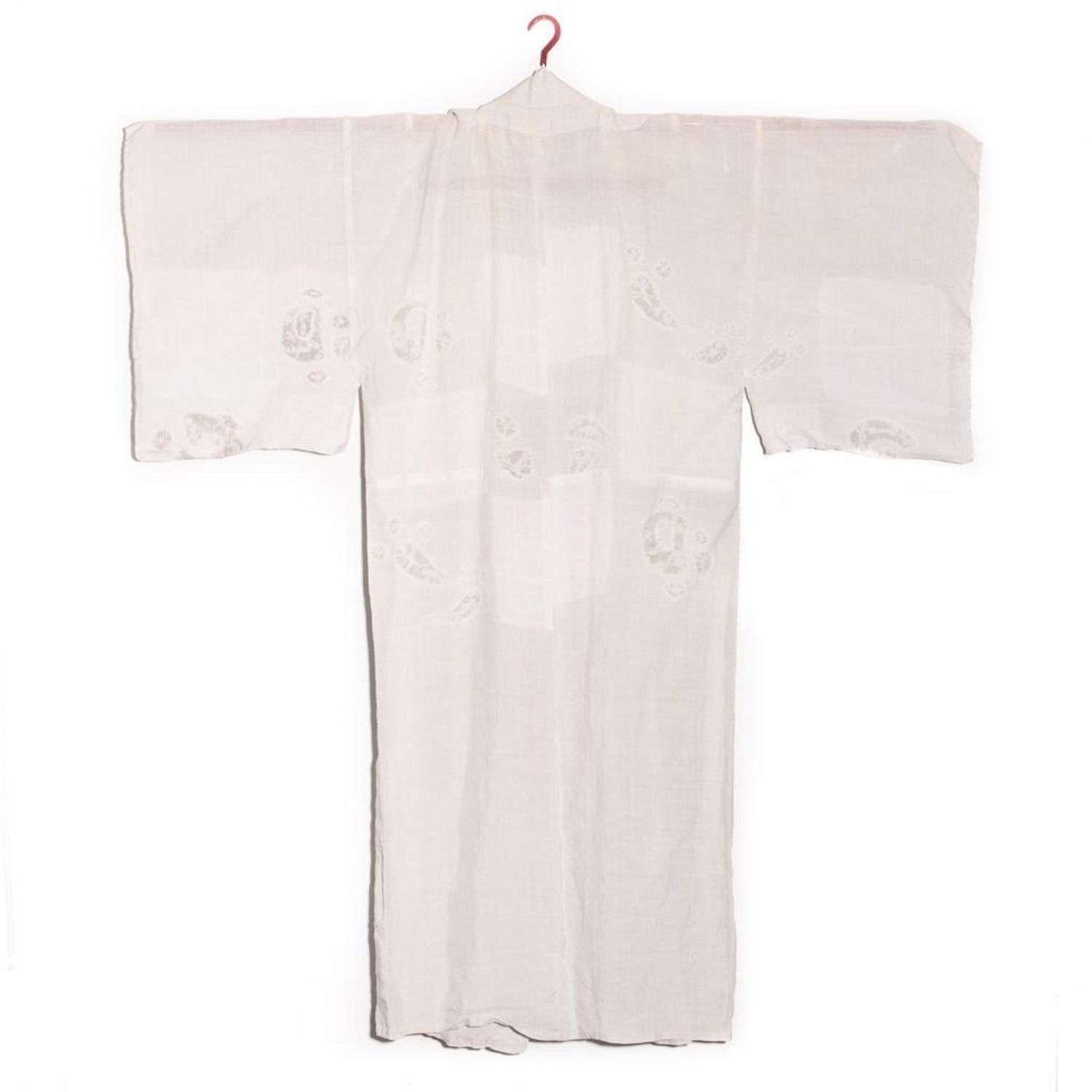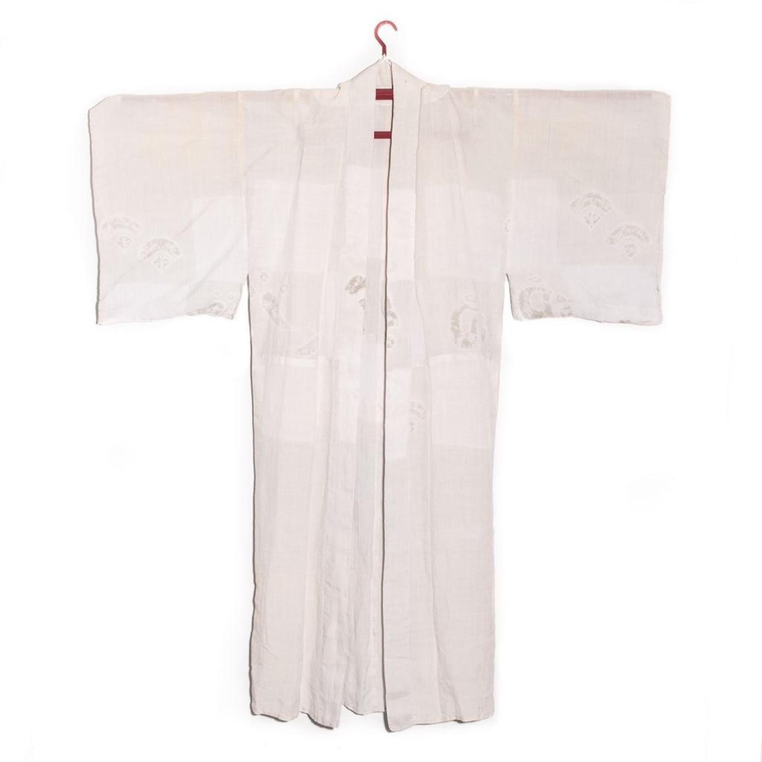 japanese meiji men’s 19th century antique Japanese handwoven hemp kimono, hand decorated with Shibori dyed design. This off-white kimono features an Ichimatsu pattern throughout with geometric accents has 1/4 inch hole in by neck area 49" sleeve spand and 55" length overall good condition