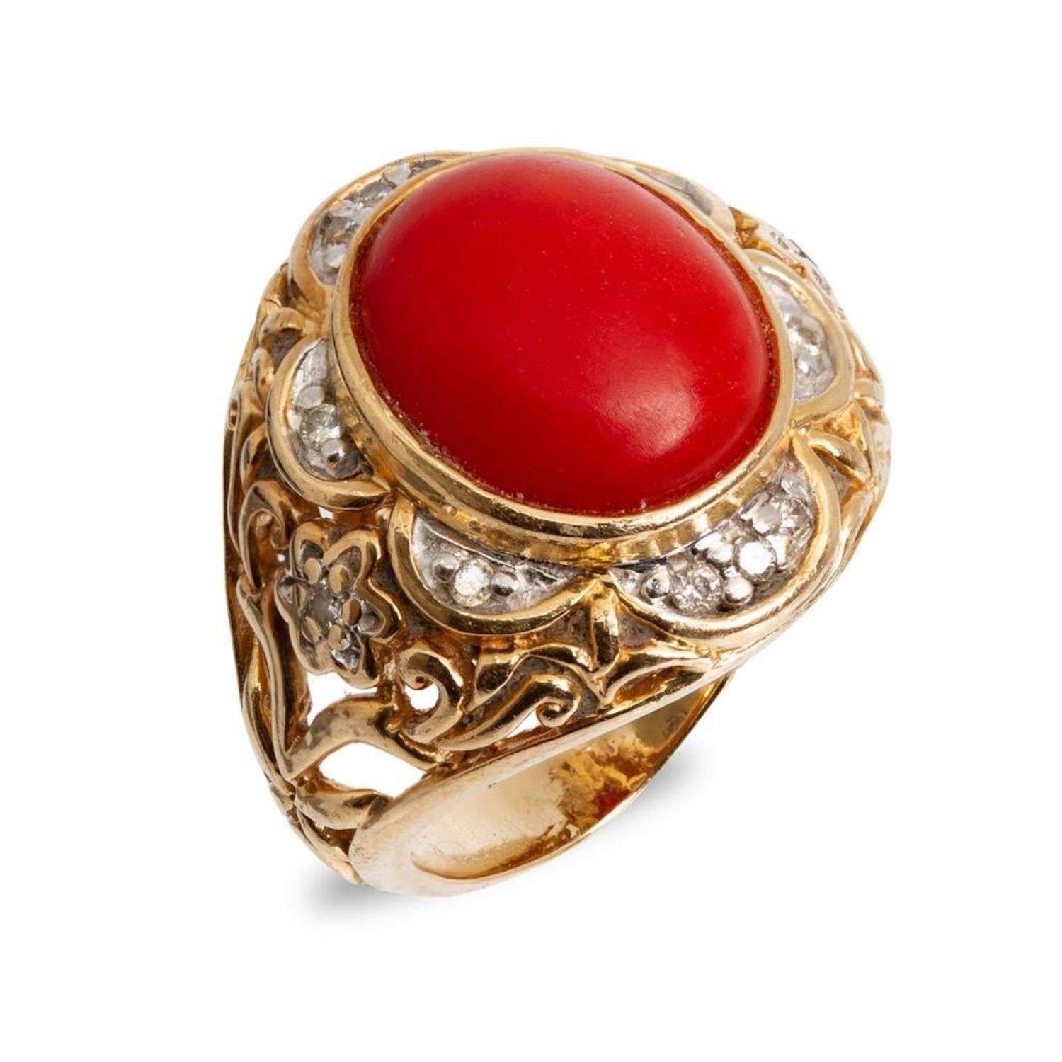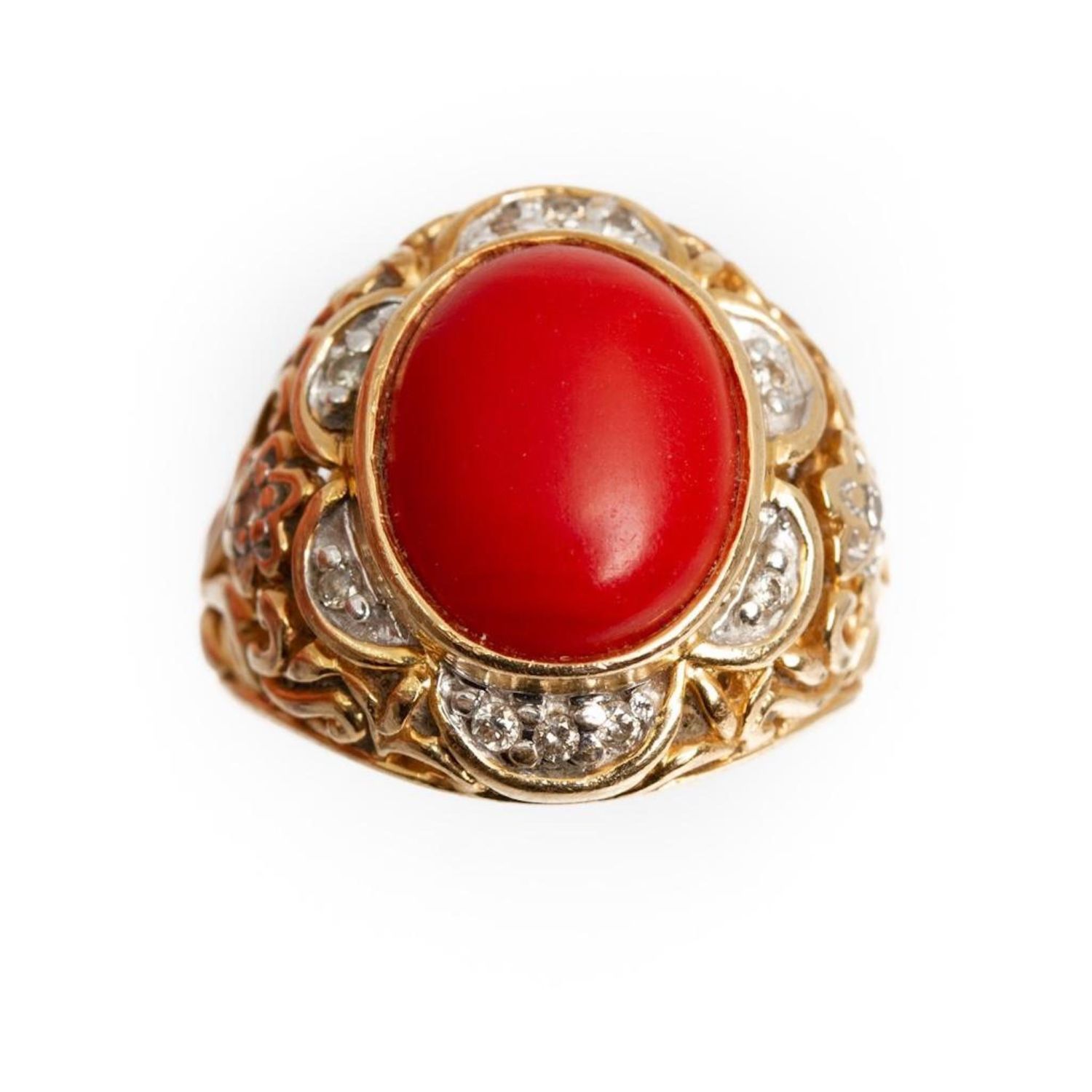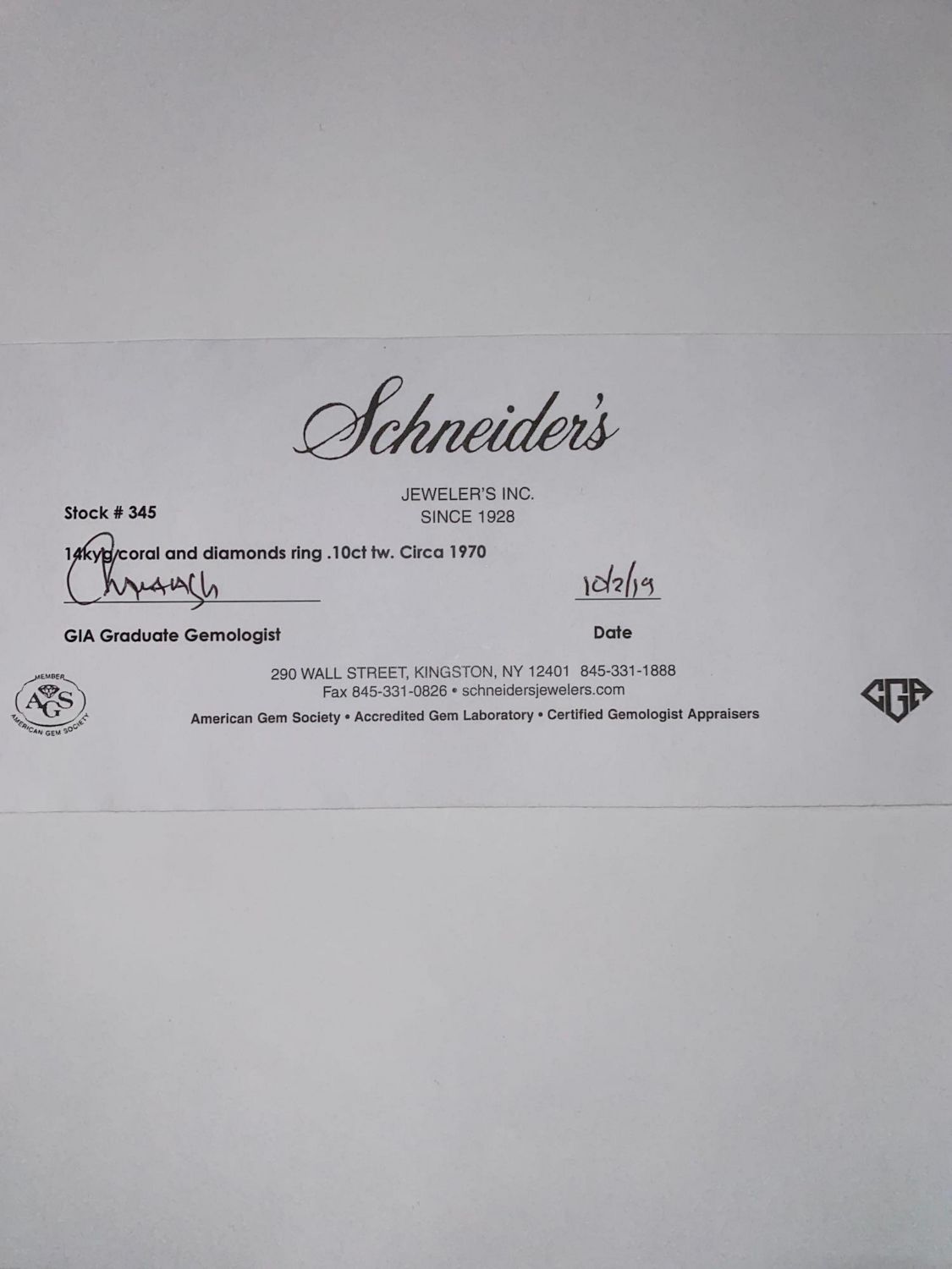 14k gold coral and diamond ring. Size 4.75 and weighs 5dwt. Makers hallmarks circa 1950 maker nh. This lot is accompanied by a GIA appraiser letter from an independent and well respected firm established over 75 years ago.overall good condition