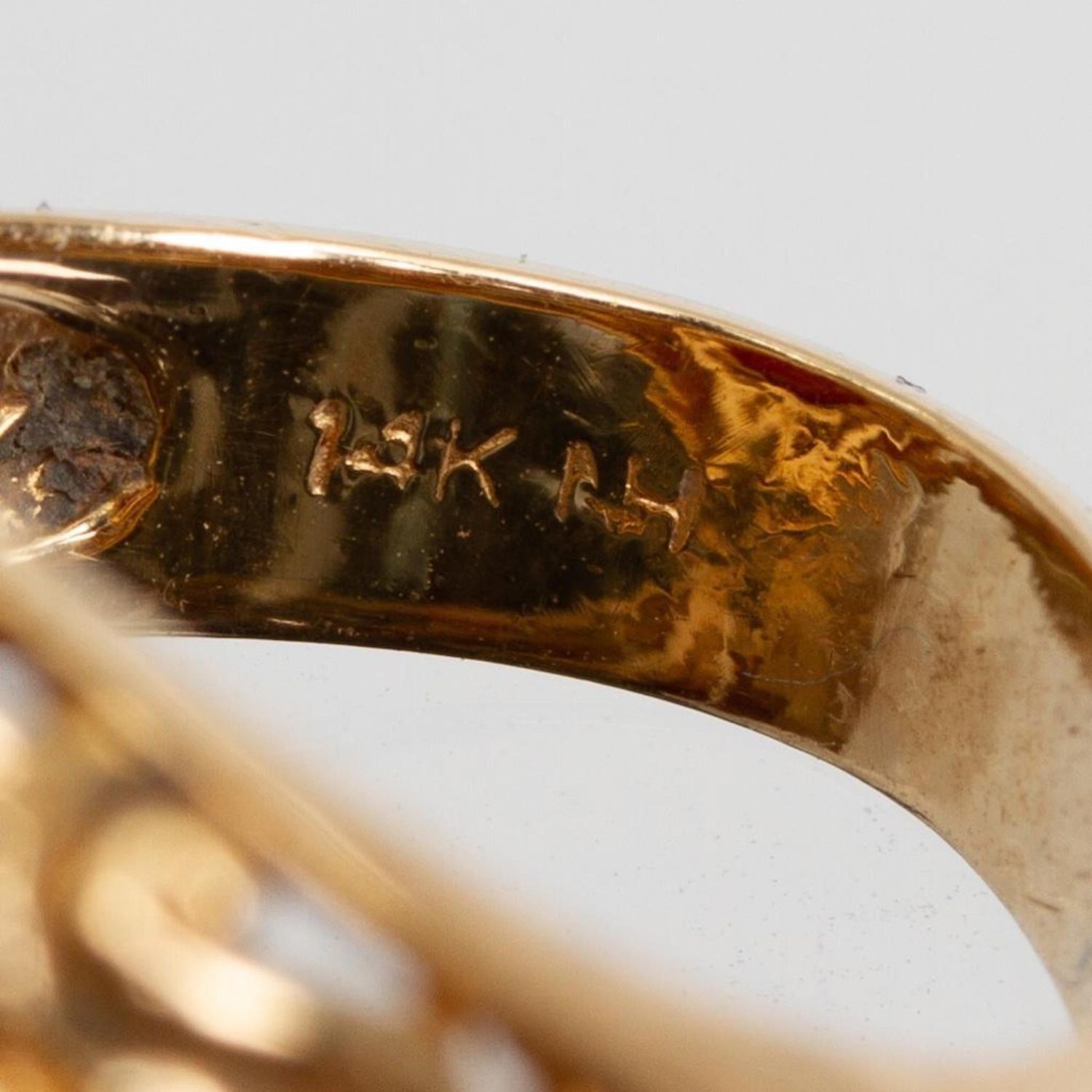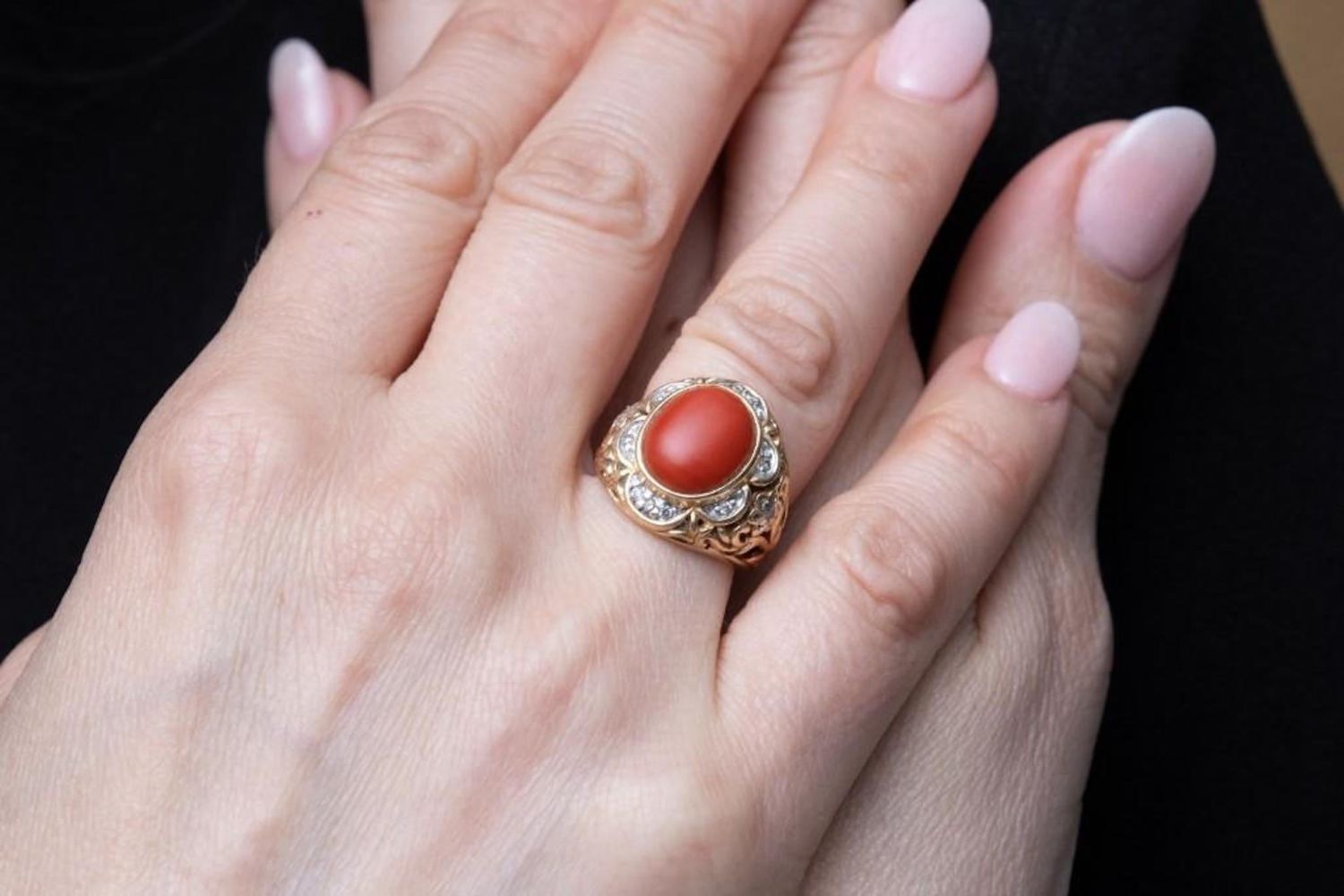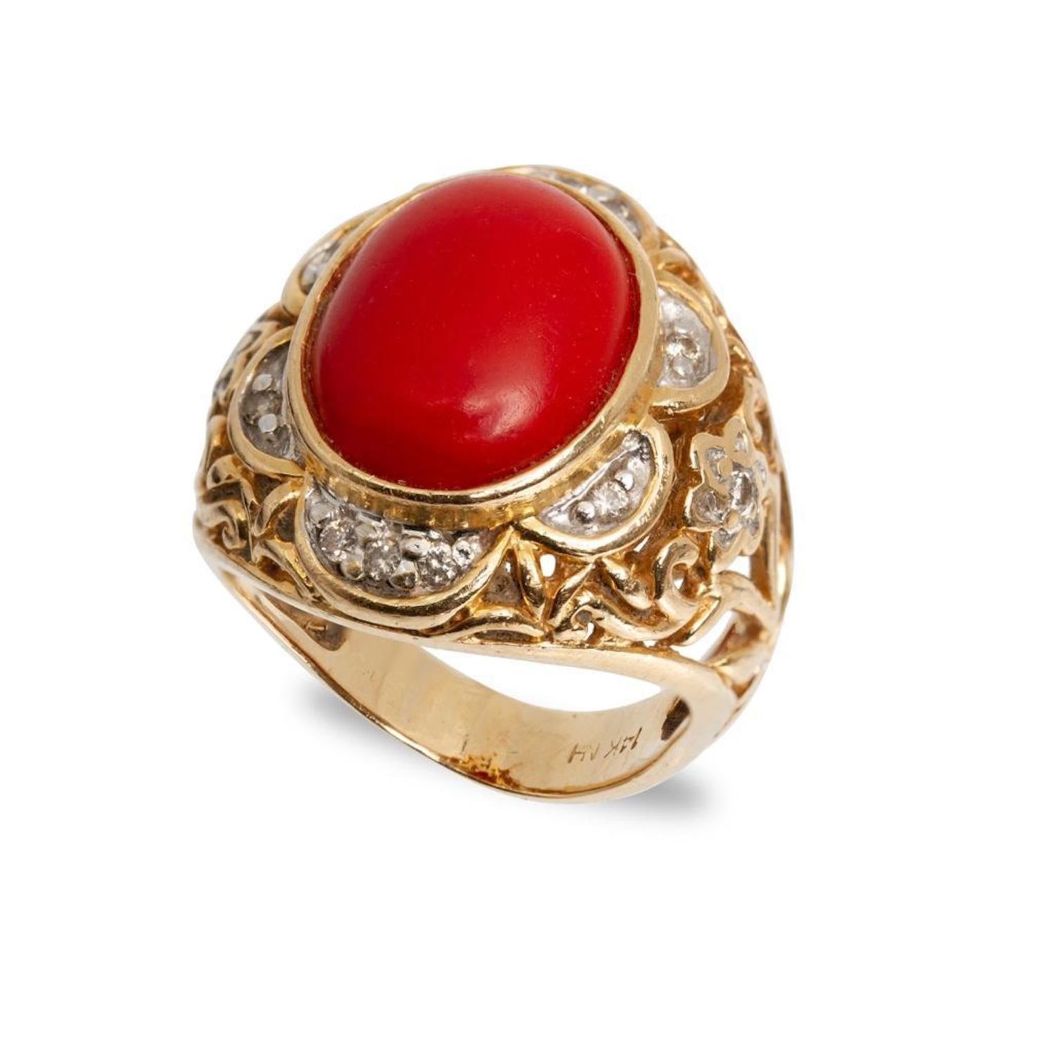 14k gold coral and diamond ring. Size 4.75 and weighs 5dwt. Makers hallmarks circa 1950 maker nh. This lot is accompanied by a GIA appraiser letter from an independent and well respected firm established over 75 years ago.overall good condition