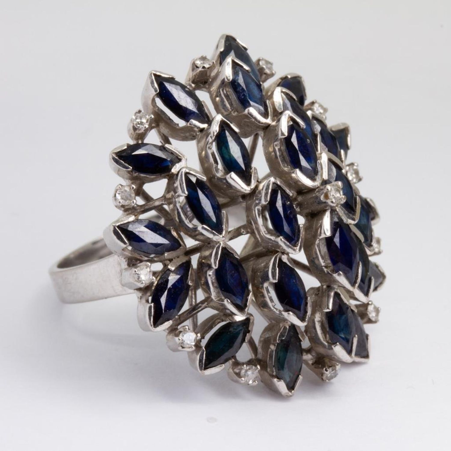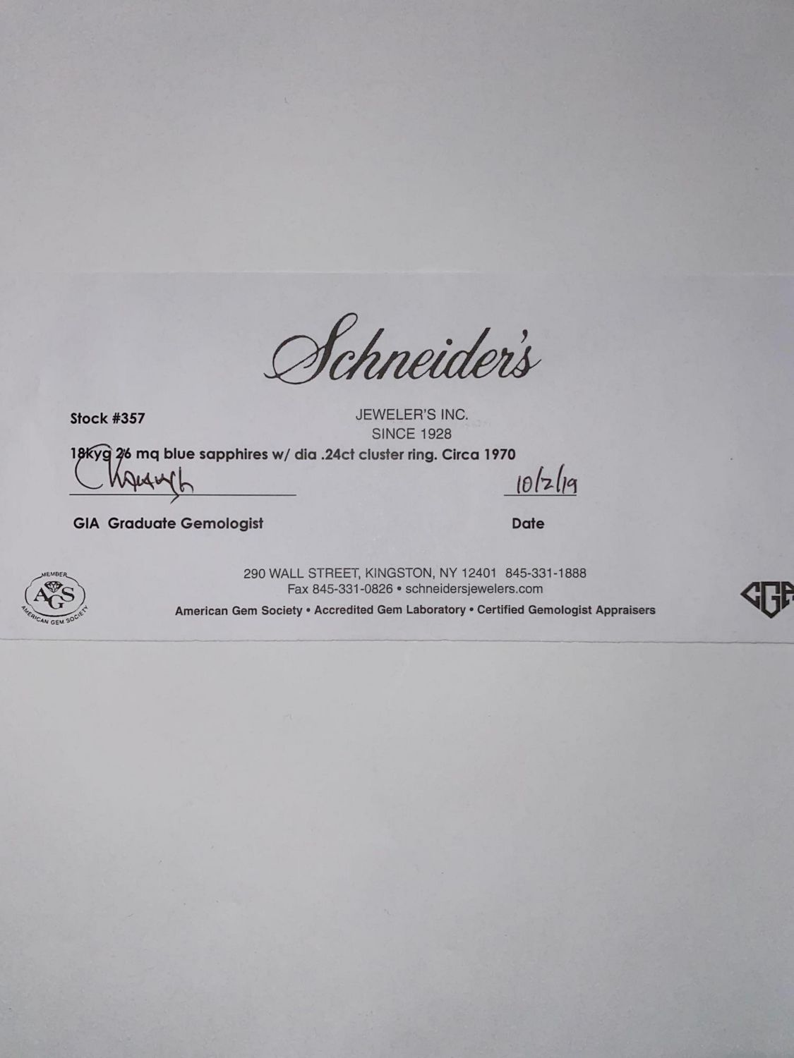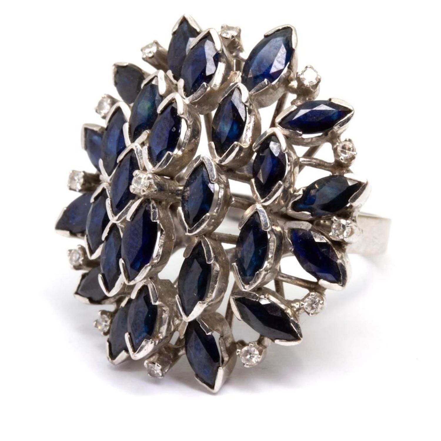 18k white gold and sapphire and diamond (13) cluster ring s8. Weighs 8.2dwt This lot is accompanied by a GIA appraiser letter from an independent and well respected firm established over 75 years ago. overall good condition