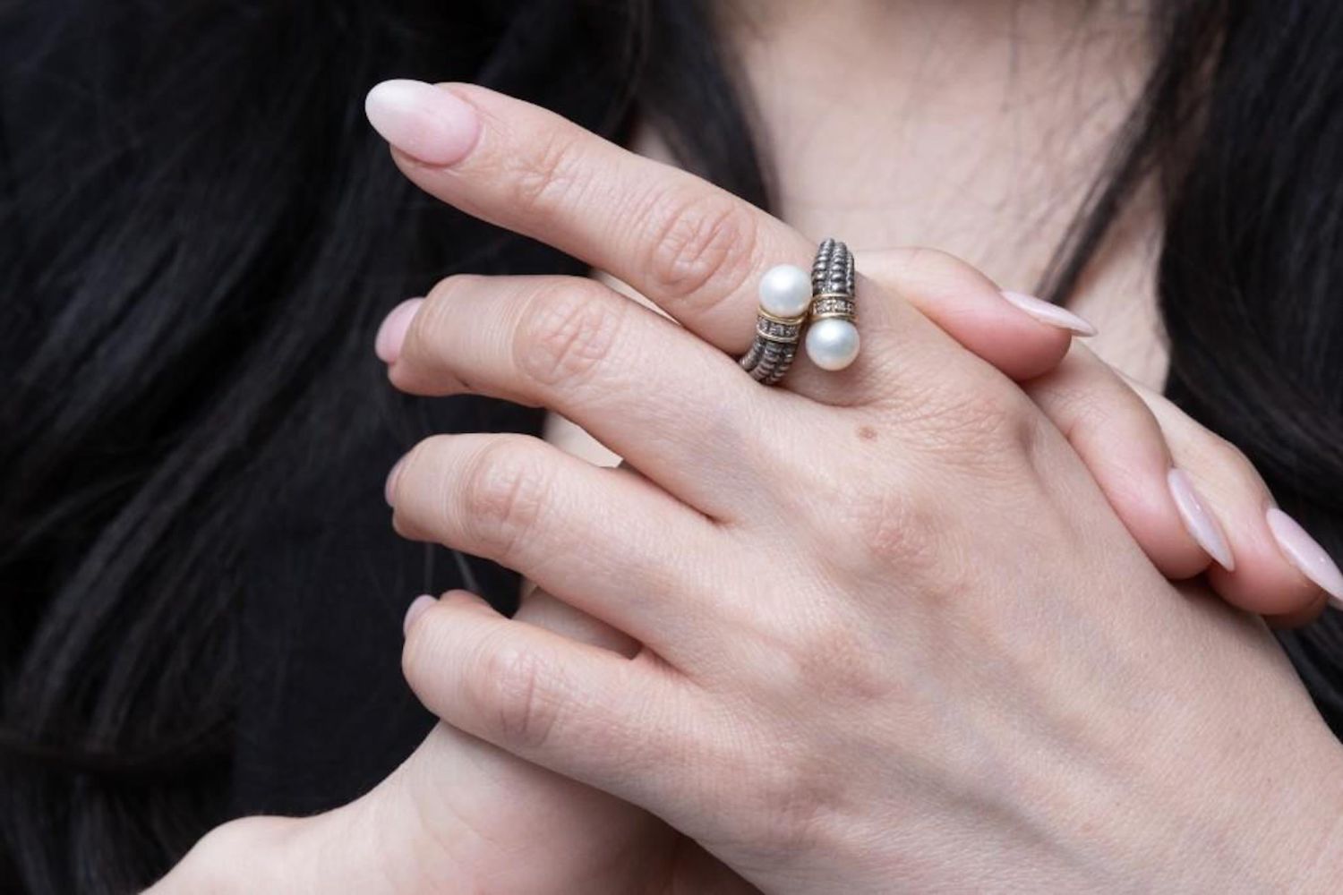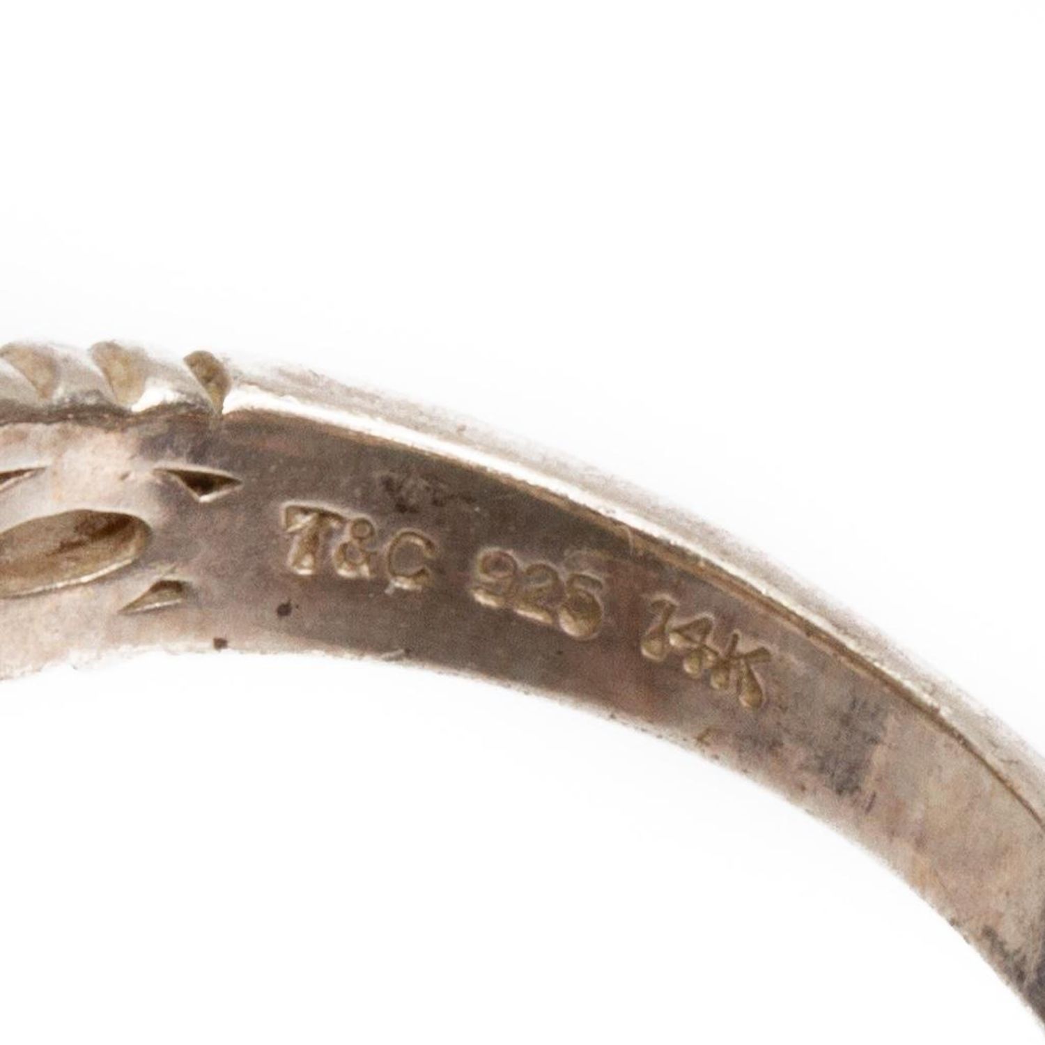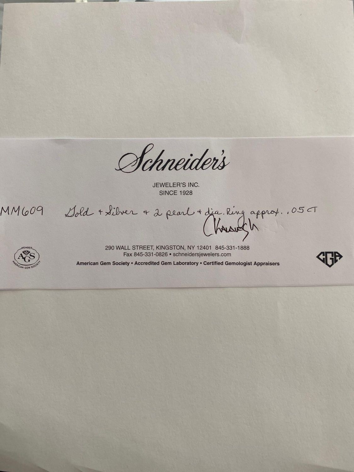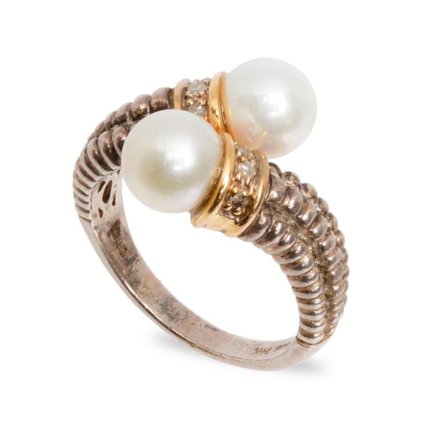 14k gold, sterling silver, pearl and diamond bypass ring maker mark T & C circa 2000. Weighs 3.9 DWT. Size 6.75 overall good condition