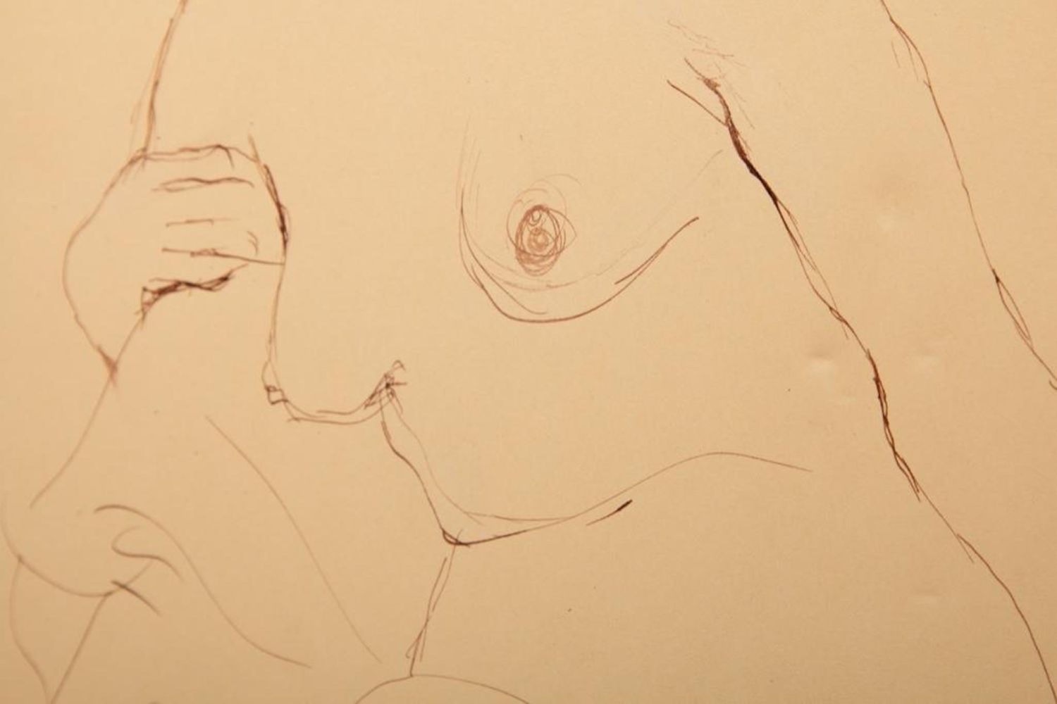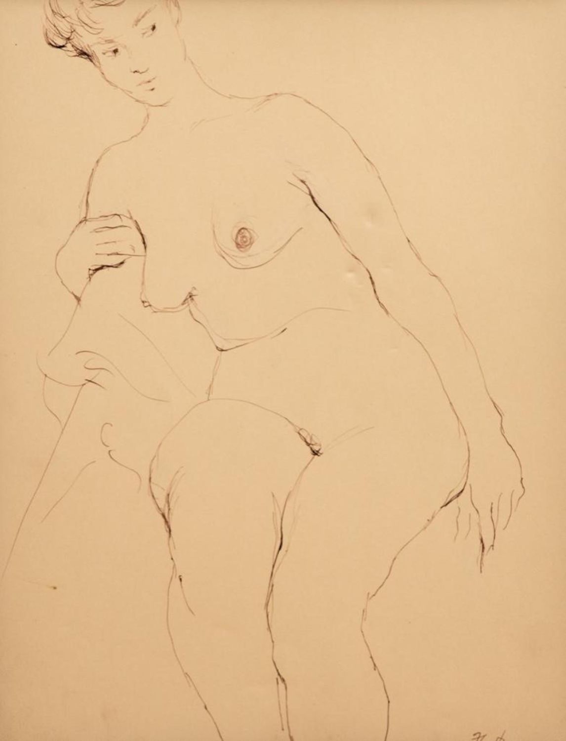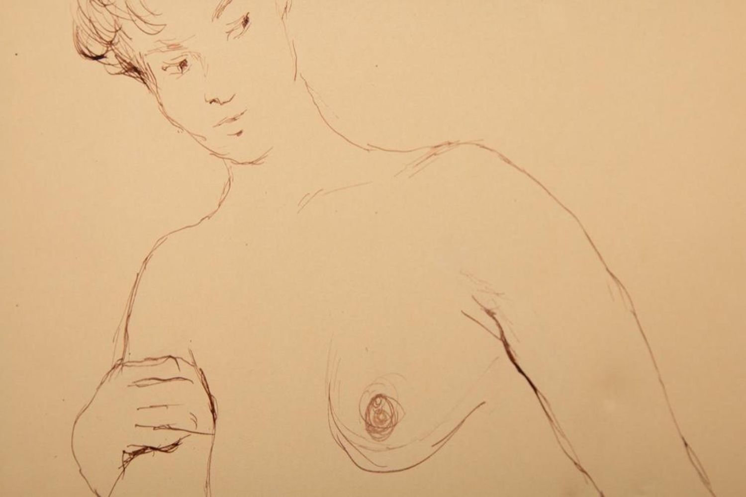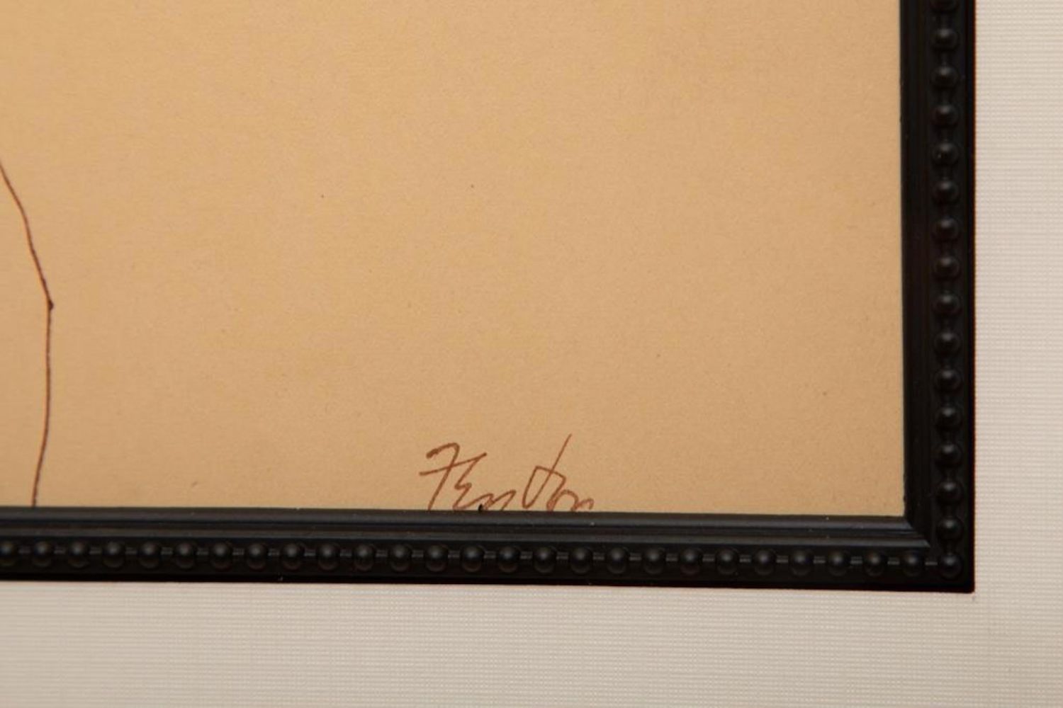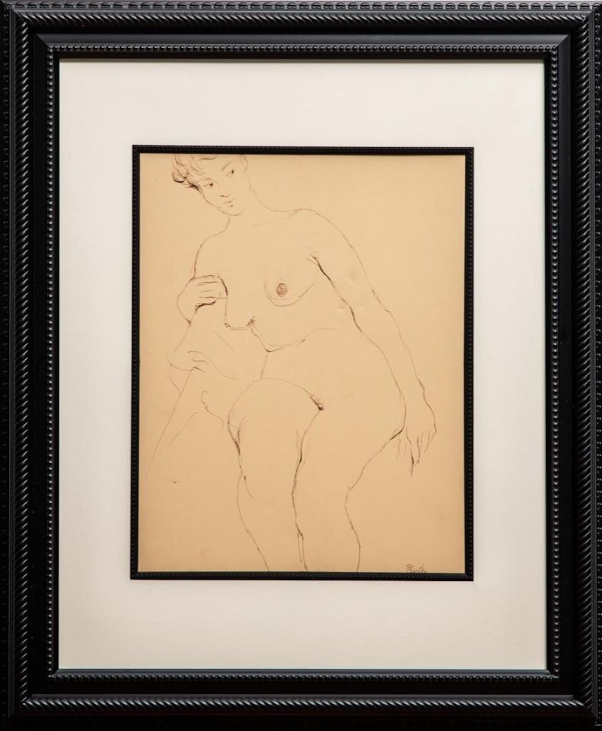 John Fenton known as the American Surrealist , signed Drawing on Paper of Nude Woman Sitting. 19 3/8" x 23 3/8" Framed: 10 3/8" x 13 3/8" Visible Approx. Painter, printmaker and teacher John Fenton was born in Mountaindale, New York. He moved with his family to Mount Vernon, New York, where he lived for some thirty years before settling permanently in Woodstock, New York. He attended The Art Student’s League of New York and Atelier 17, Paris. His work was the focus of a number of one-man shows during the 1950s and 1960s, and was exhibited in numerous museums and galleries including the Art Institute of Chicago, The Museum of Modern Art in New York, The Corcoran Gallery in Washington, D.C. And the Pennsylvania Academy.Fenton taught at New York University and Goddard College. His distinctly surrealist work won awards from the American Academy of Arts and Letters, the National Academy of Design, and numerous other institutions, and is included in the collections of the Smithsonian American Art Museum, the Corcoran Gallery among others. He died at Woodstock, New York. good condition overall