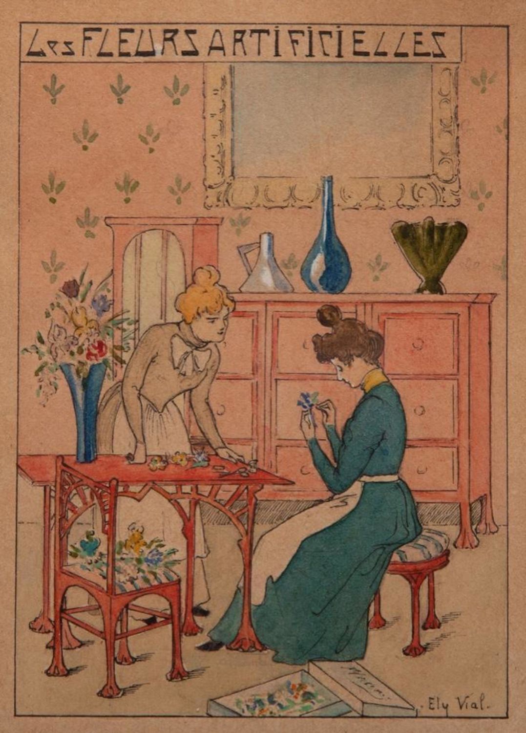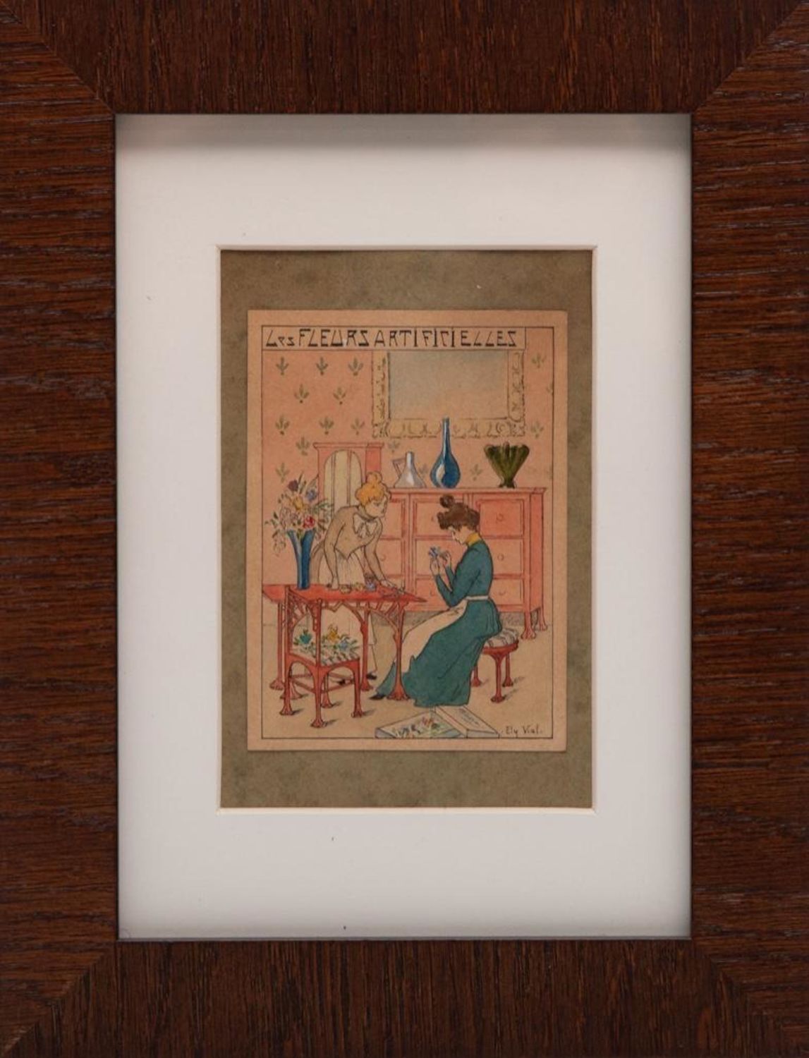 Ely Viali signed miniature gouache carte Circa 1900. Measures 3.5"h x 2 5/8"W Art. Framed Measures 6"W x 8"H