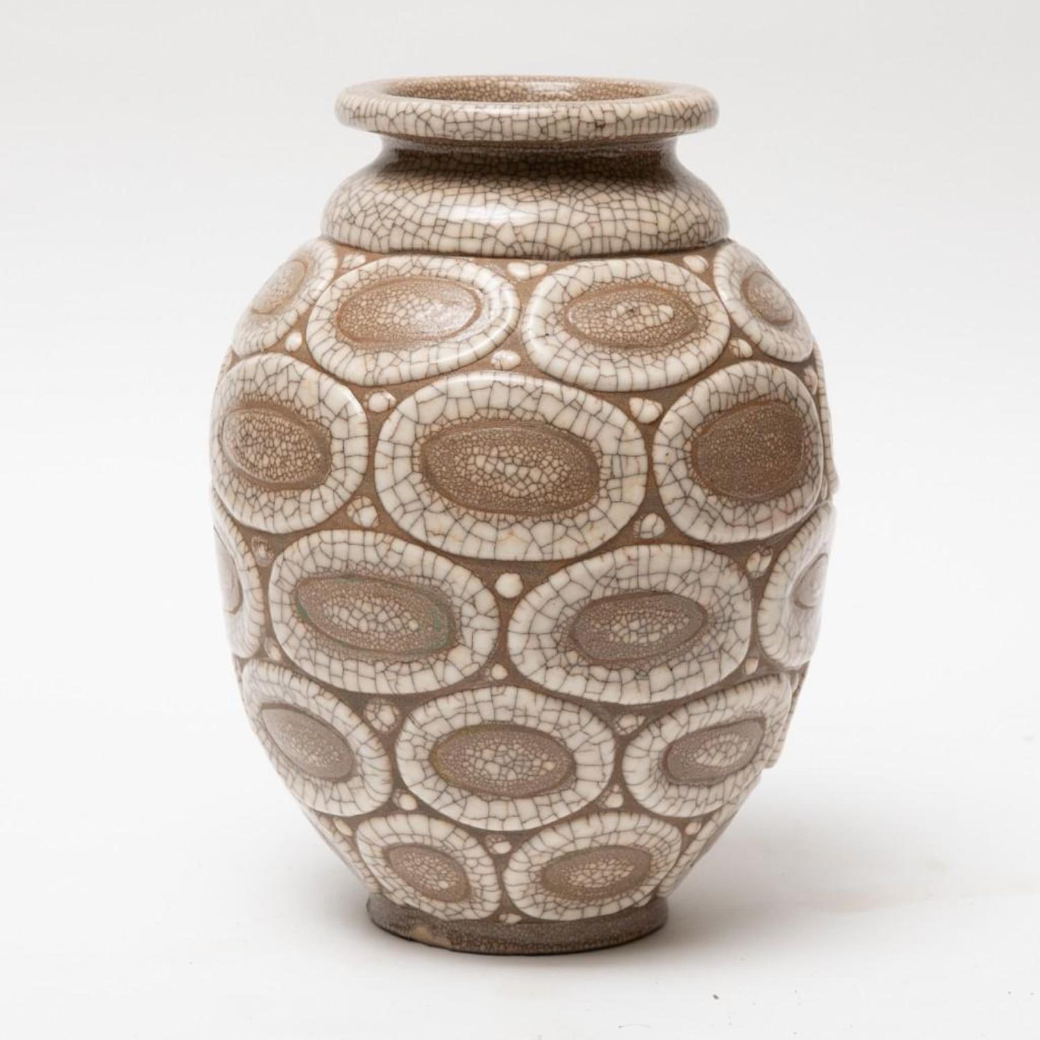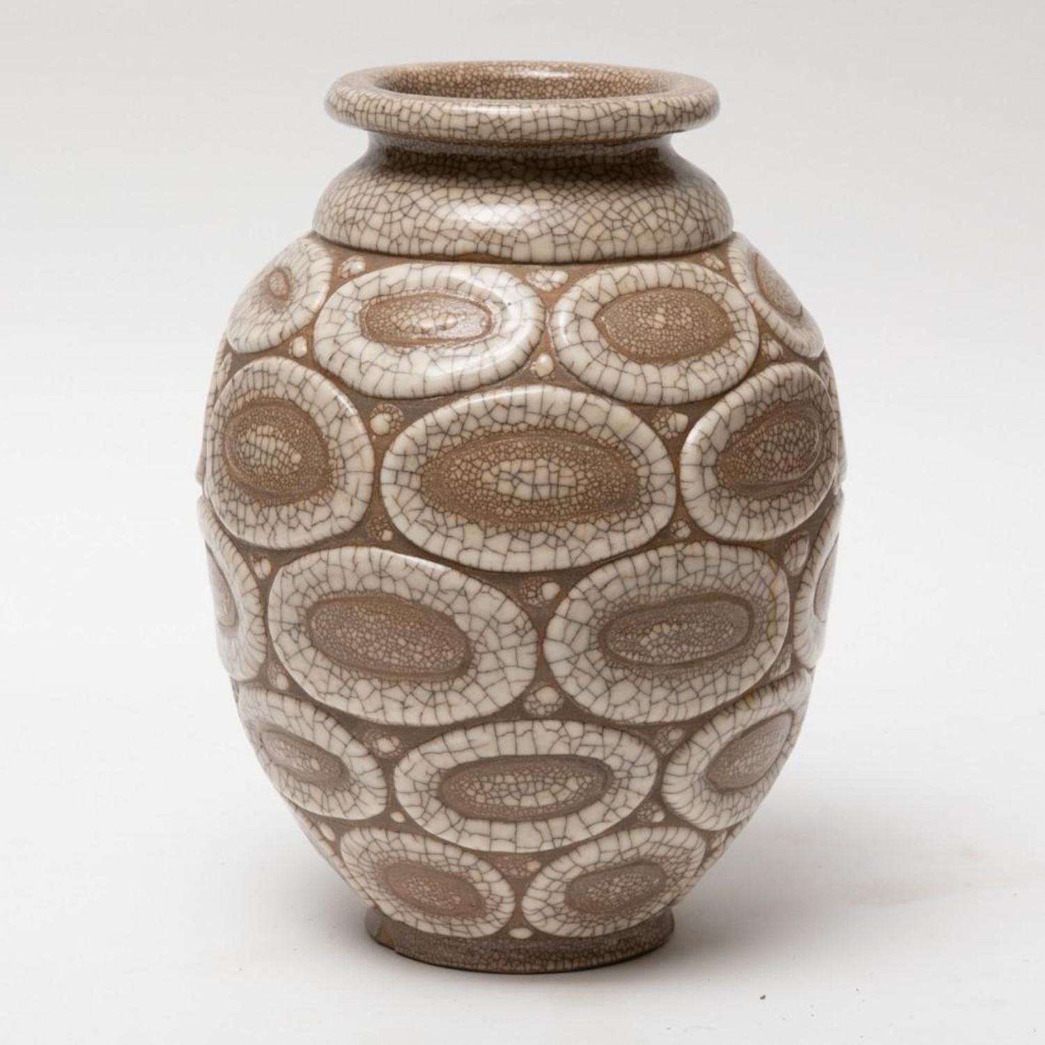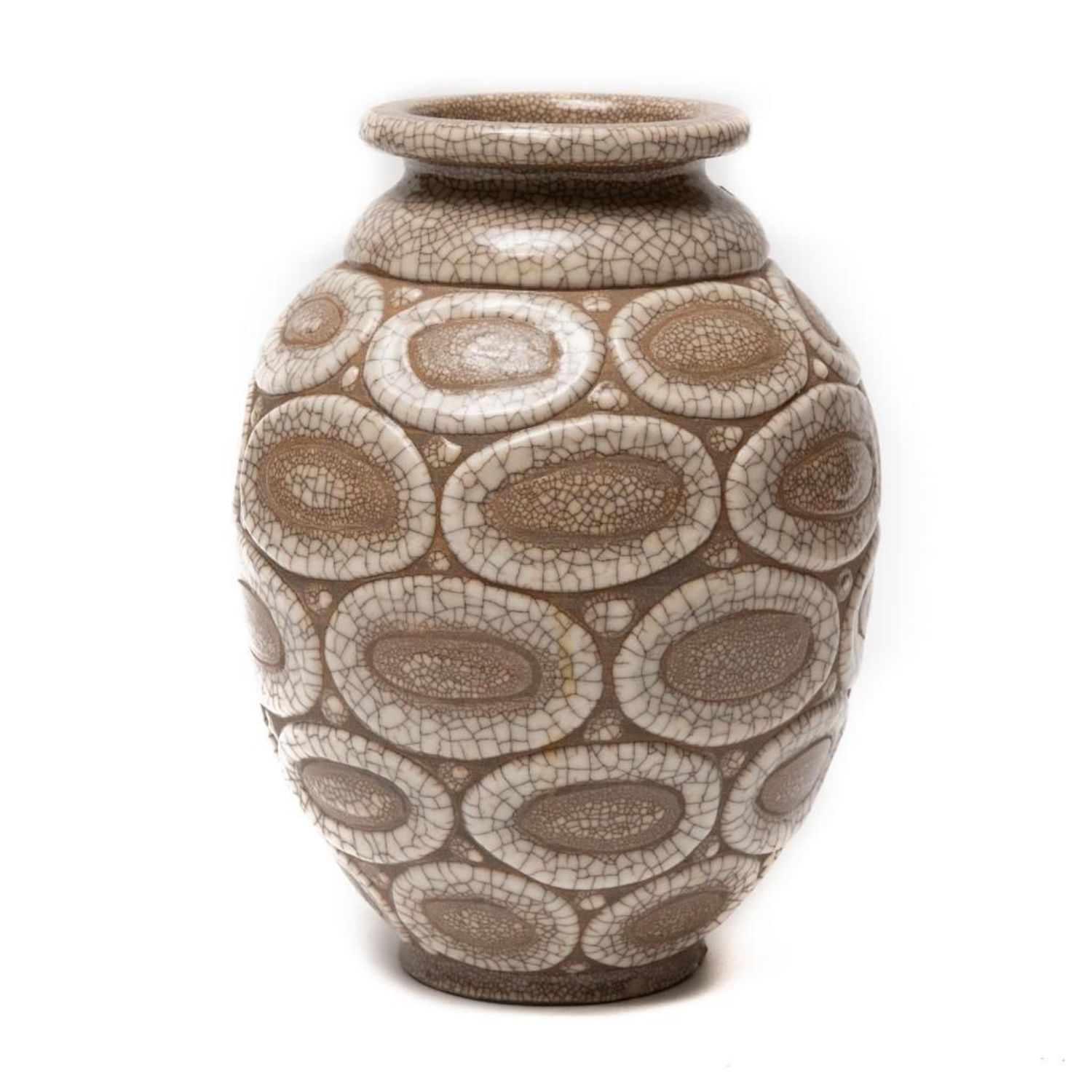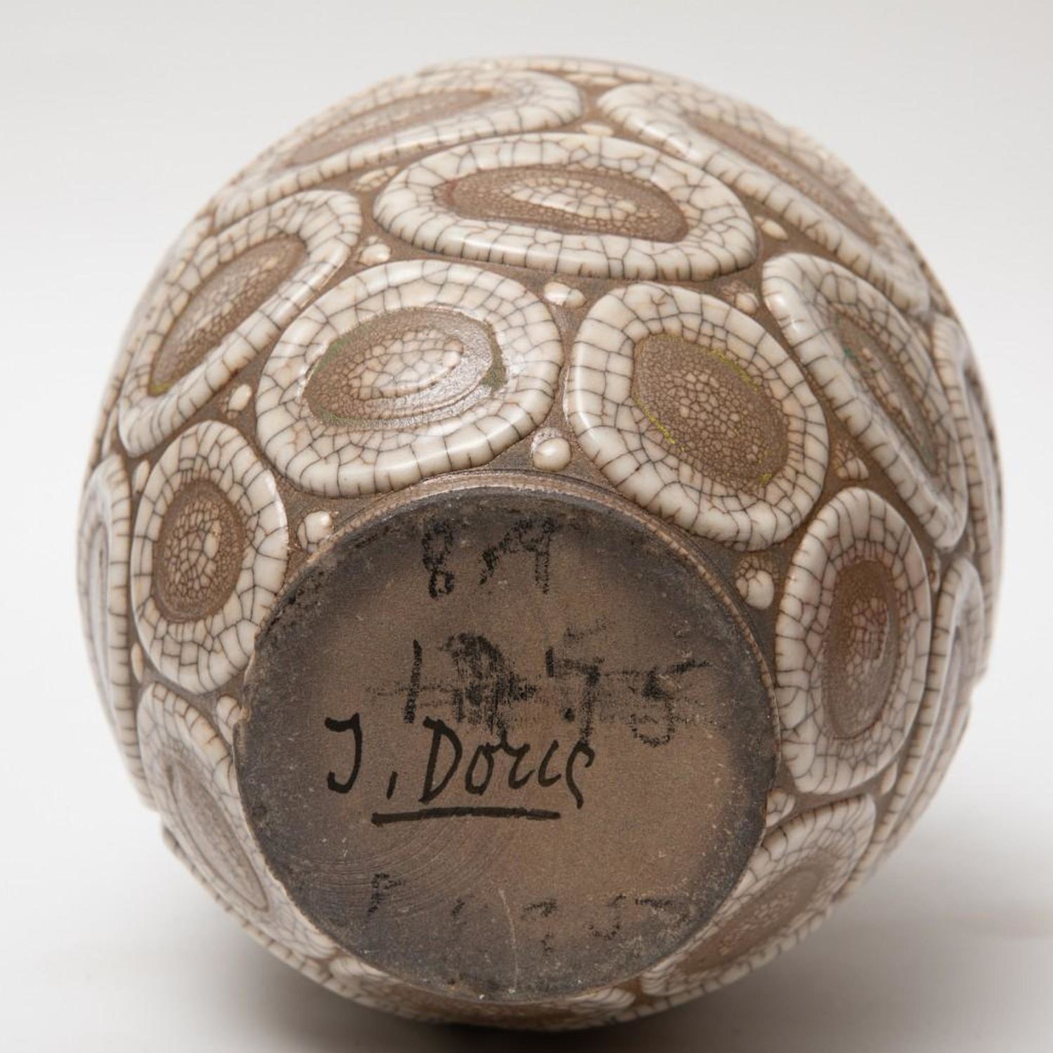 Rene Buthhaud art pottery vase peau-de-serpent (snakeskin) glazed design 10 h × 6¾ dia in Approx. Buthaud was under exclusive contract with a Parisian gallery and therefore signed his private sales works "J. Doris" for the American market. Glazed signature to underside J. Doris
