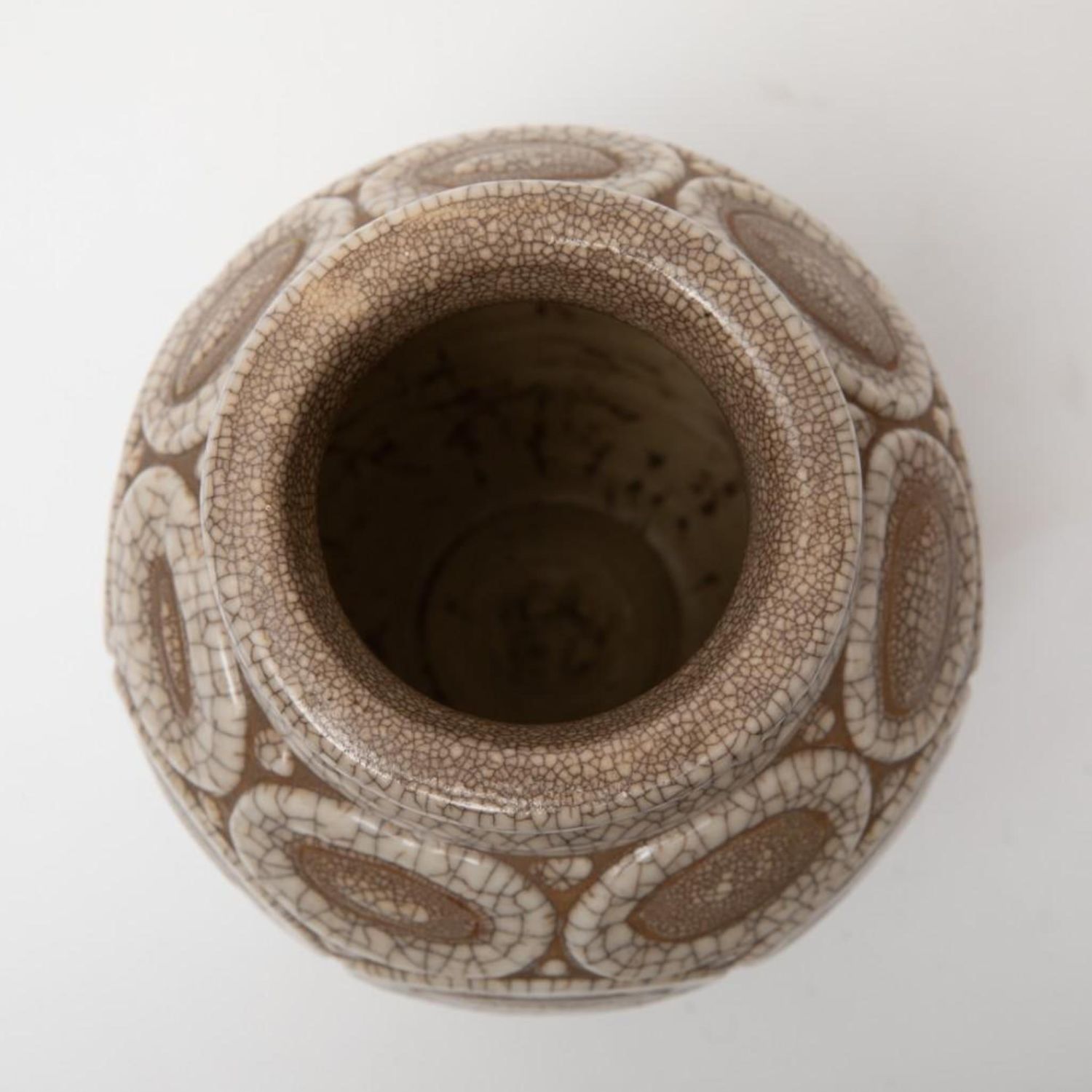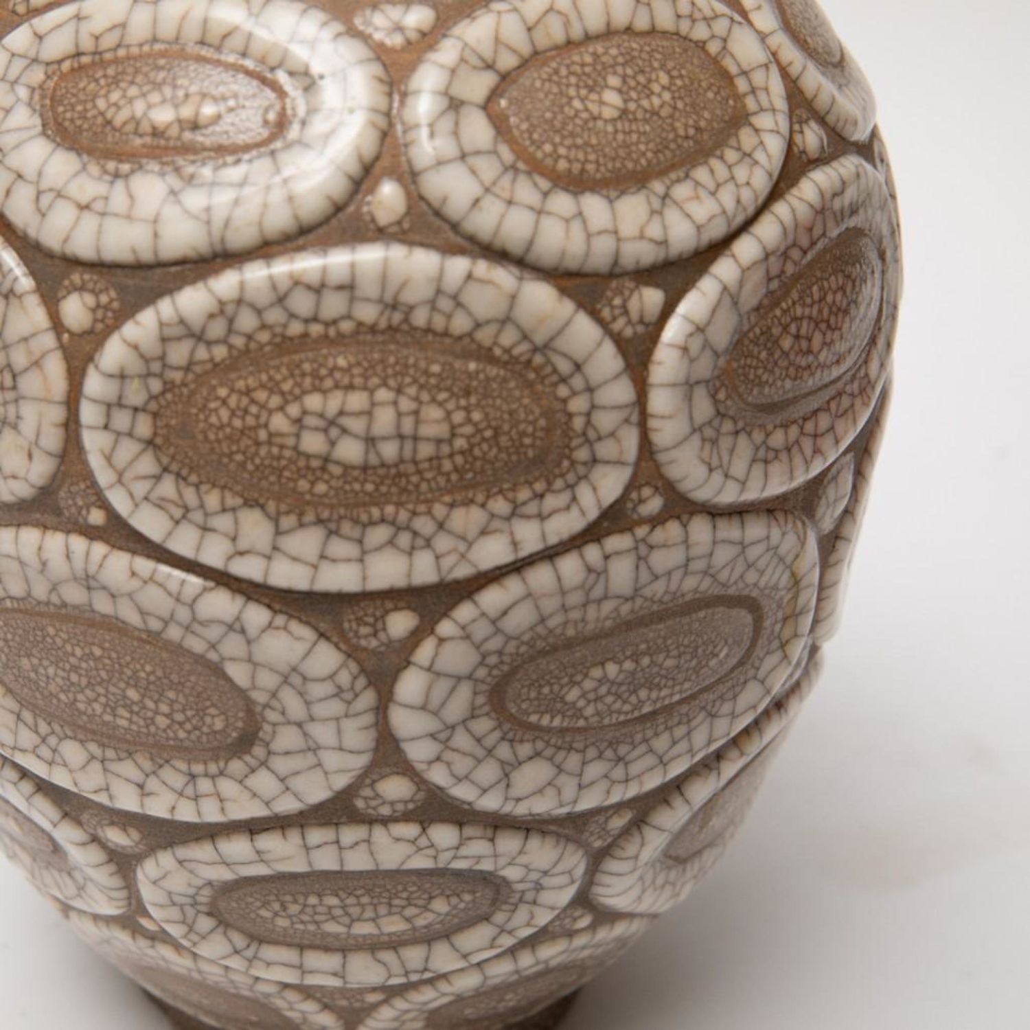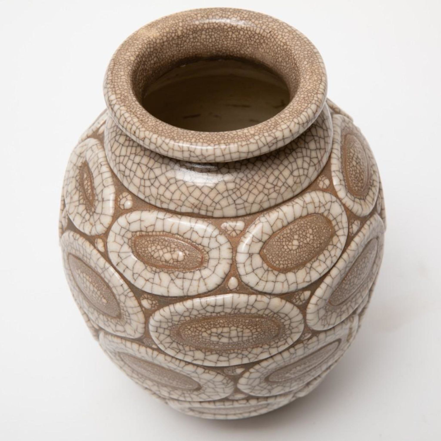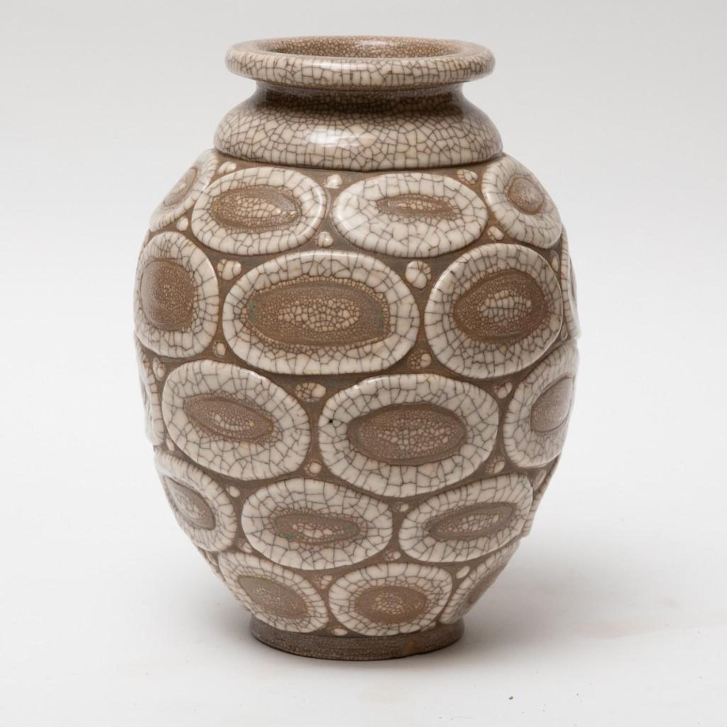 Rene Buthhaud art pottery vase peau-de-serpent (snakeskin) glazed design 10 h × 6¾ dia in Approx. Buthaud was under exclusive contract with a Parisian gallery and therefore signed his private sales works "J. Doris" for the American market. Glazed signature to underside J. Doris