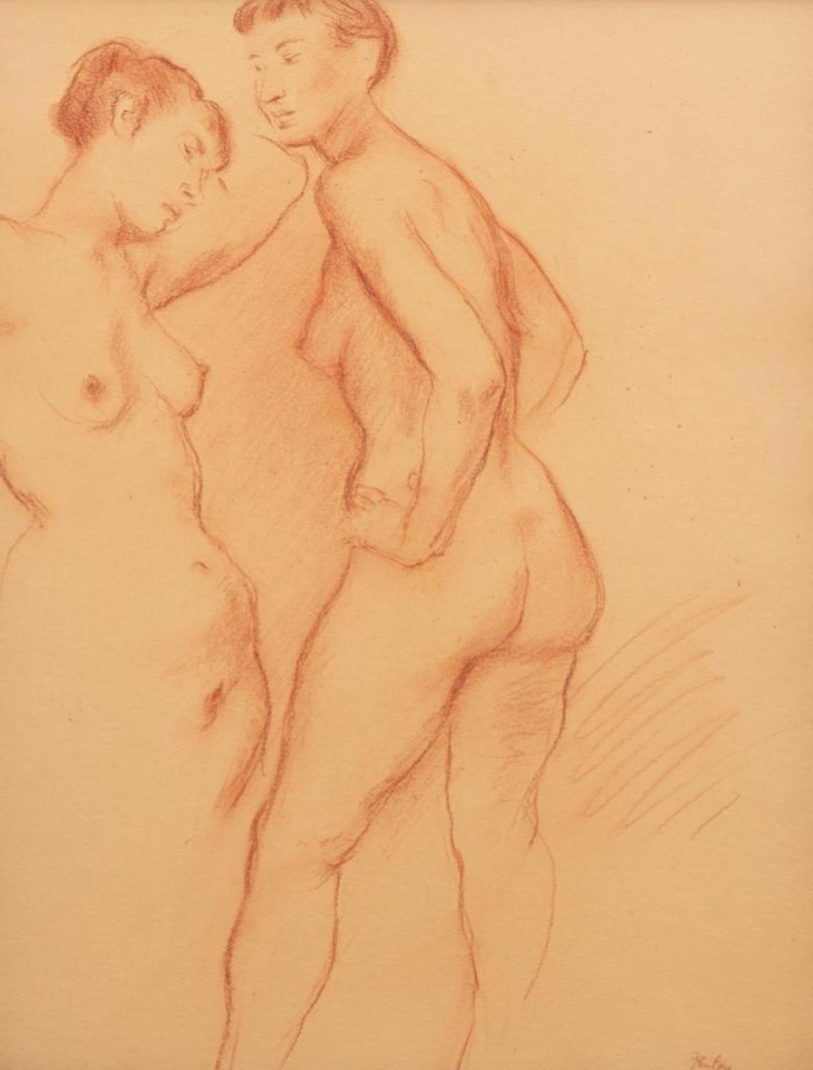 John Fenton drawing of two nude woman. Signed bottom right. Measures 19 3/8" x 23.5": Visible 13 3/8 x 10 3/8" Approx. Painter, printmaker and teacher John Fenton was born in Mountaindale, New York. He moved with his family to Mount Vernon, New York, where he lived for some thirty years before settling permanently in Woodstock, New York. He attended The Art Student’s League of New York and Atelier 17, Paris. His work was the focus of a number of one-man shows during the 1950s and 1960s, and was exhibited in numerous museums and galleries including the Art Institute of Chicago, The Museum of Modern Art in New York, The Corcoran Gallery in Washington, D.C. And the Pennsylvania Academy.Fenton taught at New York University and Goddard College. His distinctly surrealist work won awards from the American Academy of Arts and Letters, the National Academy of Design, and numerous other institutions, and is included in the collections of the Smithsonian American Art Museum, the Corcoran Gallery among others. He died at Woodstock, New York.in good condition overall