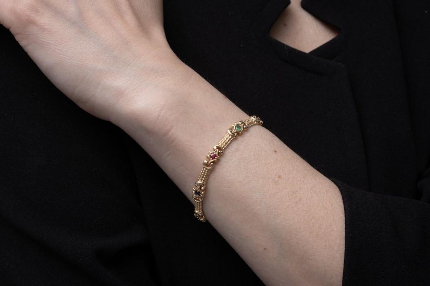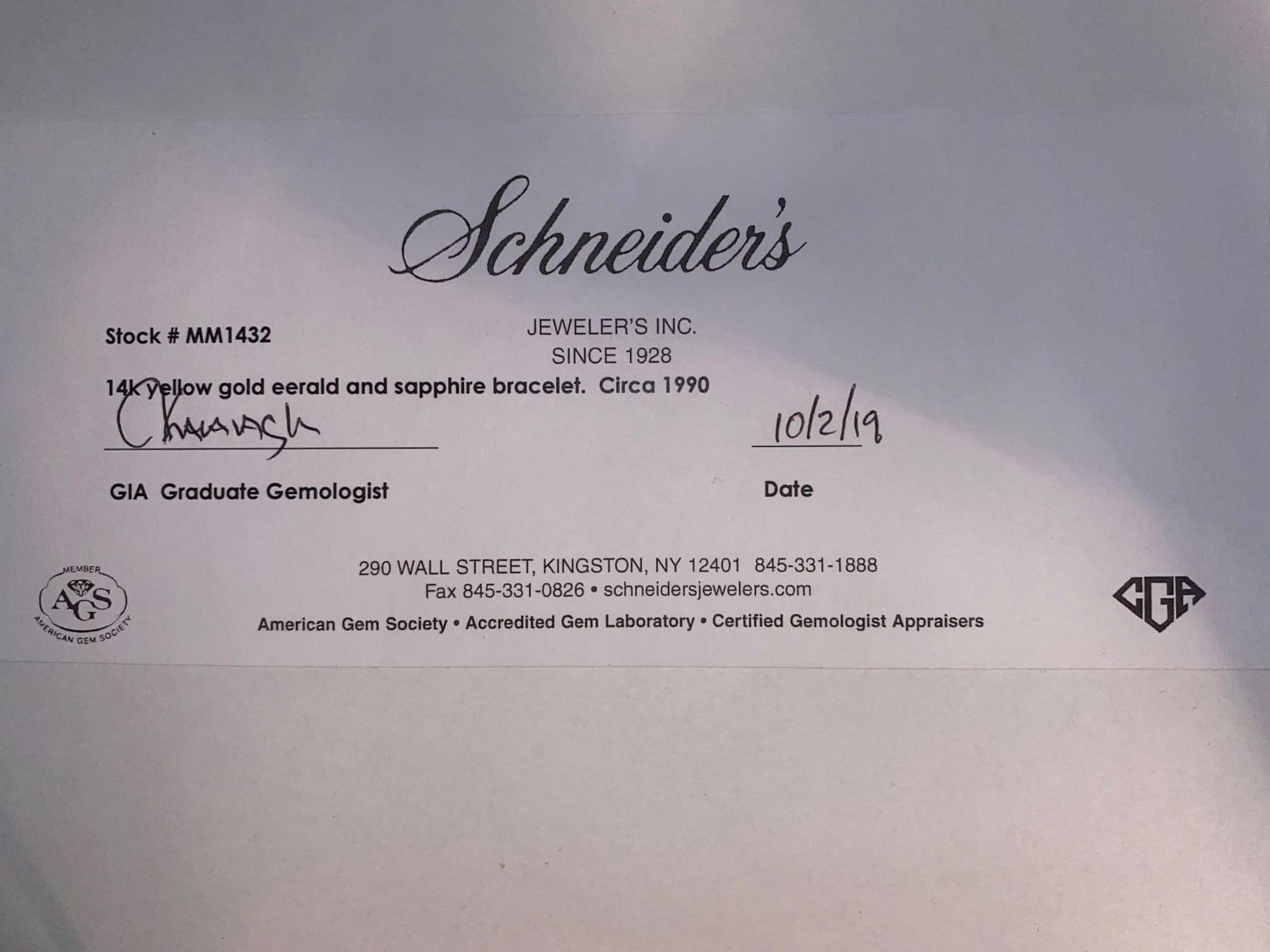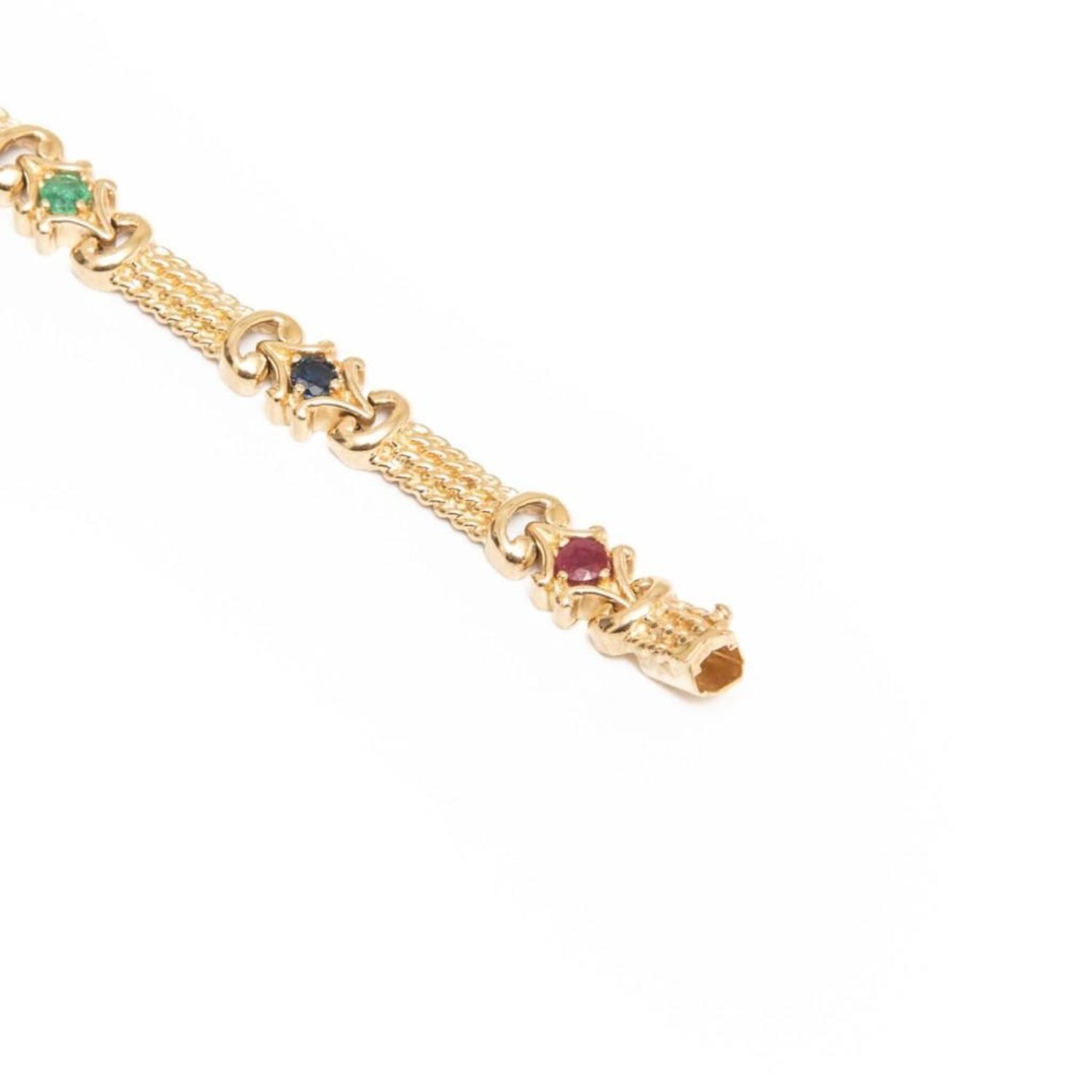 14k gold sapphire ruby and emerald gold strap bracelet 7" and weighs approx 7.7dwt. This lot is accompanied by a GIA appraiser letter from an independent and well respected firm established over 75 years ago. .in good condition overall