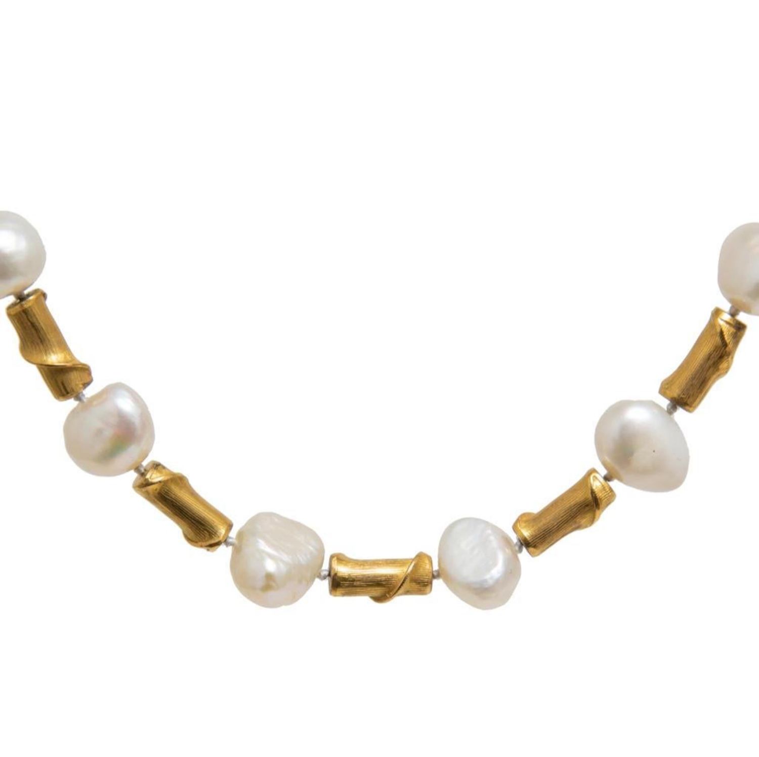 18K Yellow Gold Branch-Form Motif Tubular Beads and Freshwater Pearls Necklace. Hallmarked "AB CE." 17.5"L Approx 28.5 dwt. This lot is accompanied by a GIA appraiser letter from an independent and well respected firm established over 75 years ago. .in good condition overall