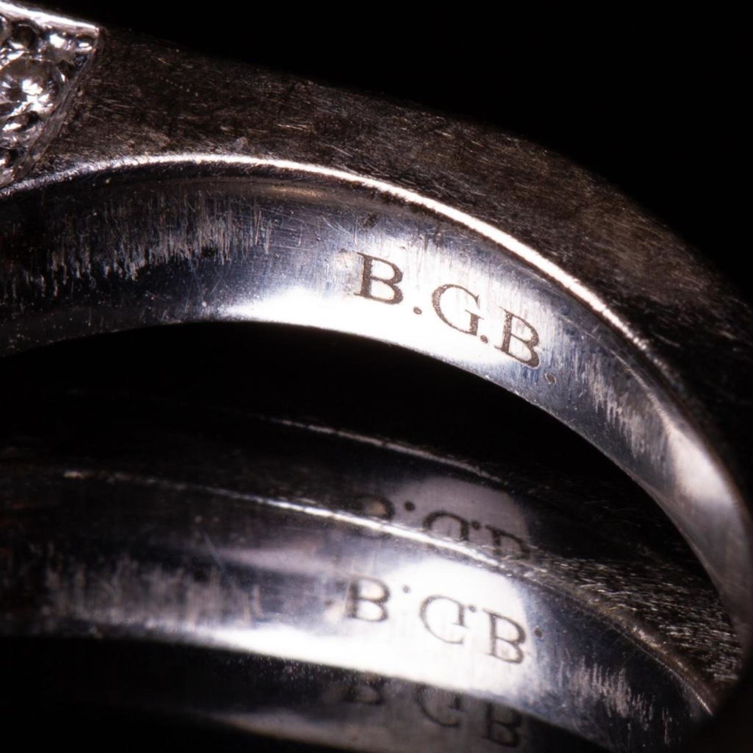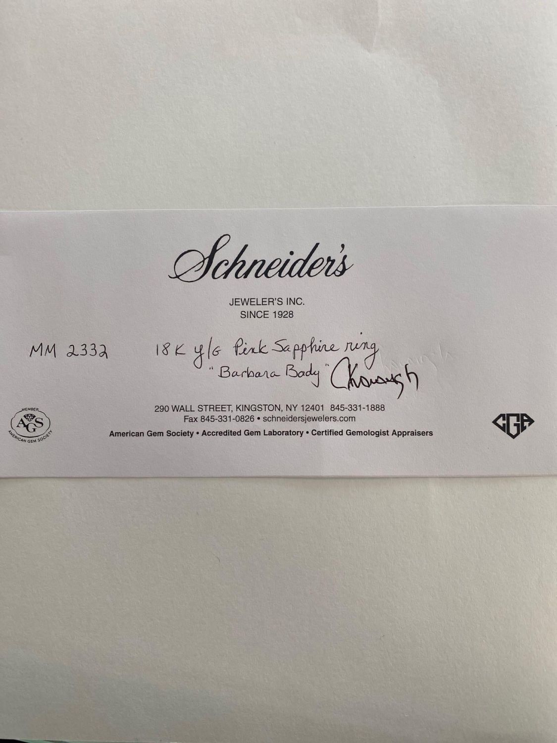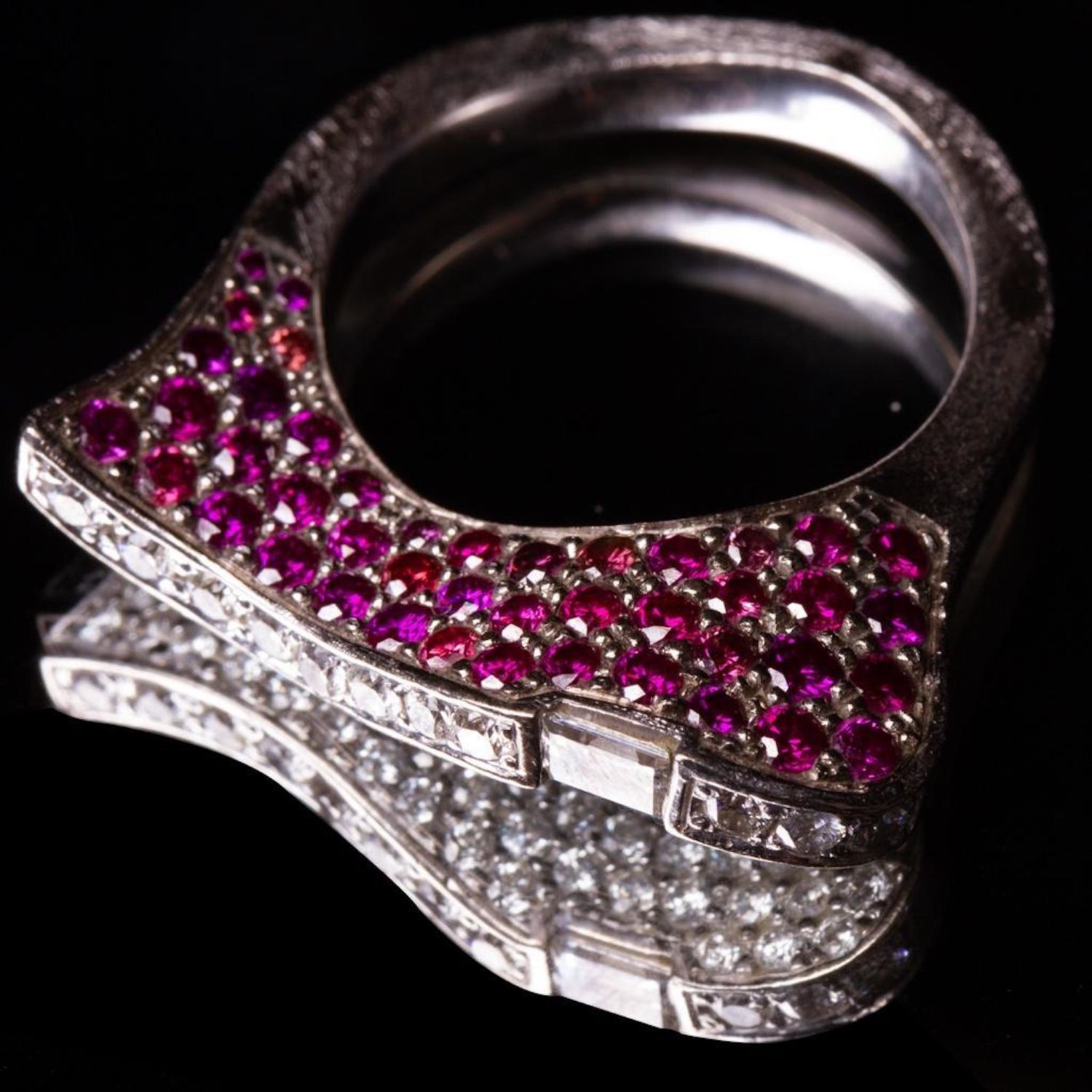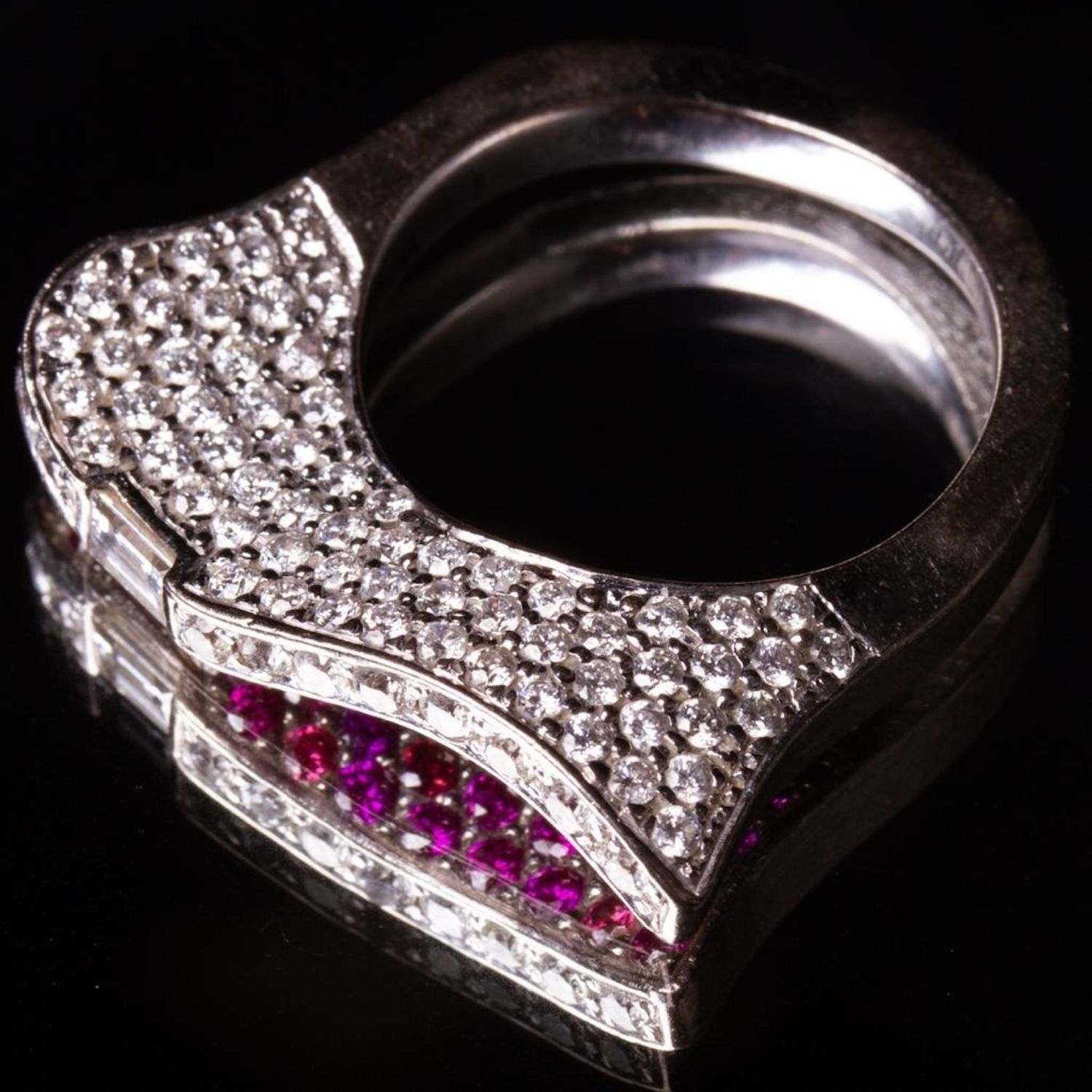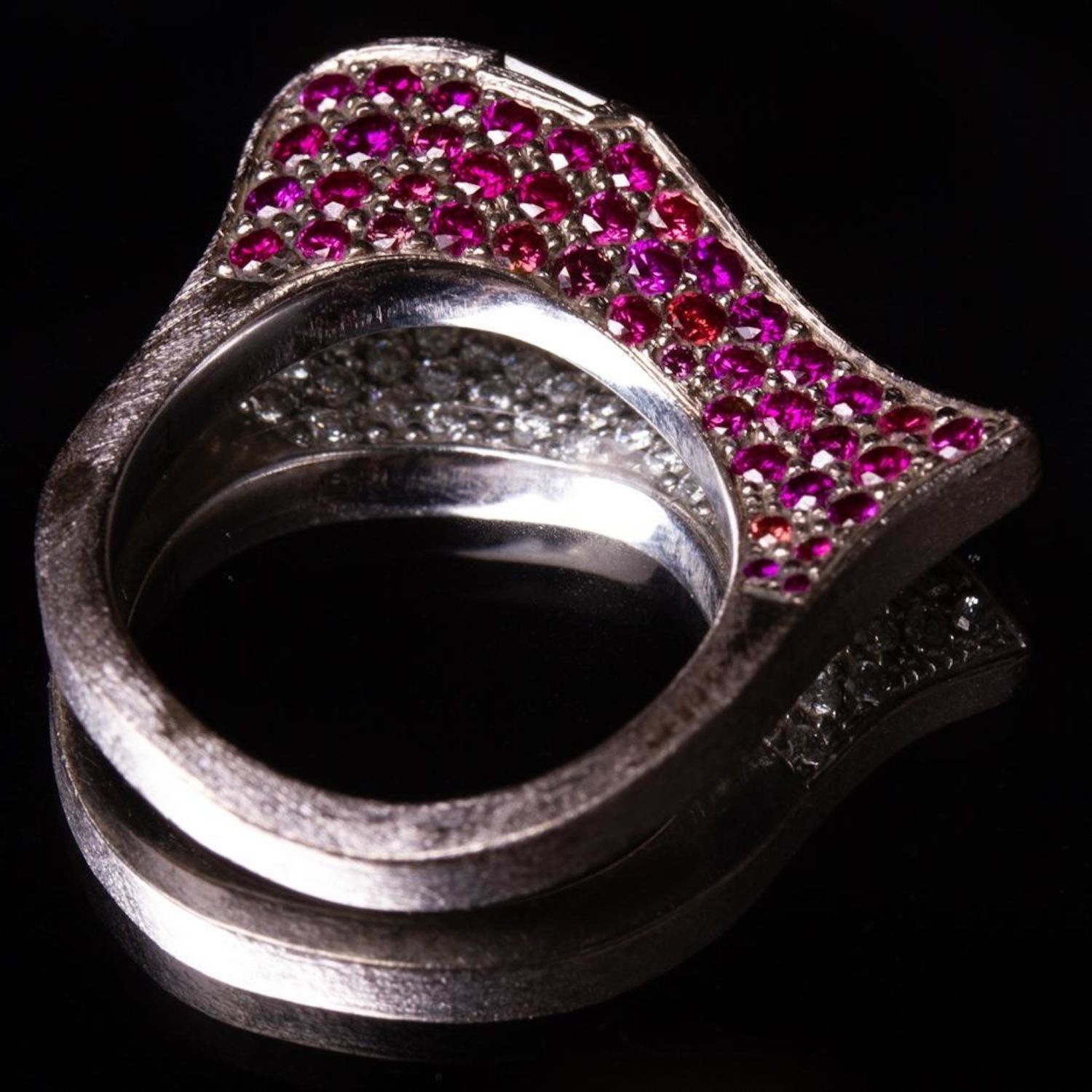 Modernist Design 18K Gold Diamond and Pink Sapphire Ring by Barbara G Bady. this ring can be worn individually or nests with following lot ..From the Estate of Bady United Nations Plaza NY. Size 7 good condition. Weighs 10.9 Grams