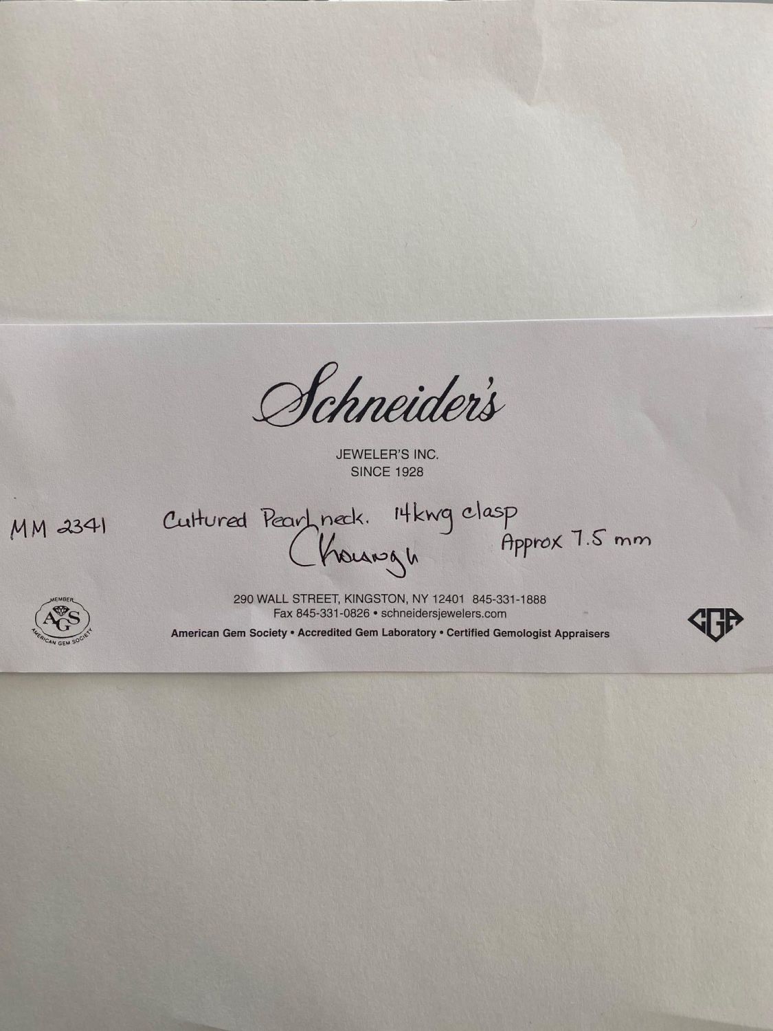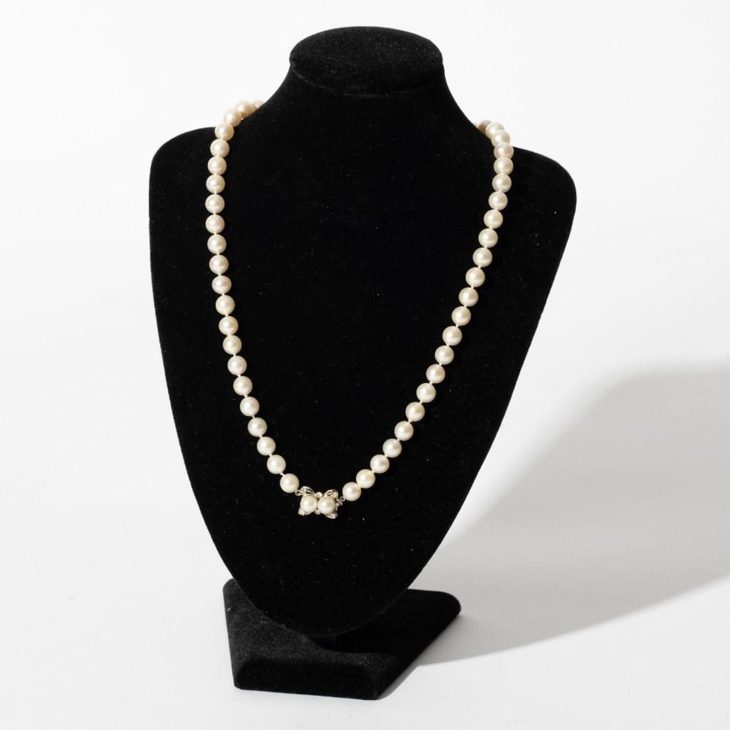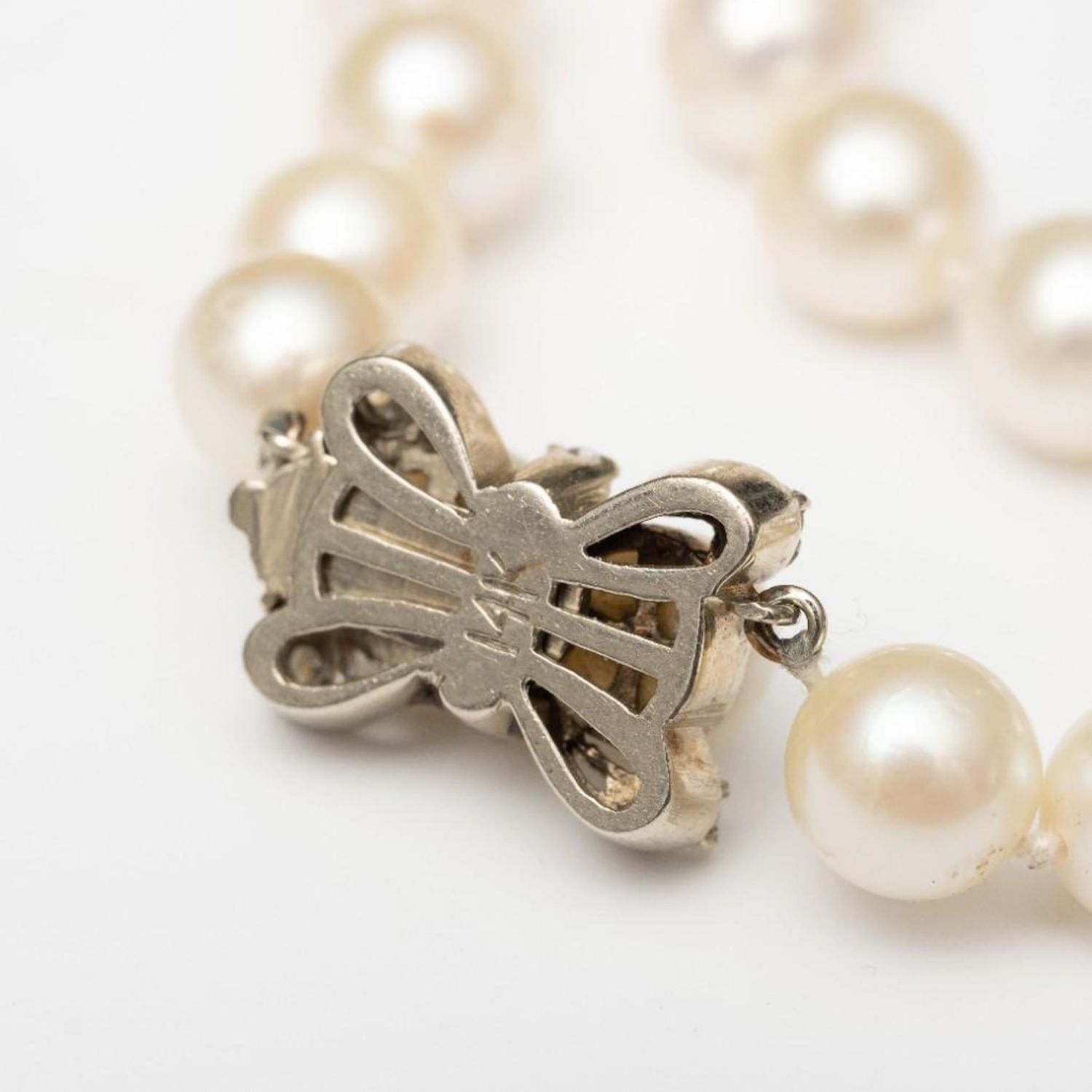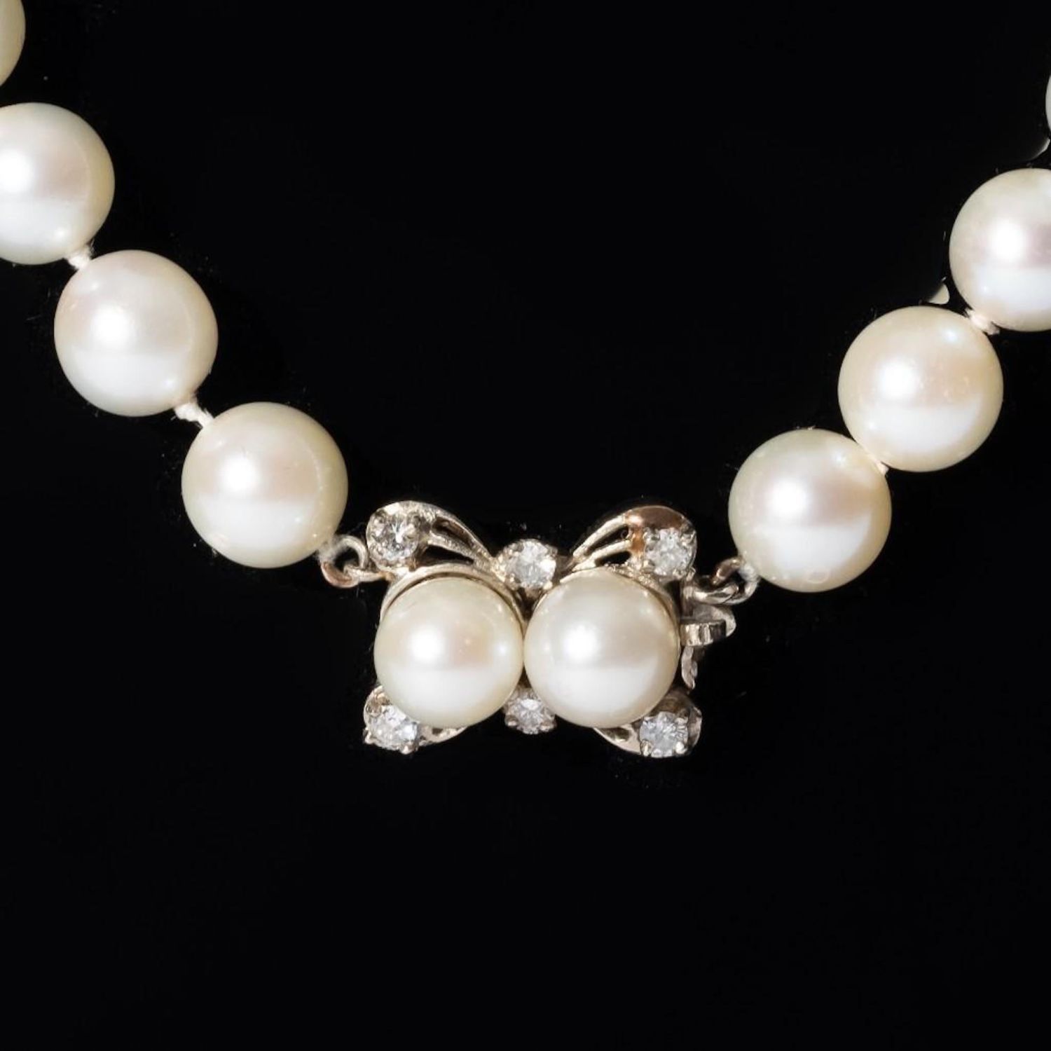 14k cultured pearl and diamond necklace, 26.7 dwts. Length: 20 inches. The clasp is 14K White Gold with pearls and single cut diamonds round diamonds. good condition