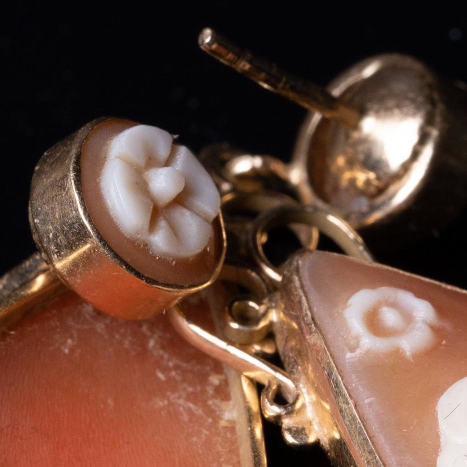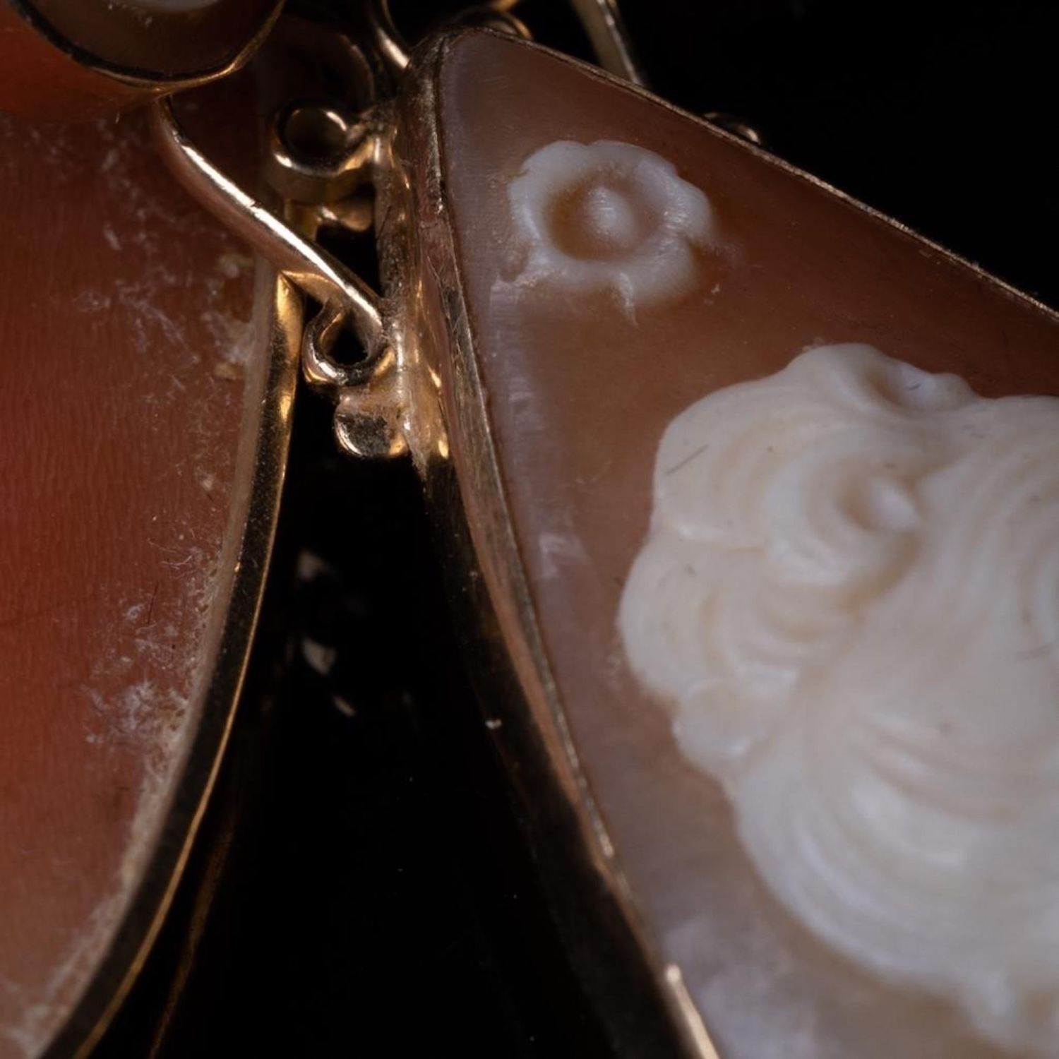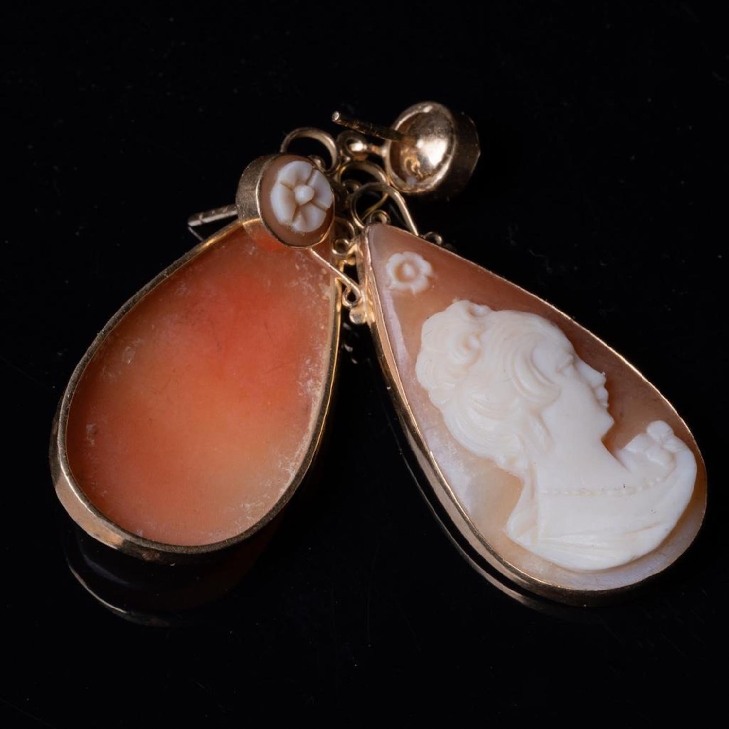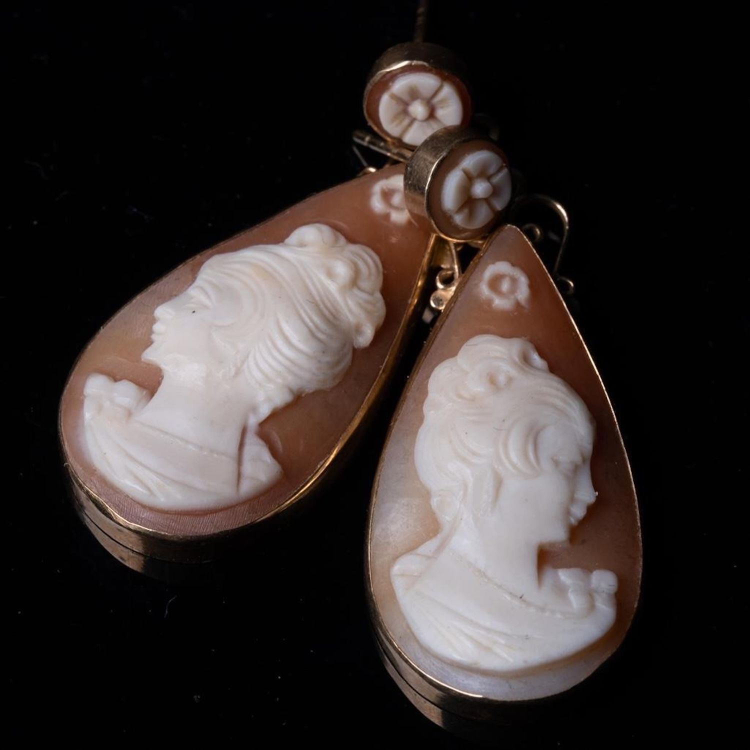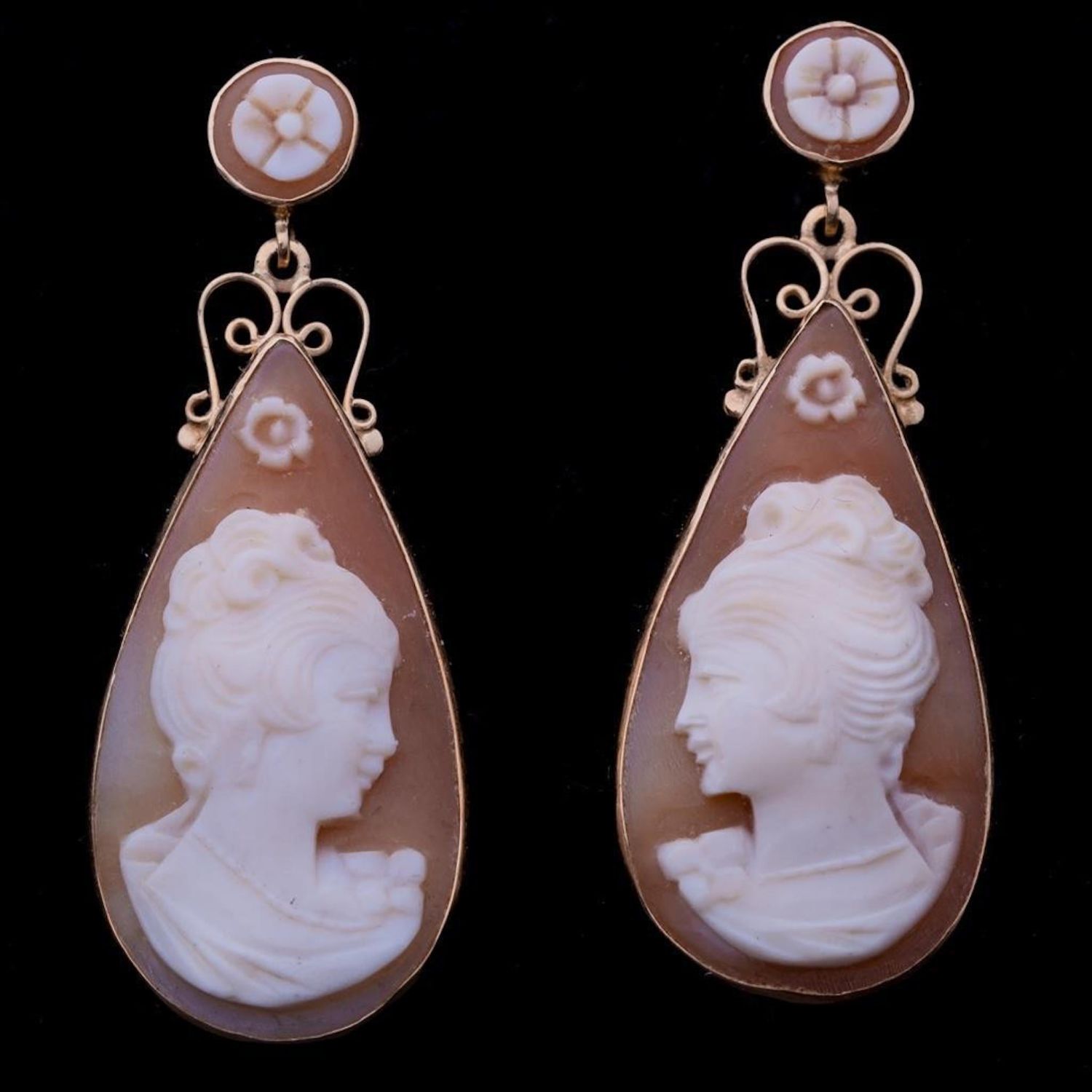 Antique Pair of 14k Gold carved Cameo Dangle Earrings teardrop form with the carved cameo of a beautiful woman in profile, surmounted by a rosette carved cameo stud, tested 14KT. 2 in. 6.4 dwt. approx good condition