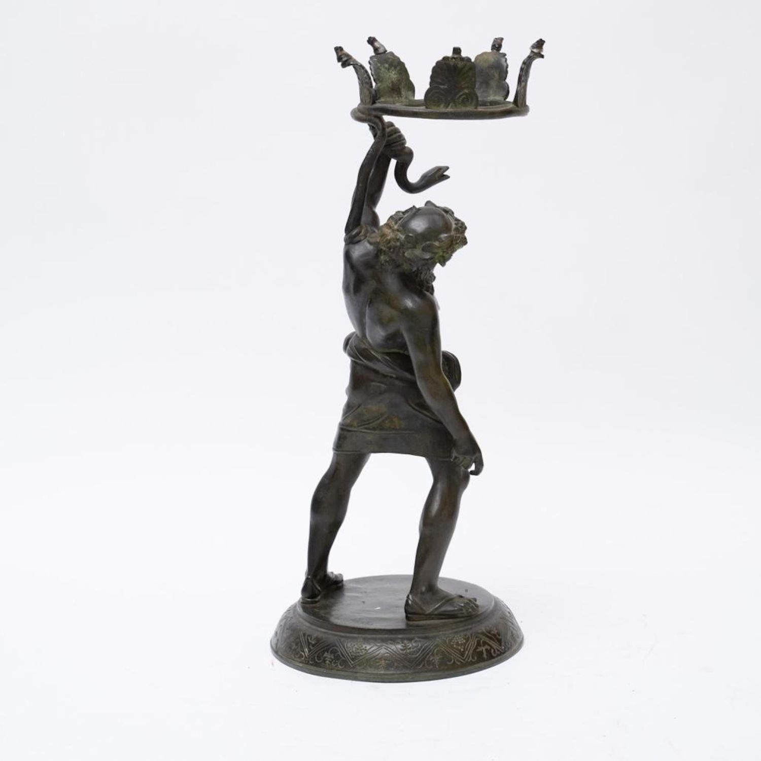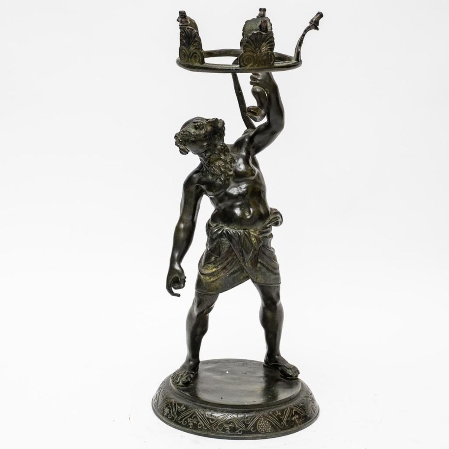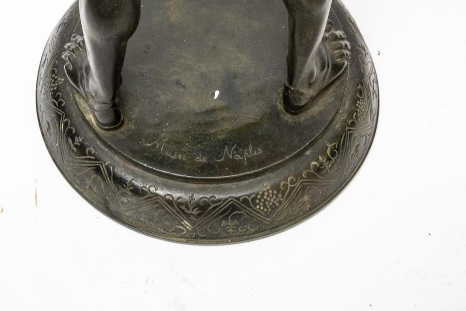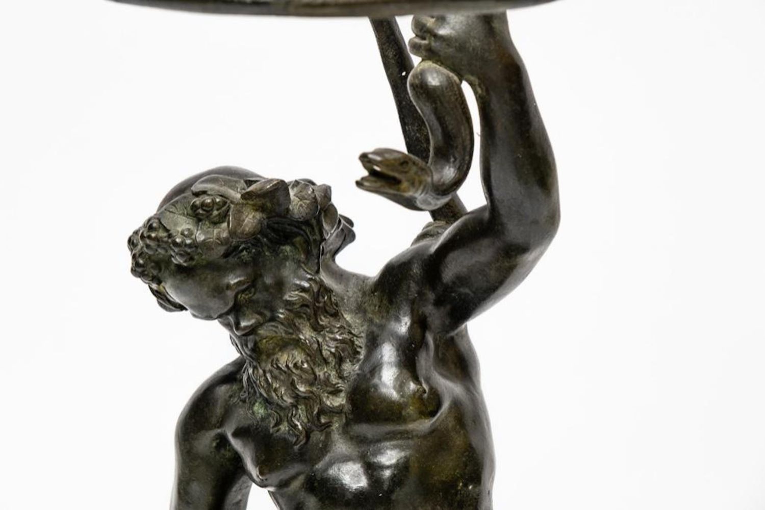 19th Century Bronze of Silenus. The bronze is marked Musee de Naples. In Greek mythology, Silenus was a companion and tutor to the wine god Dionysus. A notorious consumer of wine and usually drunk and had to be supported by satyrs or carried by a donkey. Silenus was described as the oldest, wisest and most inebriated of the followers of Dionysus, when intoxicated he was said to possess special knowledge and the power of prophecy. Measures 24"H