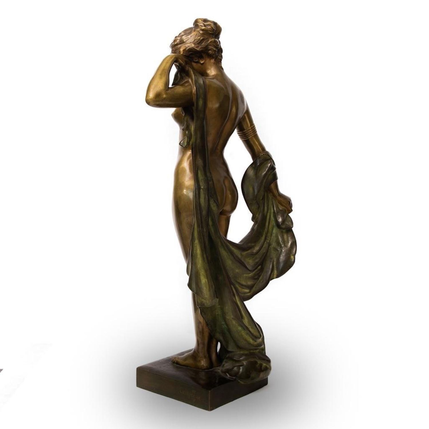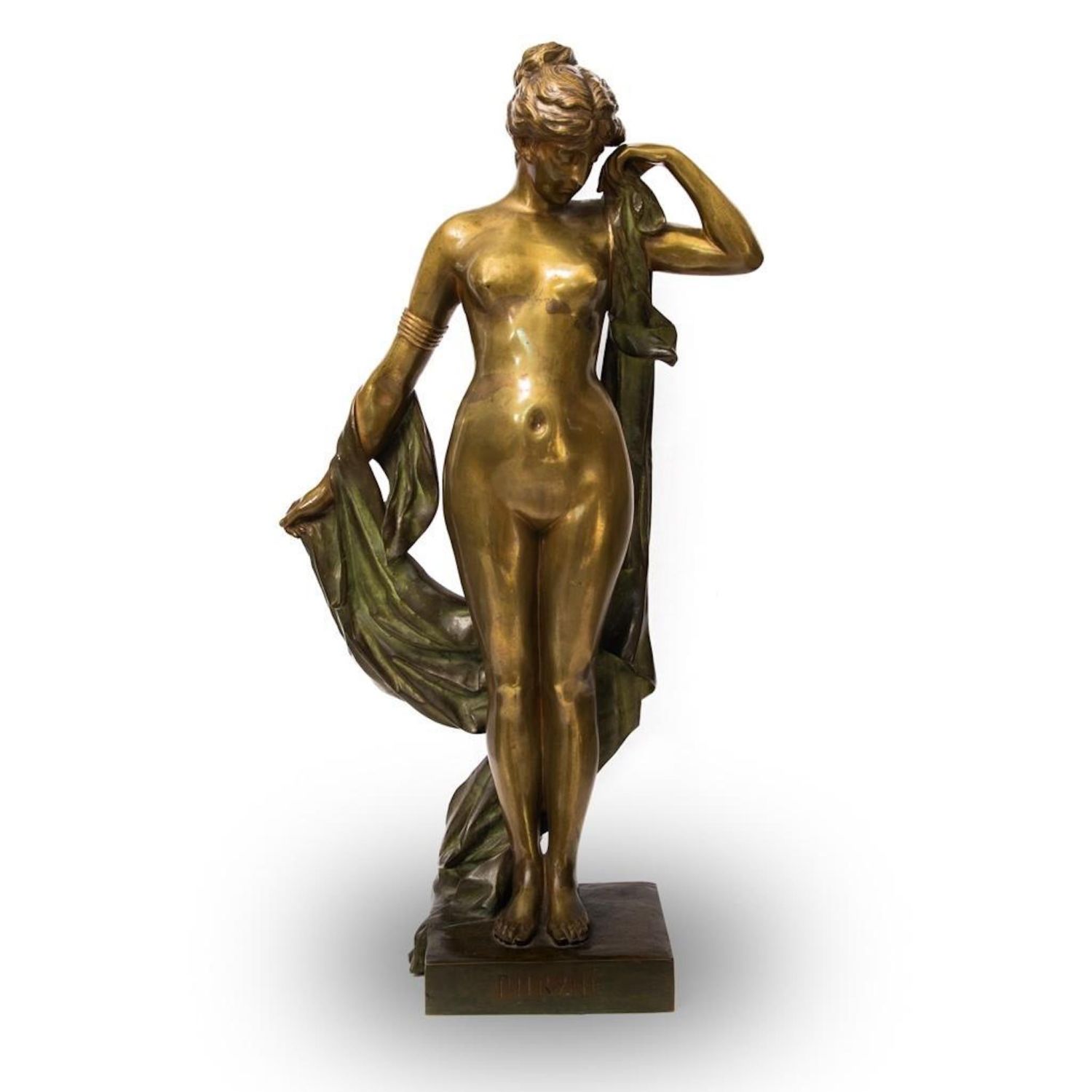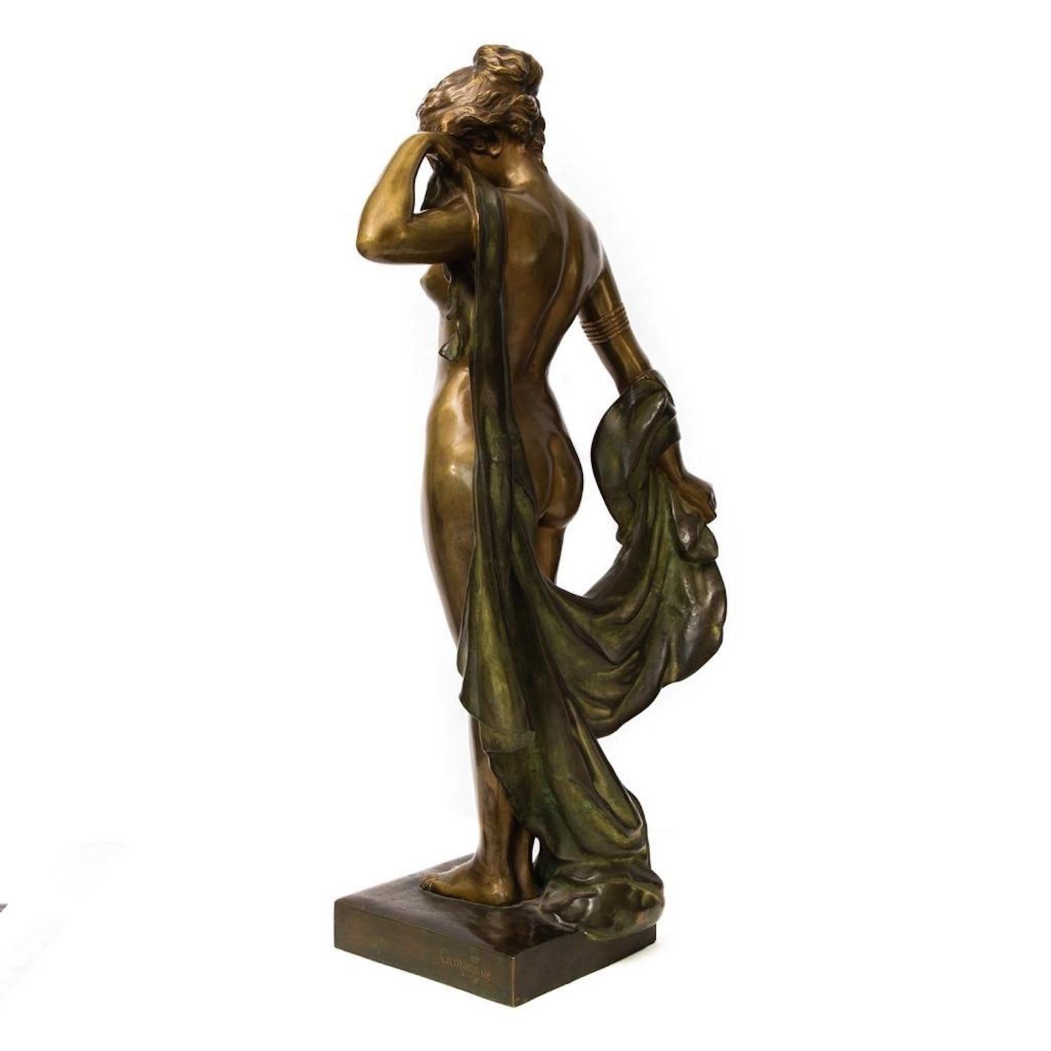 Pierre-Etienne Daniel Campagne Phryne Devant ses Juges, c.1900. Bronze female nude with draped blanket. Base reads "Phrxne" Signed Campagne on base. Height: 34" with base. Provenance: Property from the noted Zoullas Collection.