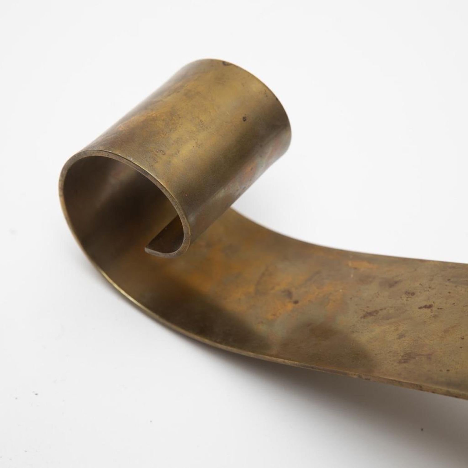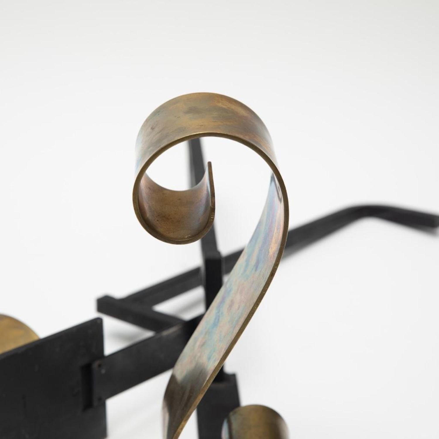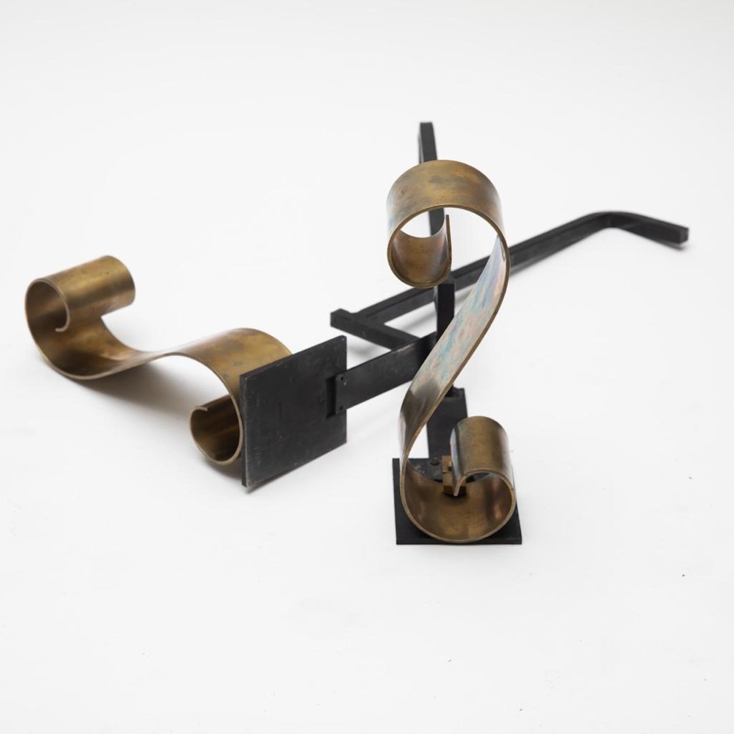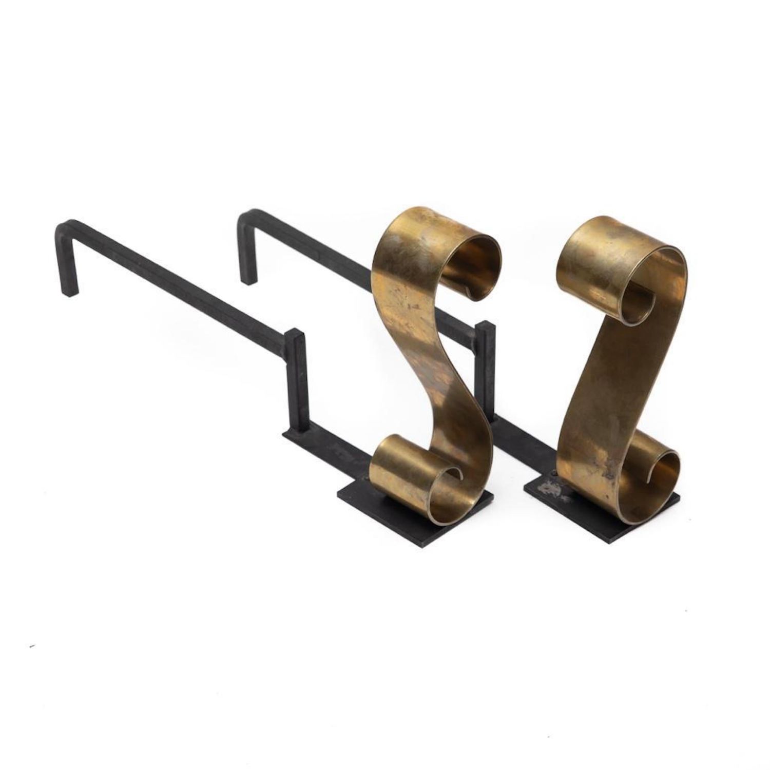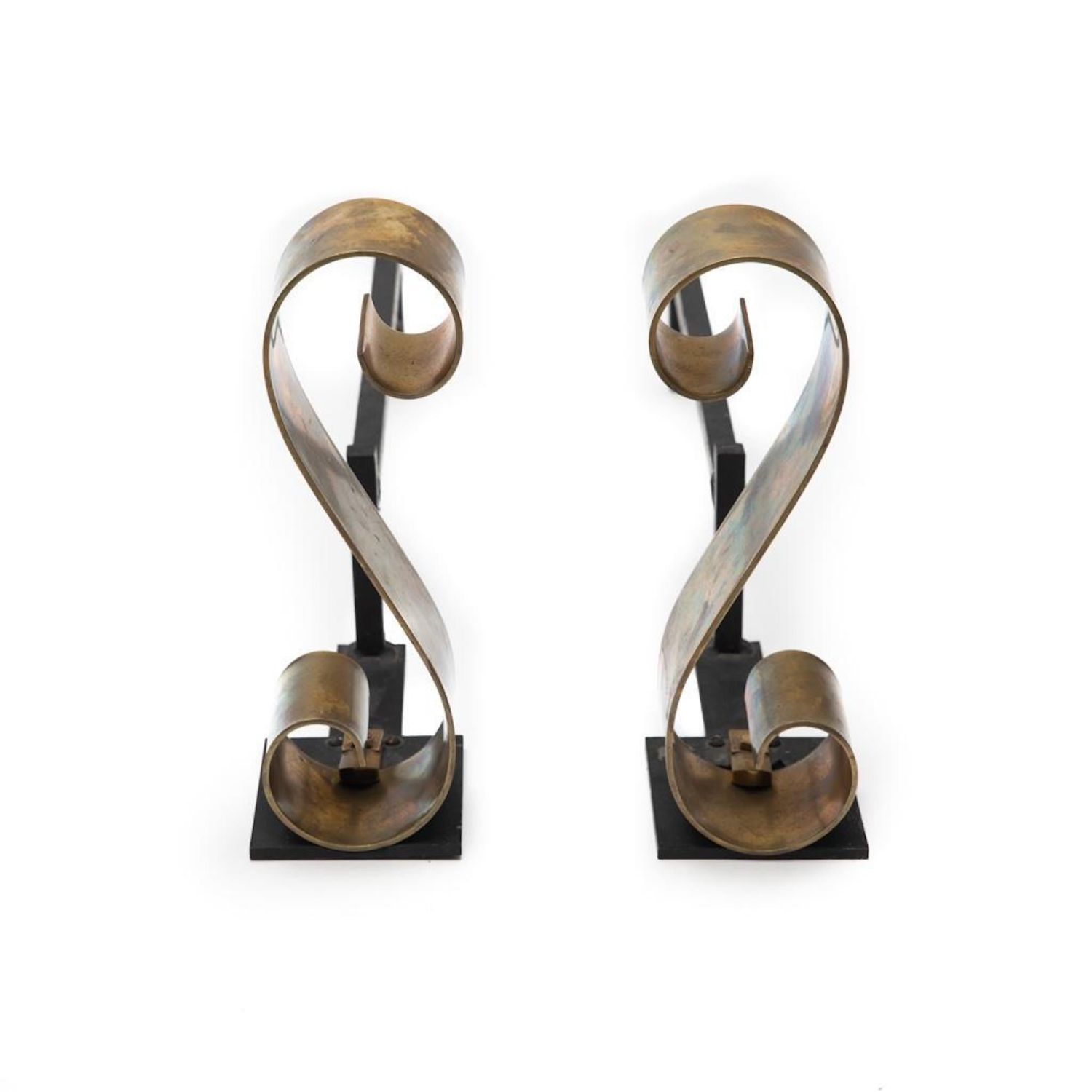 Donald Deskey? Andiron Mid Century Modern scroll design brass and Iron. 24"L x 12"H