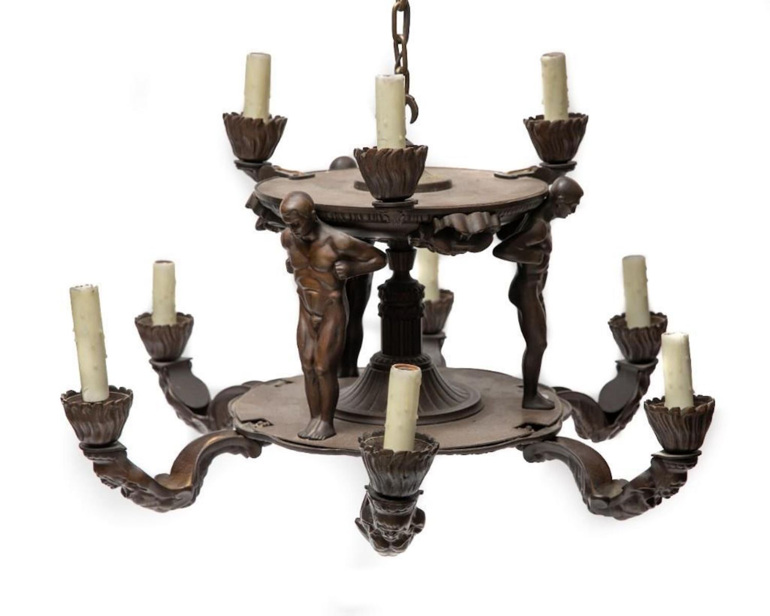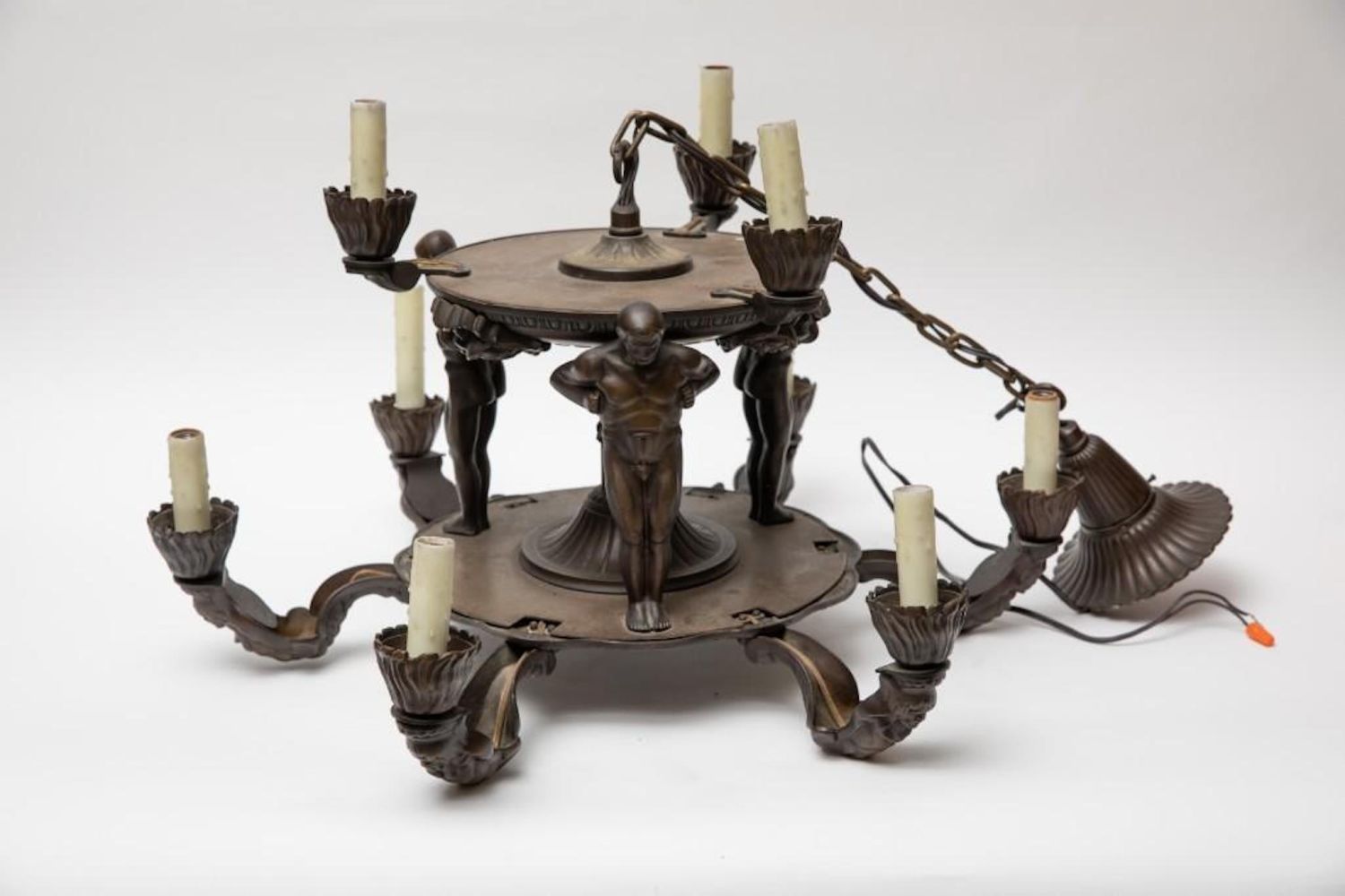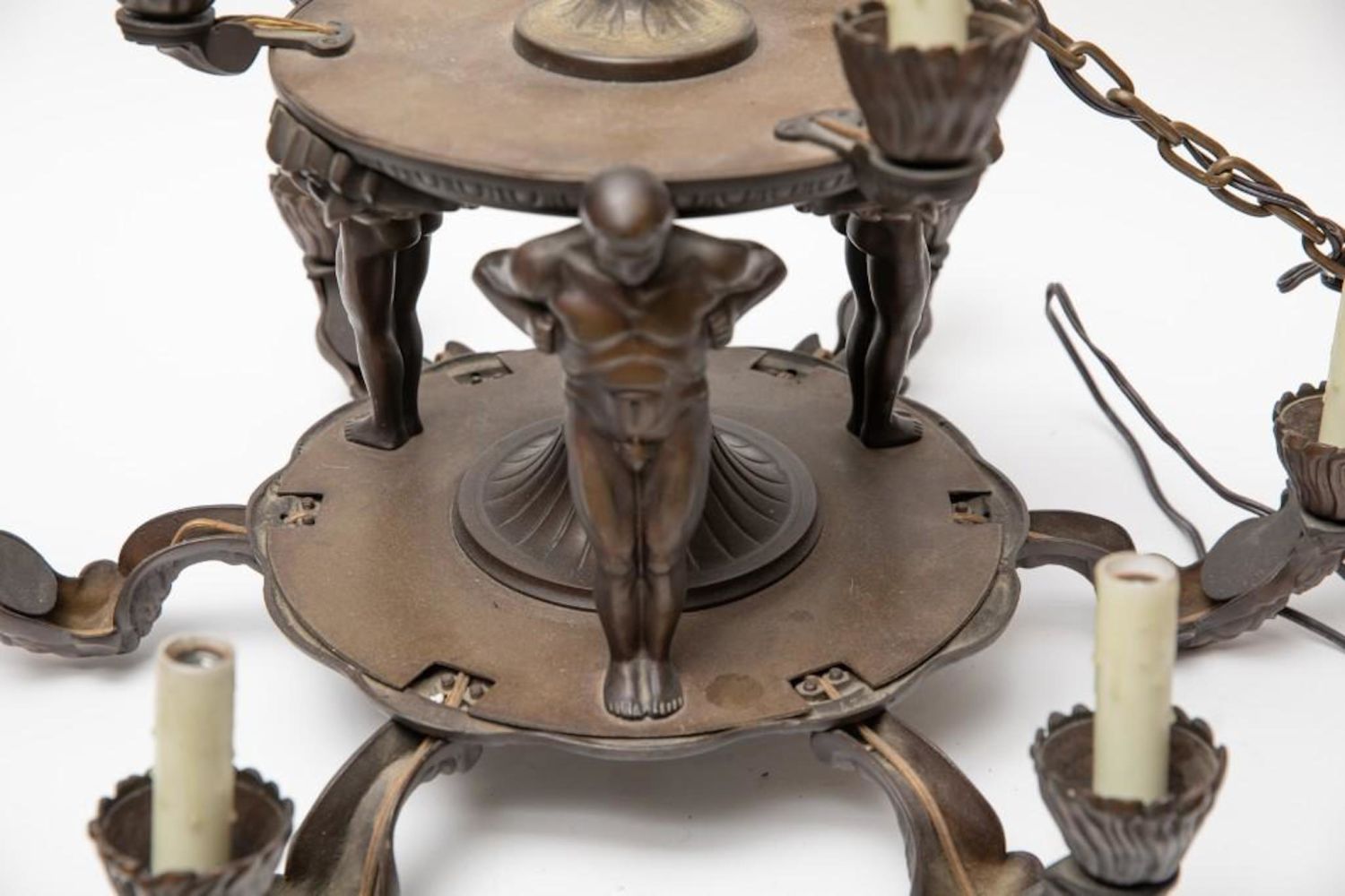 Bronze Art Deco Figural Chandelier, c. 1930, bronze Wiener Werkstätte, Gurschner style, Art Deco design, with three male figures supporting the upper structure, the lower part decorated with medallions within a leafy pattern and figures, fixture ht. approx. 15" H. to ceiling approx. 36, dia. 26 in. good condition overall