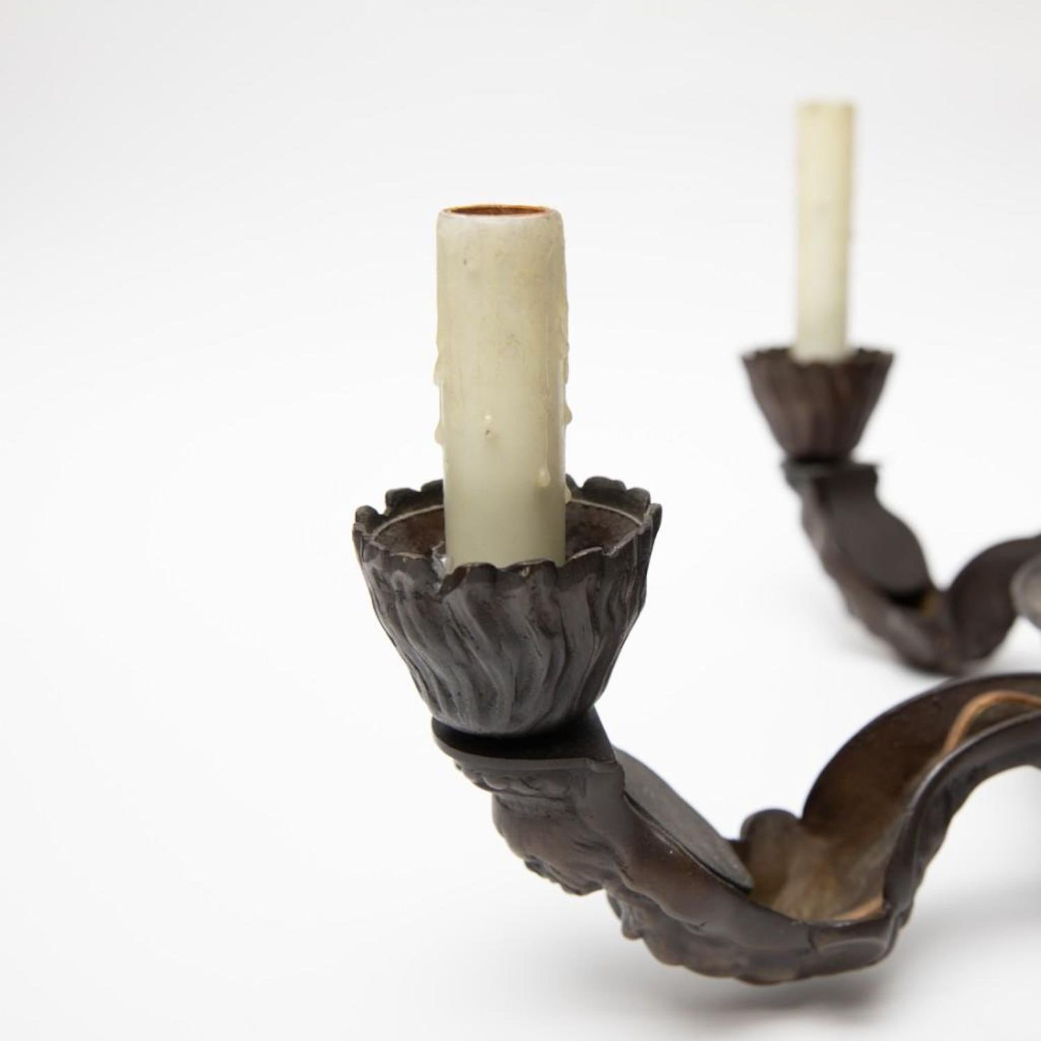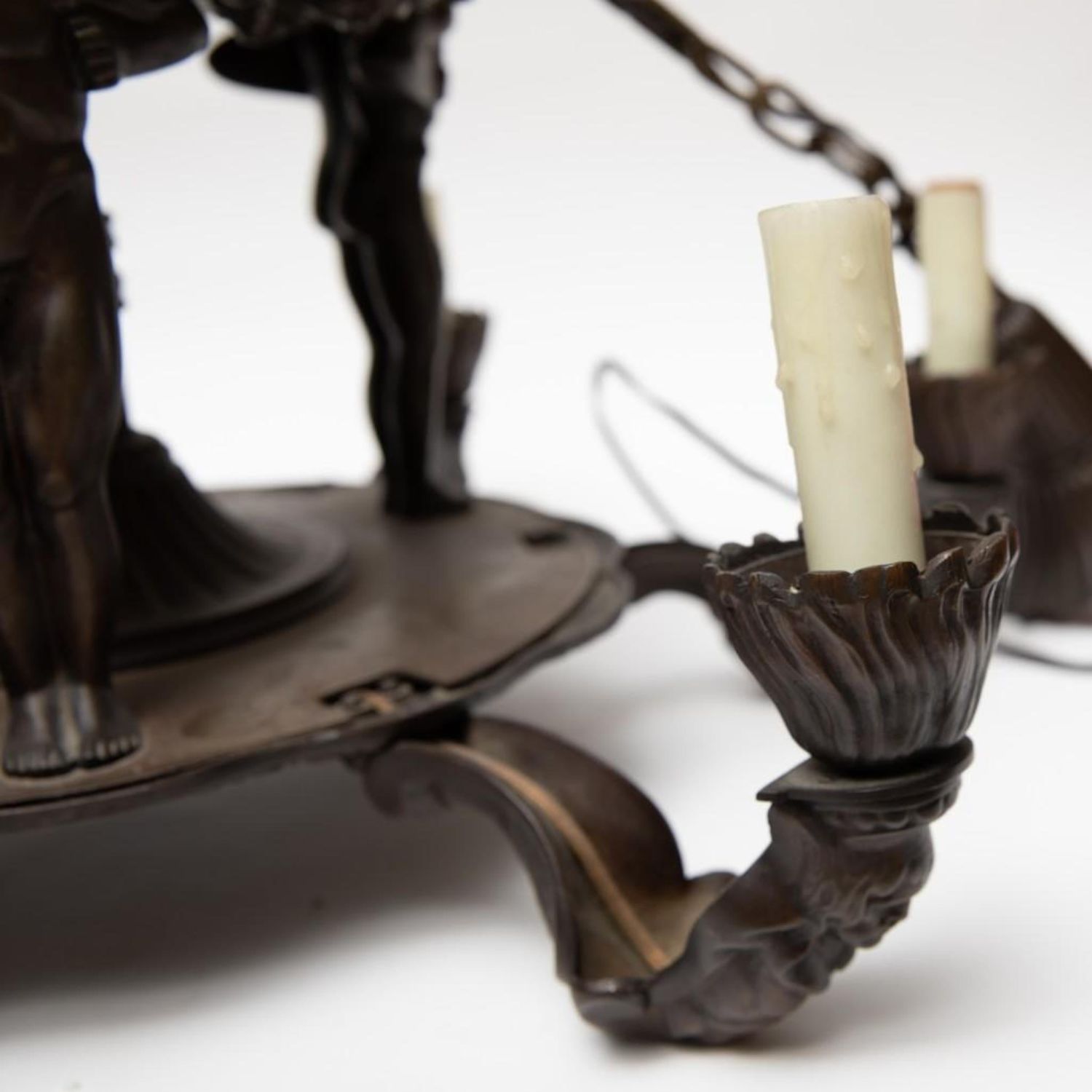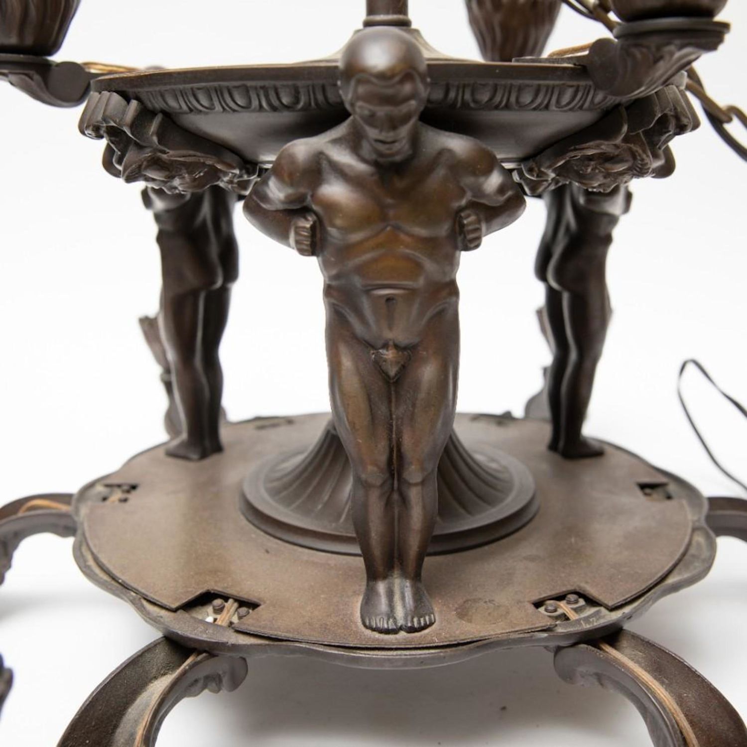 Bronze Art Deco Figural Chandelier, c. 1930, bronze Wiener Werkstätte, Gurschner style, Art Deco design, with three male figures supporting the upper structure, the lower part decorated with medallions within a leafy pattern and figures, fixture ht. approx. 15" H. to ceiling approx. 36, dia. 26 in. good condition overall