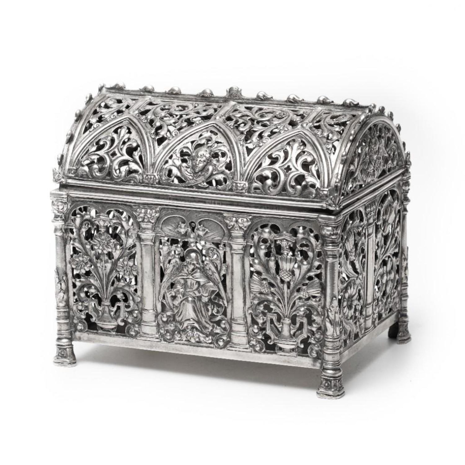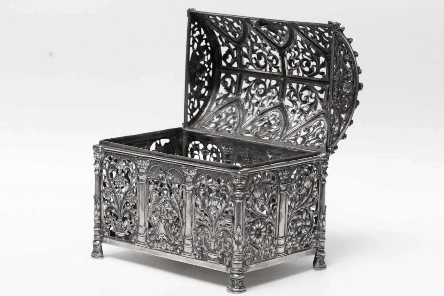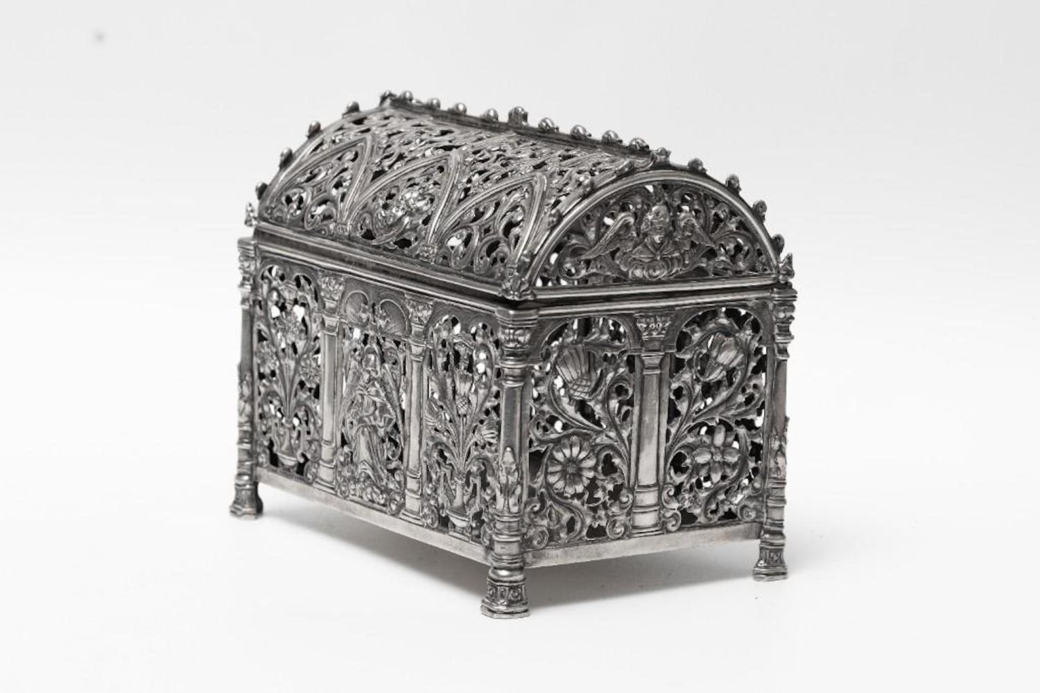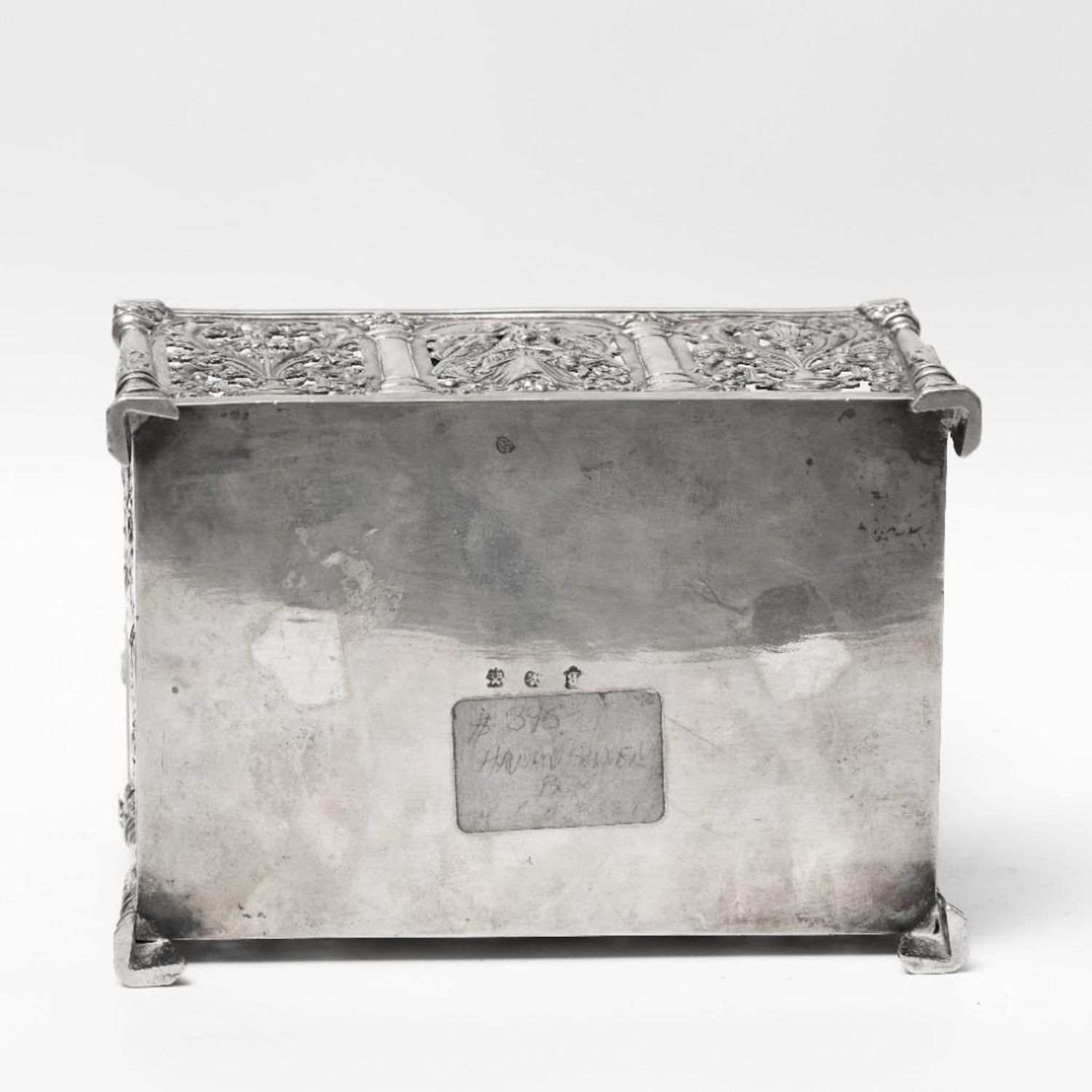 Antique German Silver Casket, Hanau, underside bearing makers mark and silver content hallmarks, reticulated foliate casing with columns and angels. Measures 5.25"H x 6"W x 4"D, approx. 20.25 troy oz.