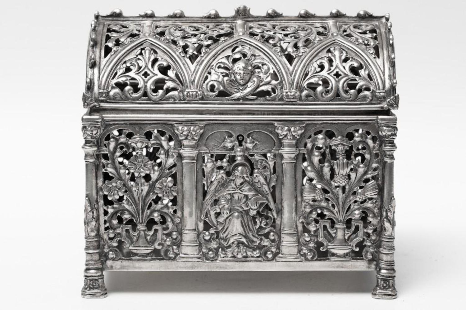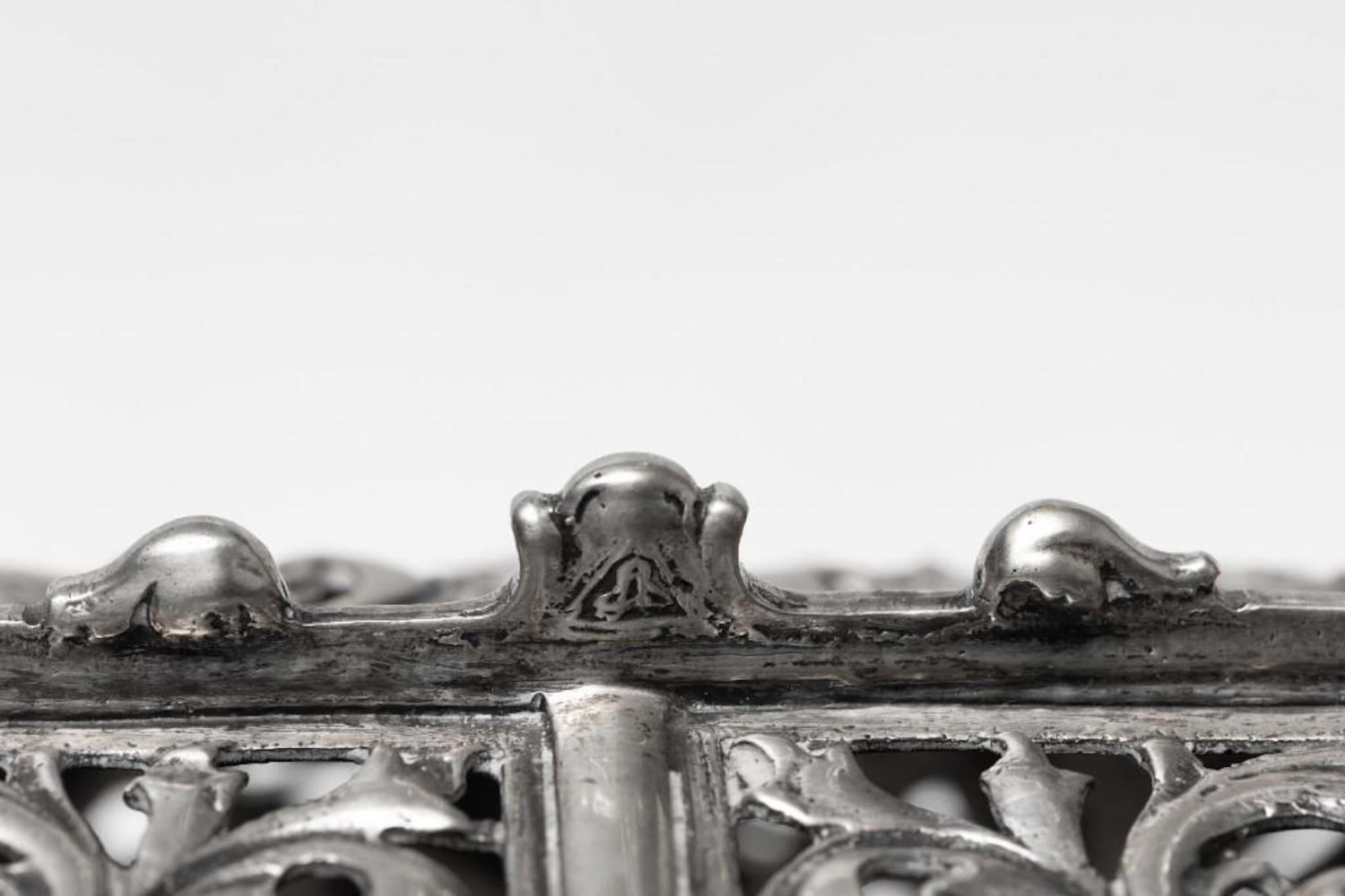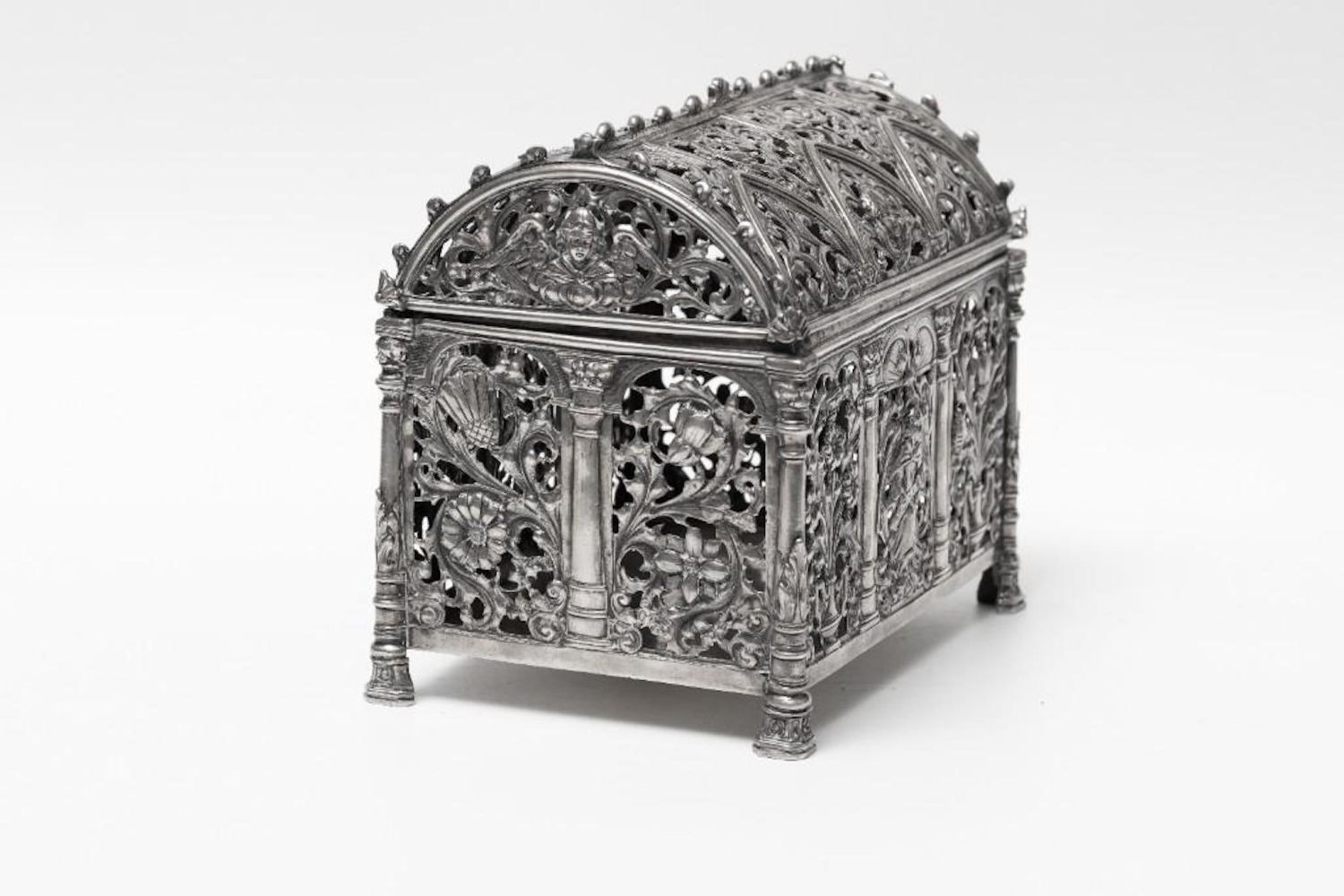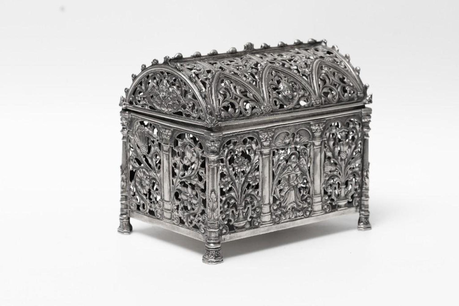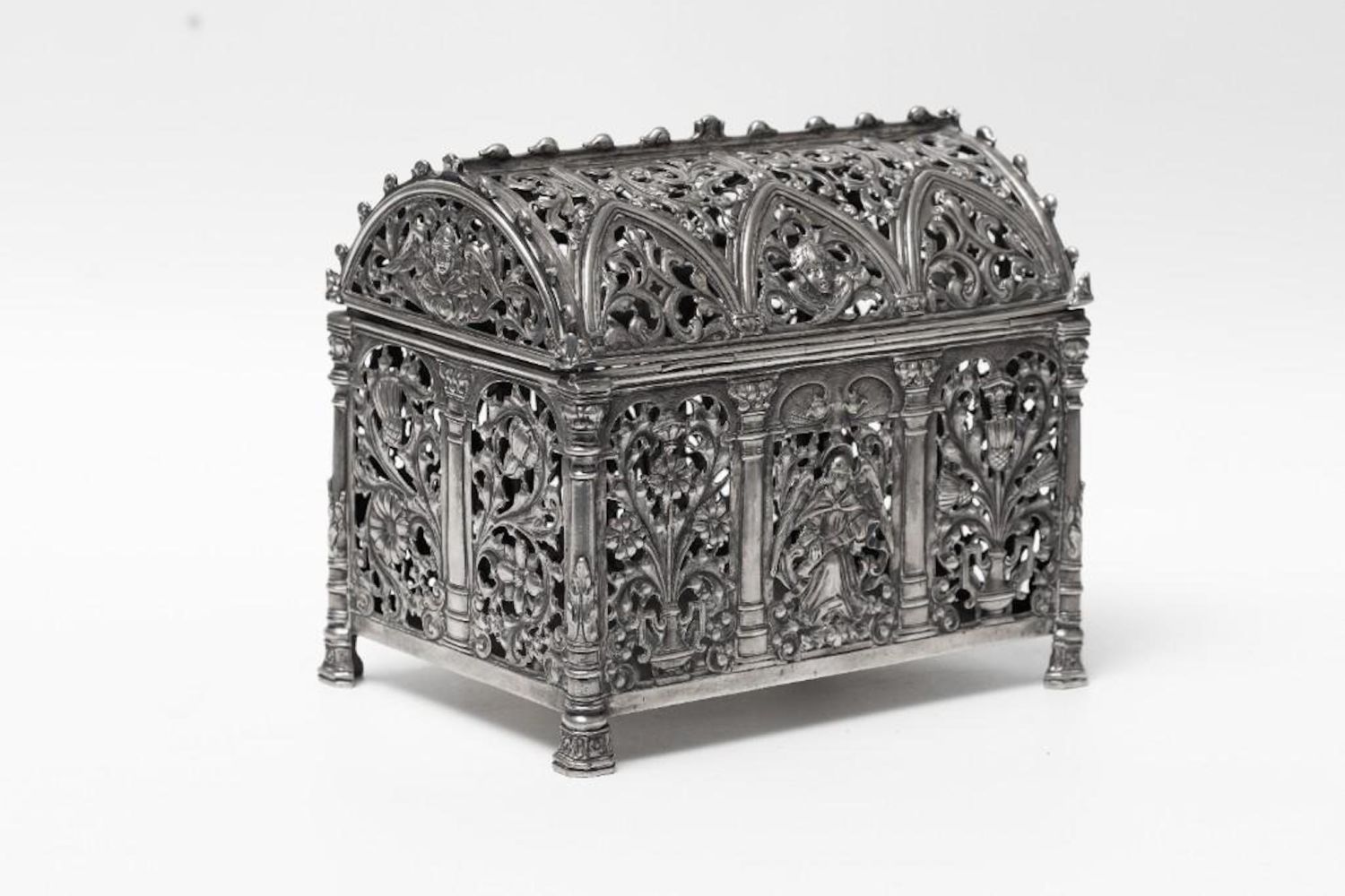 Antique German Silver Casket, Hanau, underside bearing makers mark and silver content hallmarks, reticulated foliate casing with columns and angels. Measures 5.25"H x 6"W x 4"D, approx. 20.25 troy oz.