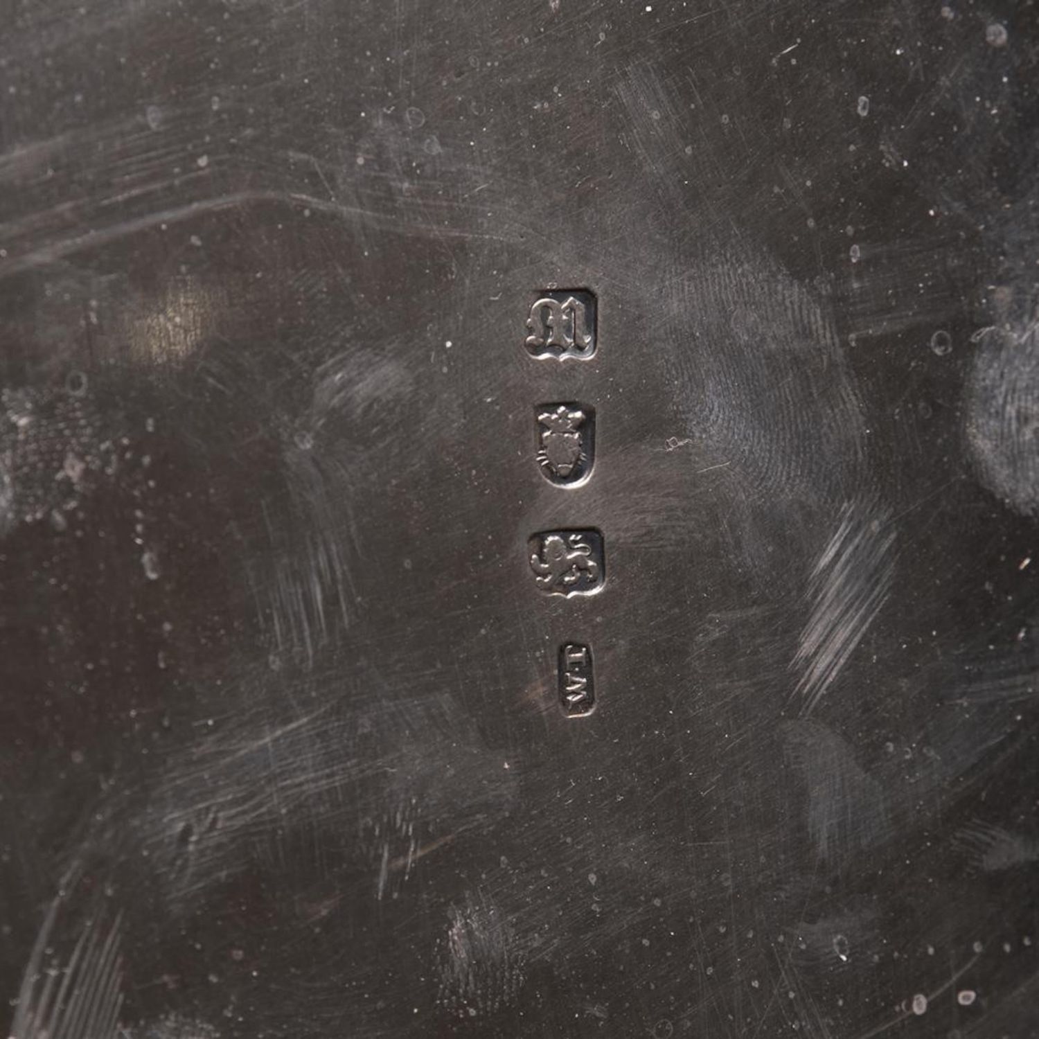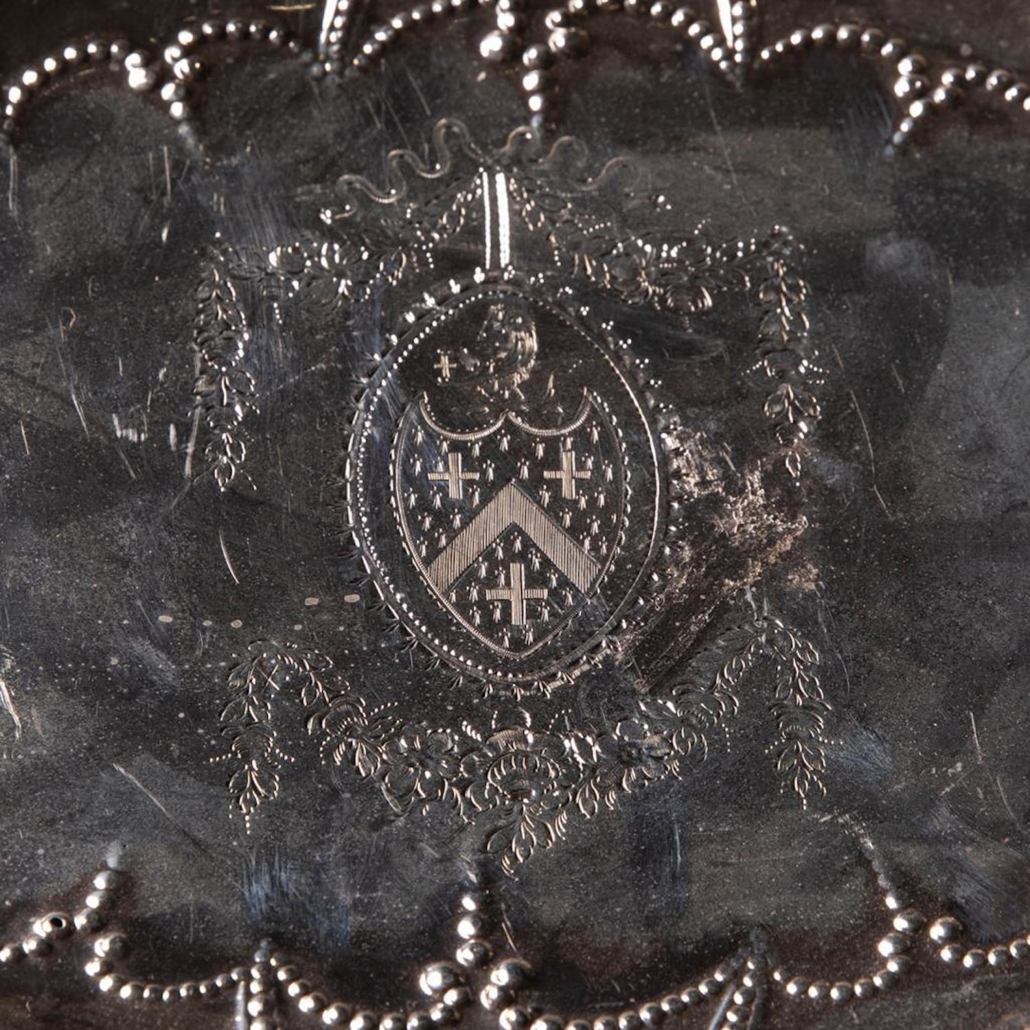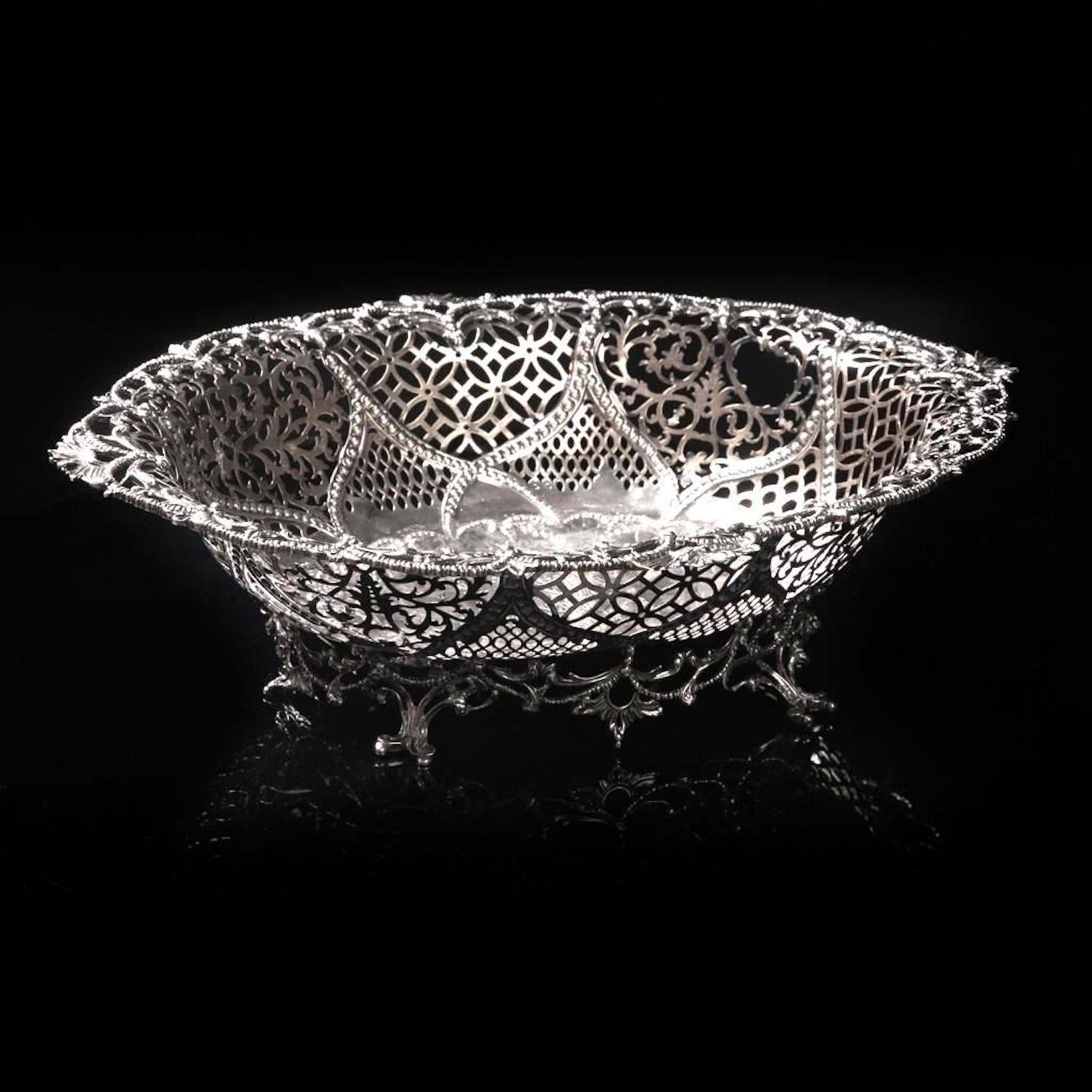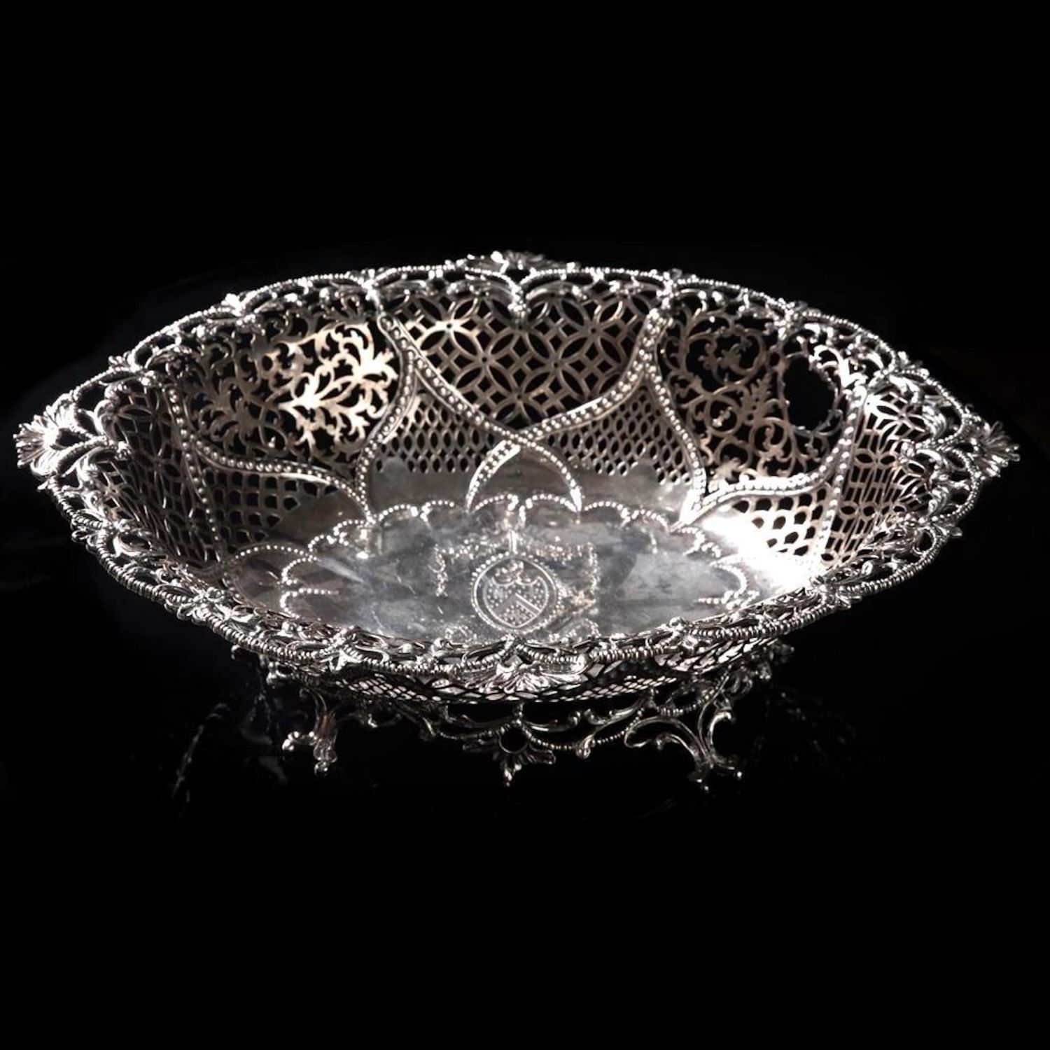 English Silver Reticulated Oval Footed Bowl, center with an engraved coat of arms and makers marks, etc on bottom height 4 inches, length 15 1/4 inches, width 12 inches, 26.3 troy ounces. Provenance: from a park avenue ny estate. Great condition.