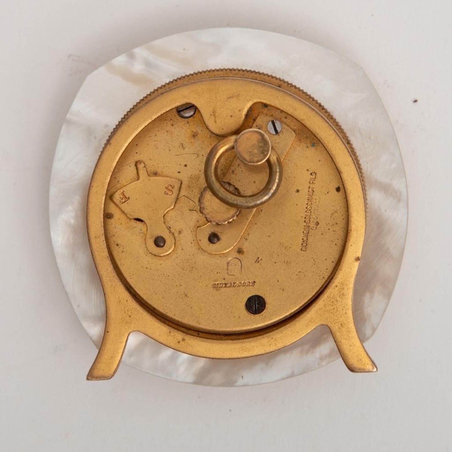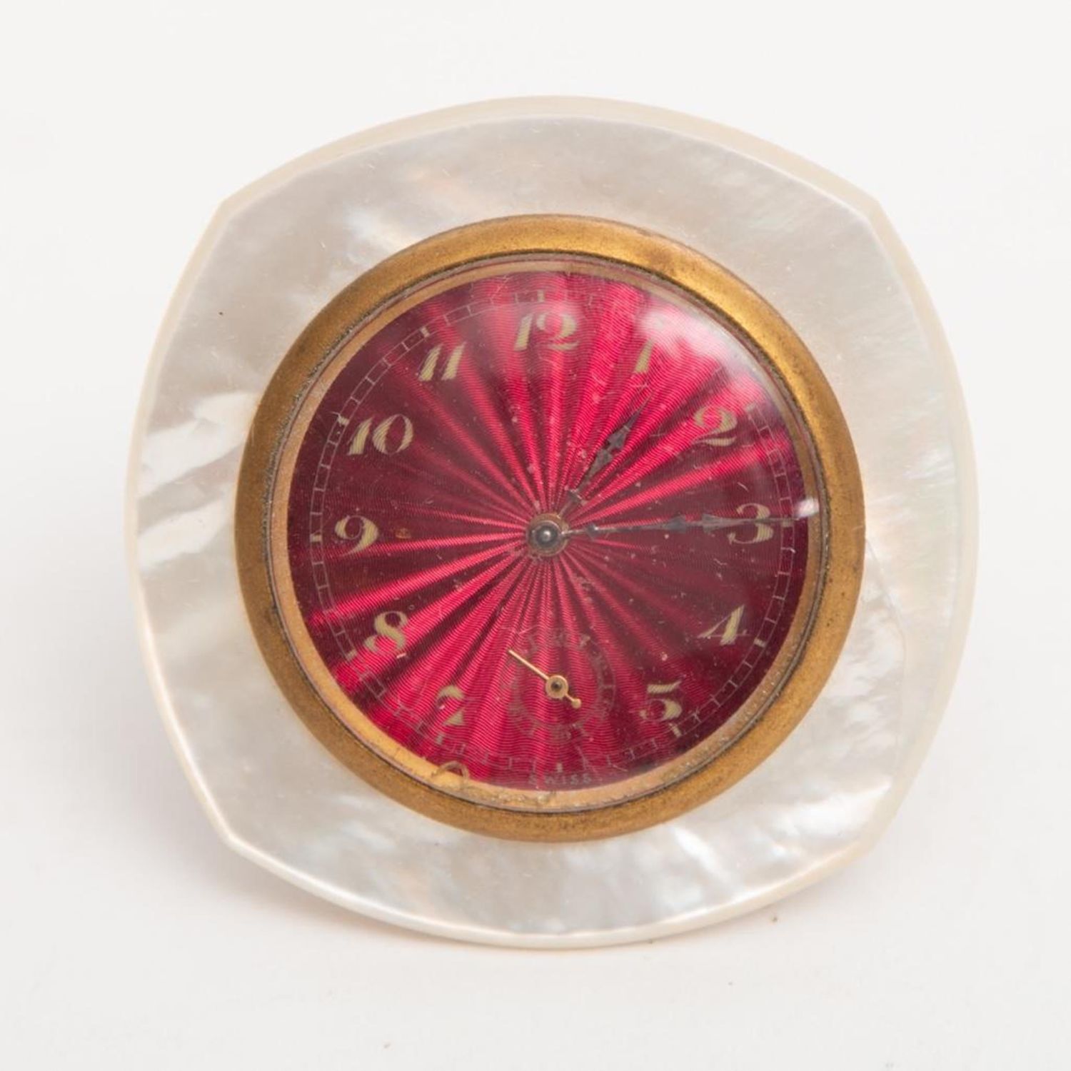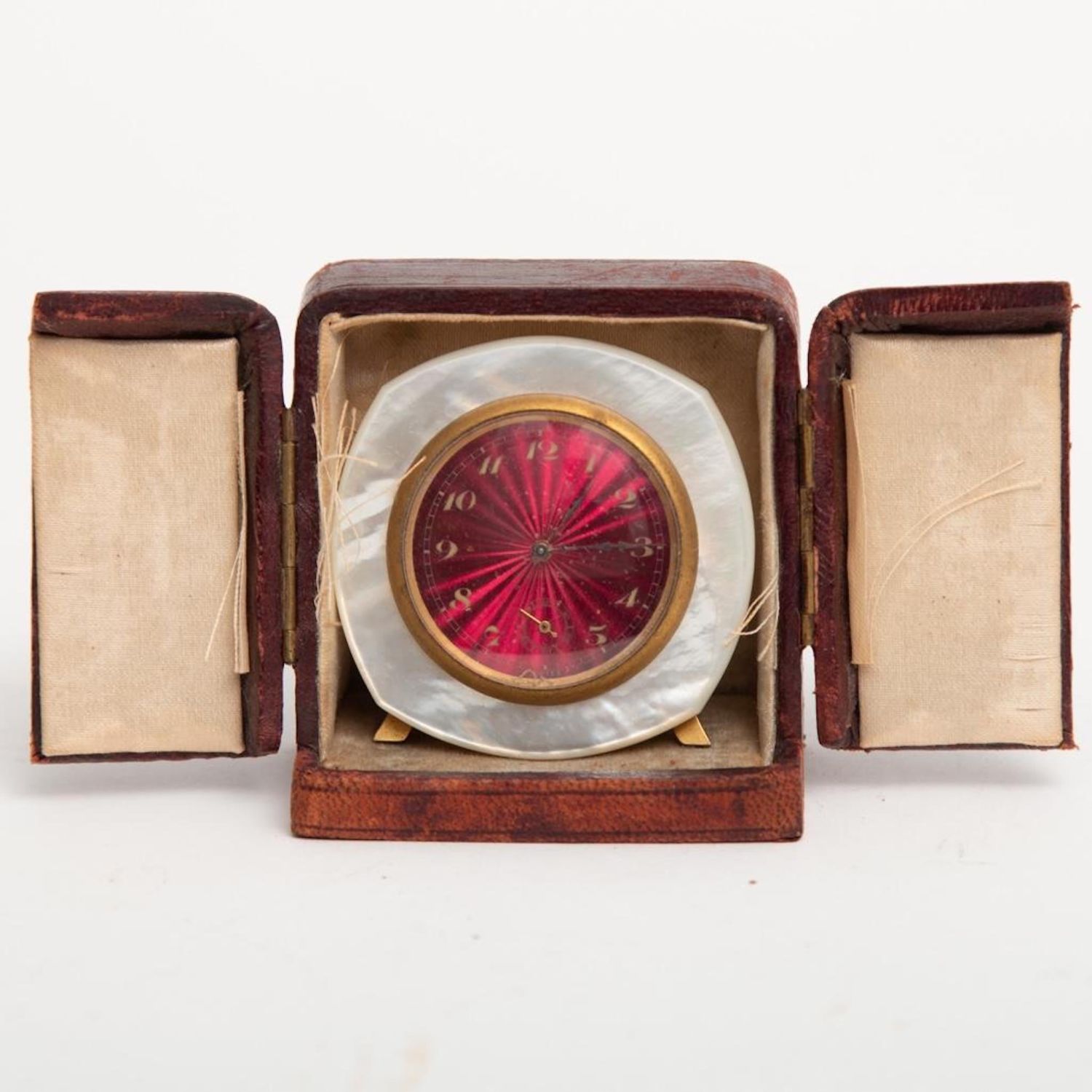 Art Deco Travel Clock. Didisheim Goldschmidt Fils Swiss Clock having a red enameled Guilloche face, surrounded by mother of pearl. Marked on back and comes with original leather fitted case. Circa 1930. Clock measure 2" x 2"