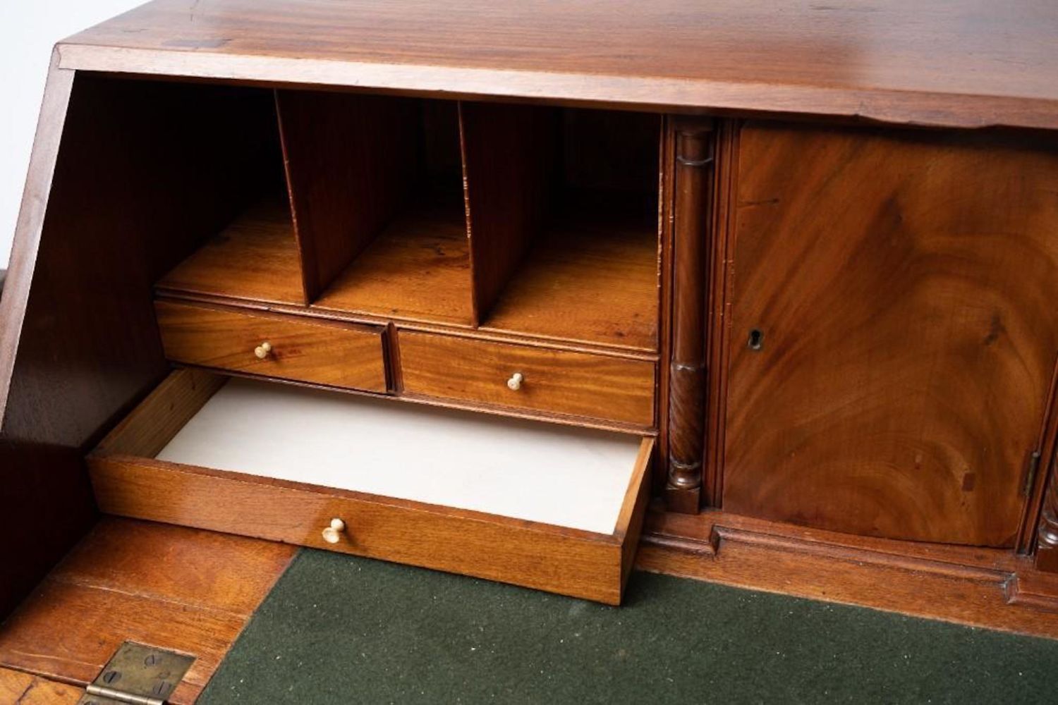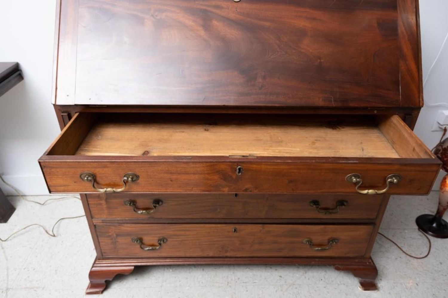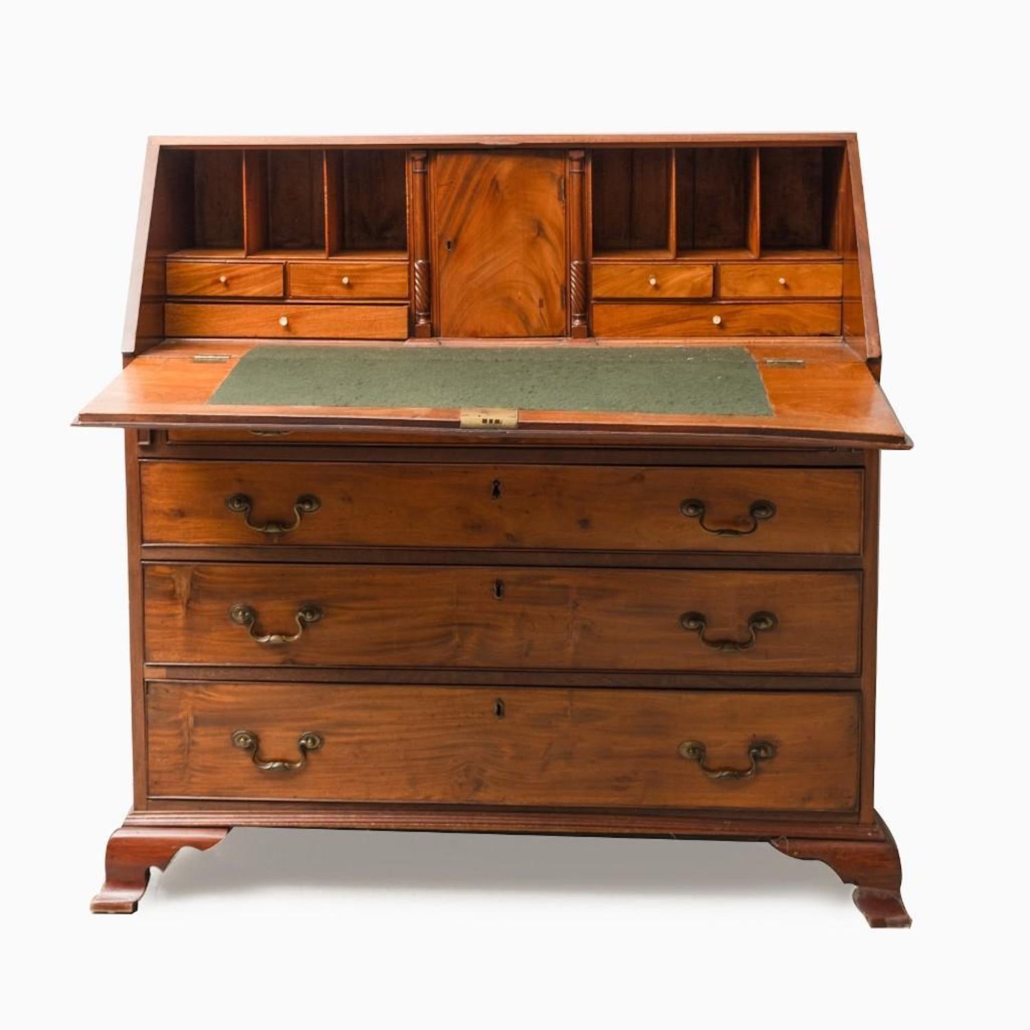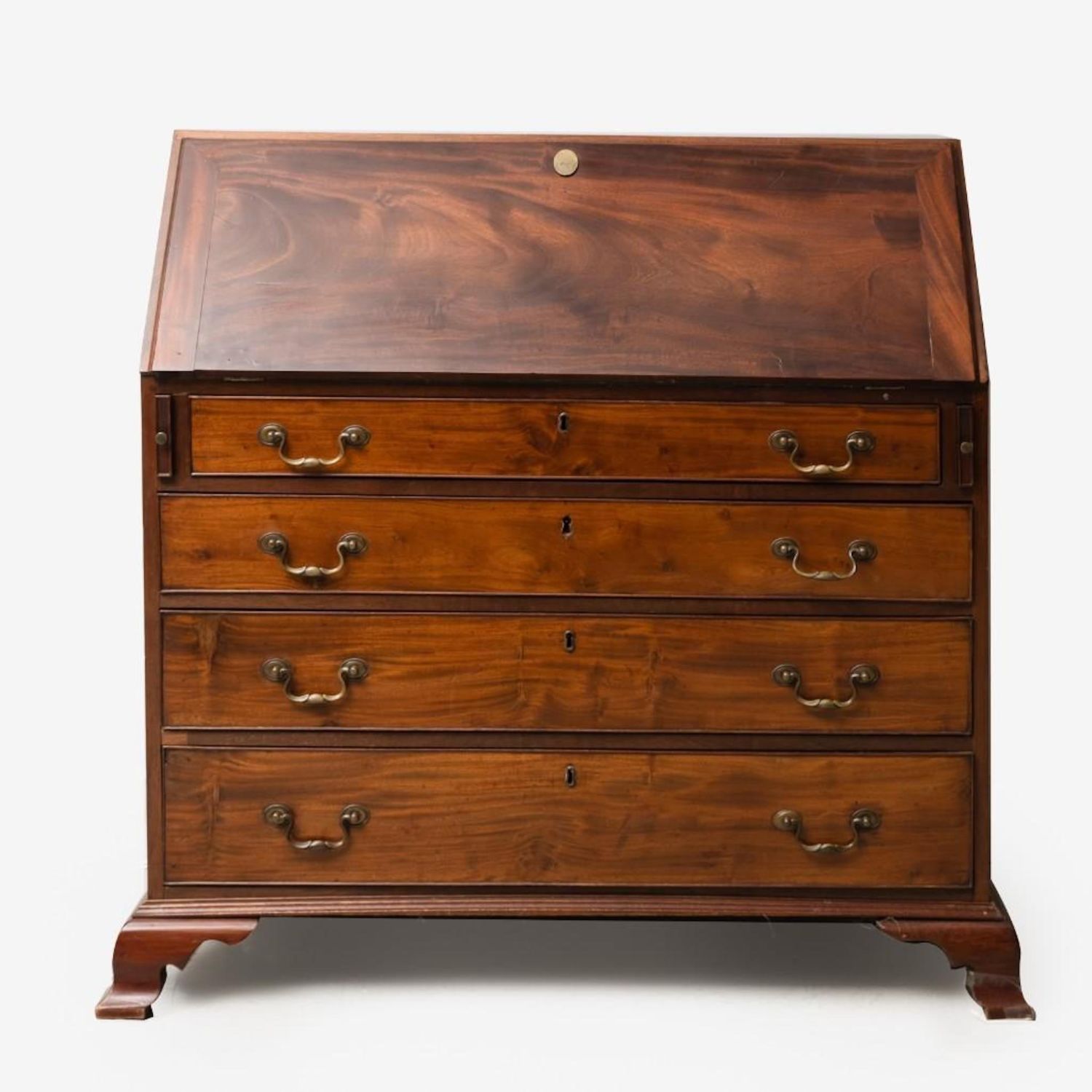 American 19th Century Mahogany Slant Front Desk. Compartmented interior and felt writing surface. Ogee bracket base. 44.75"H x 42.5"W x 21"D