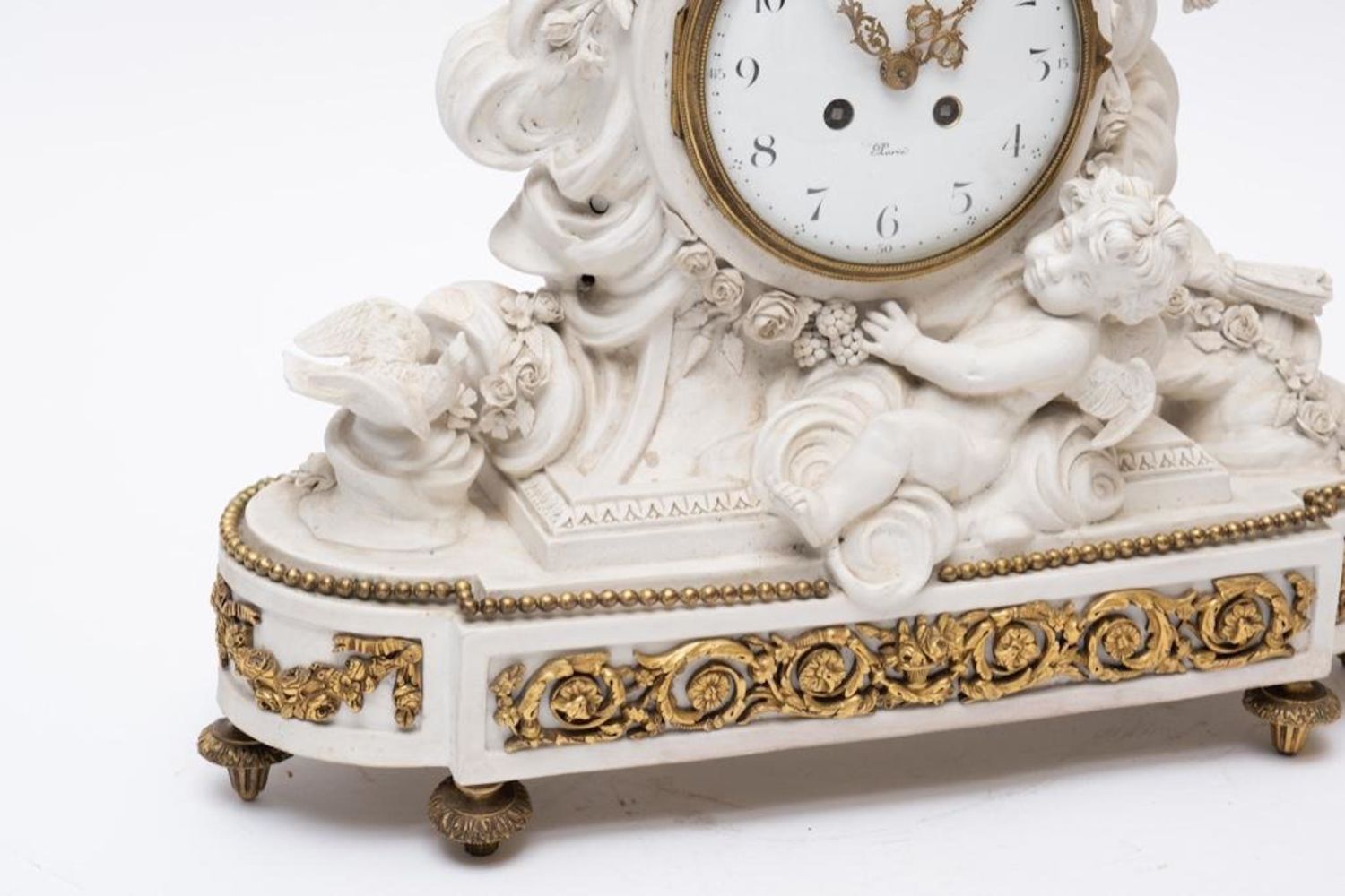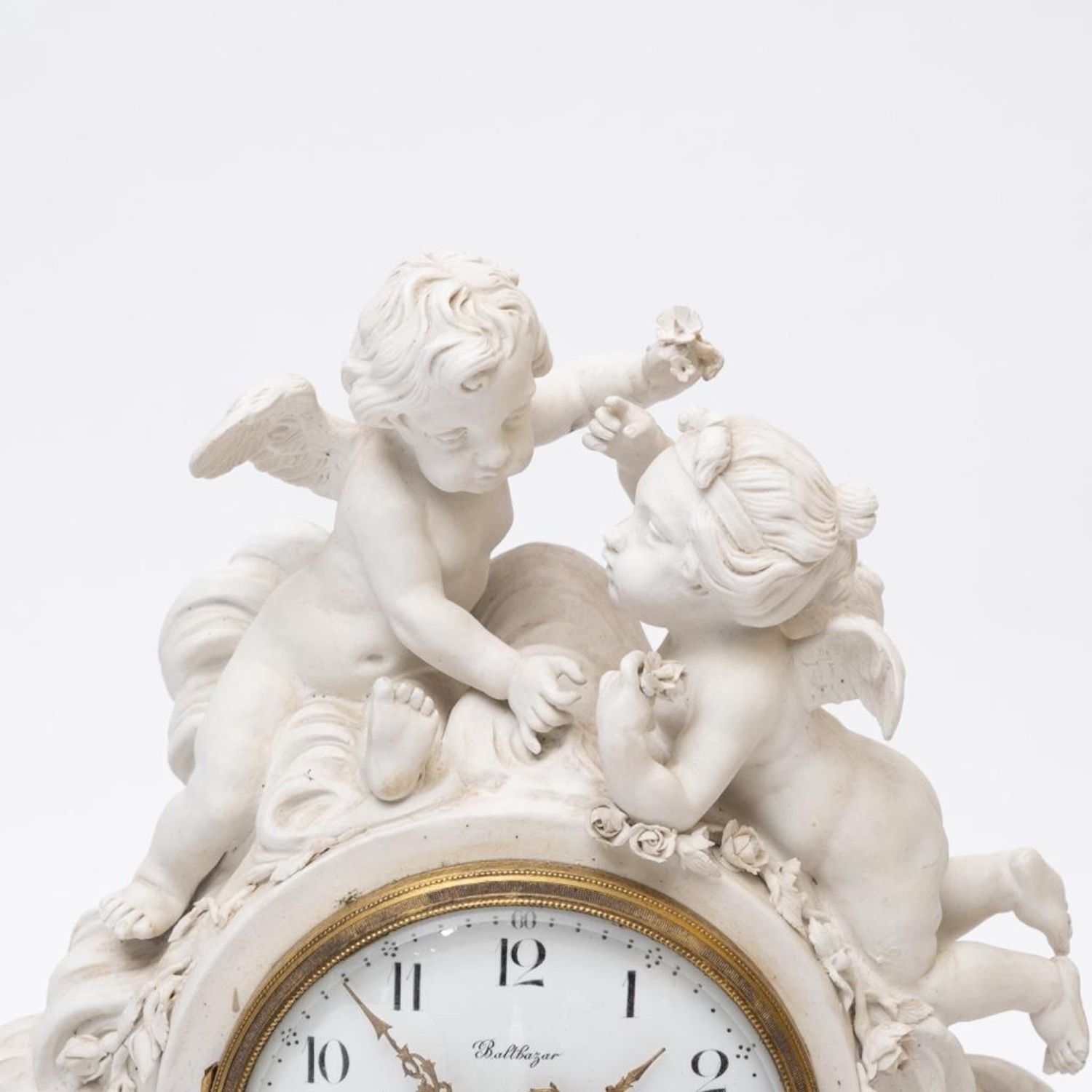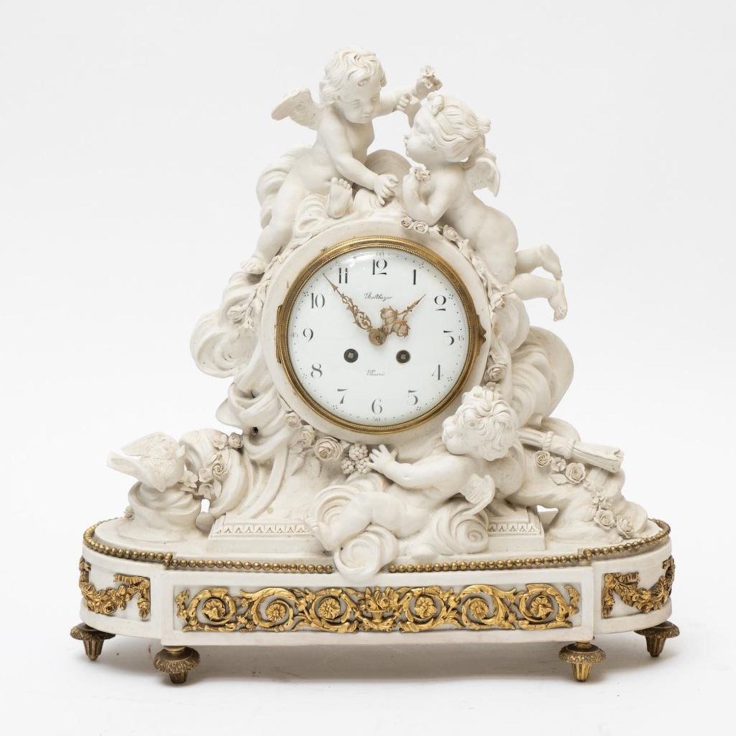 Antique Bisque porcelain and bronze Cupid Mantel Clock. Clock measures 17.5"H x 16.5"W x 6.25"D face marked Balthazar, Paris. Balthazar clocks have honored since the 1700’s Balthazar Martinot (1636–1714) was a French clockmaker, and valet de chambre of the queen and of the King.His daughter Anne Martinot married the king’s goldsmith Philippe Van Dievoet. He was considered in his time to be one of the most famous clockmakers in Europe. He made clocks for both home market and Far Eastern market. and appointed Horloger Ordinaire du Conseil du Roi. Garde-Visiteur, 1678–79 and 1693-95. He was patronized by the most influential members of society including Louis XIV antique, great case in good condition overall