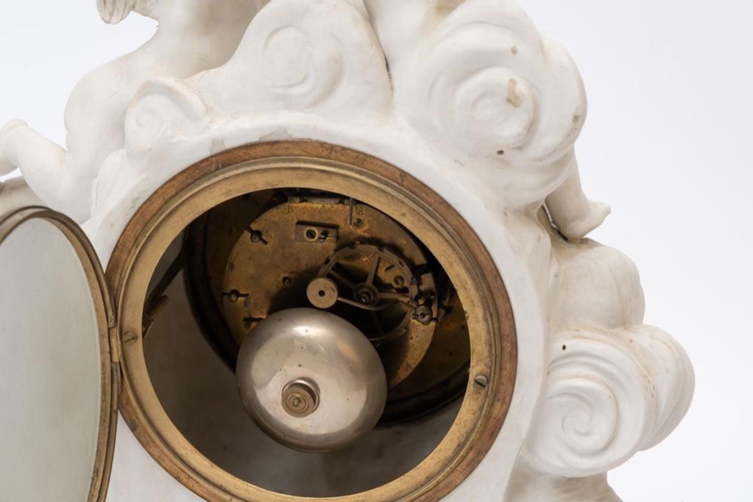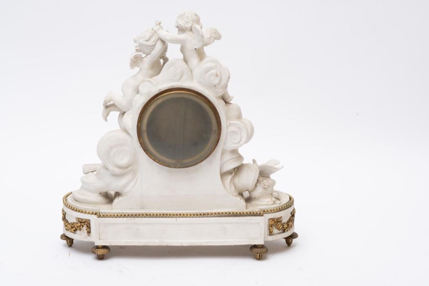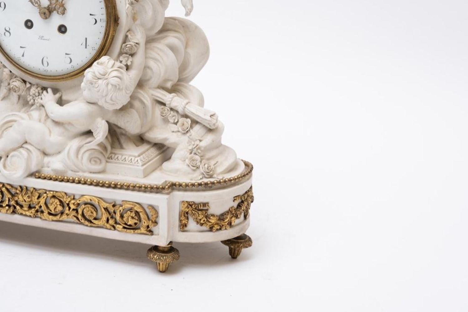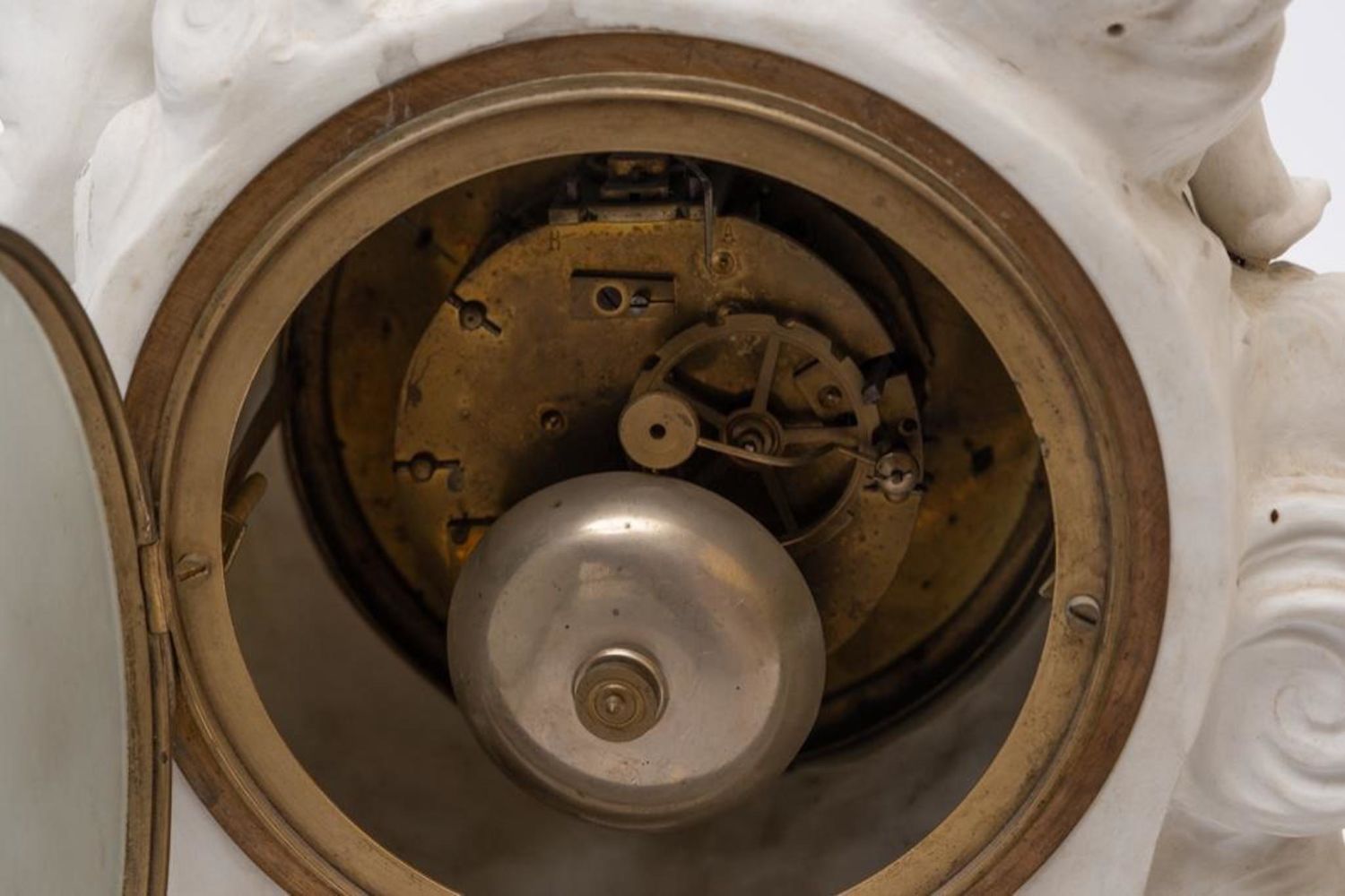 Antique Bisque porcelain and bronze Cupid Mantel Clock. Clock measures 17.5"H x 16.5"W x 6.25"D face marked Balthazar, Paris. Balthazar clocks have honored since the 1700’s Balthazar Martinot (1636–1714) was a French clockmaker, and valet de chambre of the queen and of the King.His daughter Anne Martinot married the king’s goldsmith Philippe Van Dievoet. He was considered in his time to be one of the most famous clockmakers in Europe. He made clocks for both home market and Far Eastern market. and appointed Horloger Ordinaire du Conseil du Roi. Garde-Visiteur, 1678–79 and 1693-95. He was patronized by the most influential members of society including Louis XIV antique, great case in good condition overall