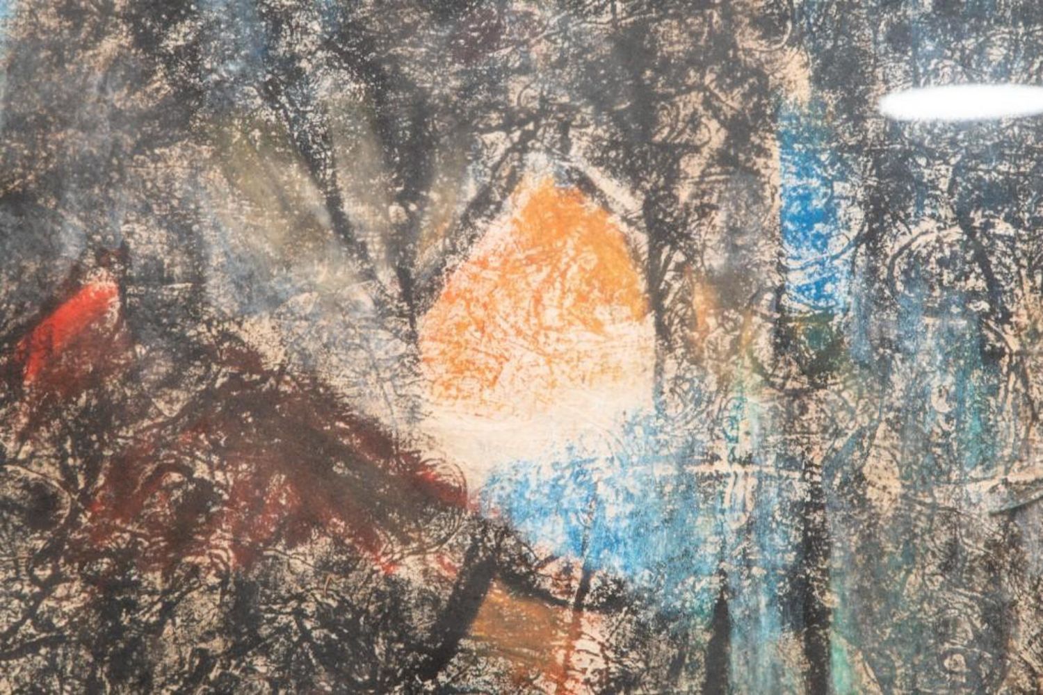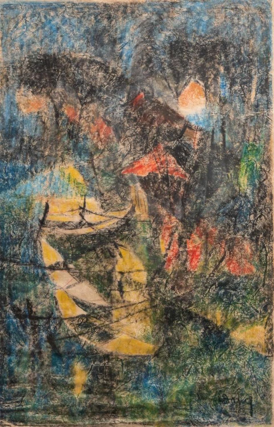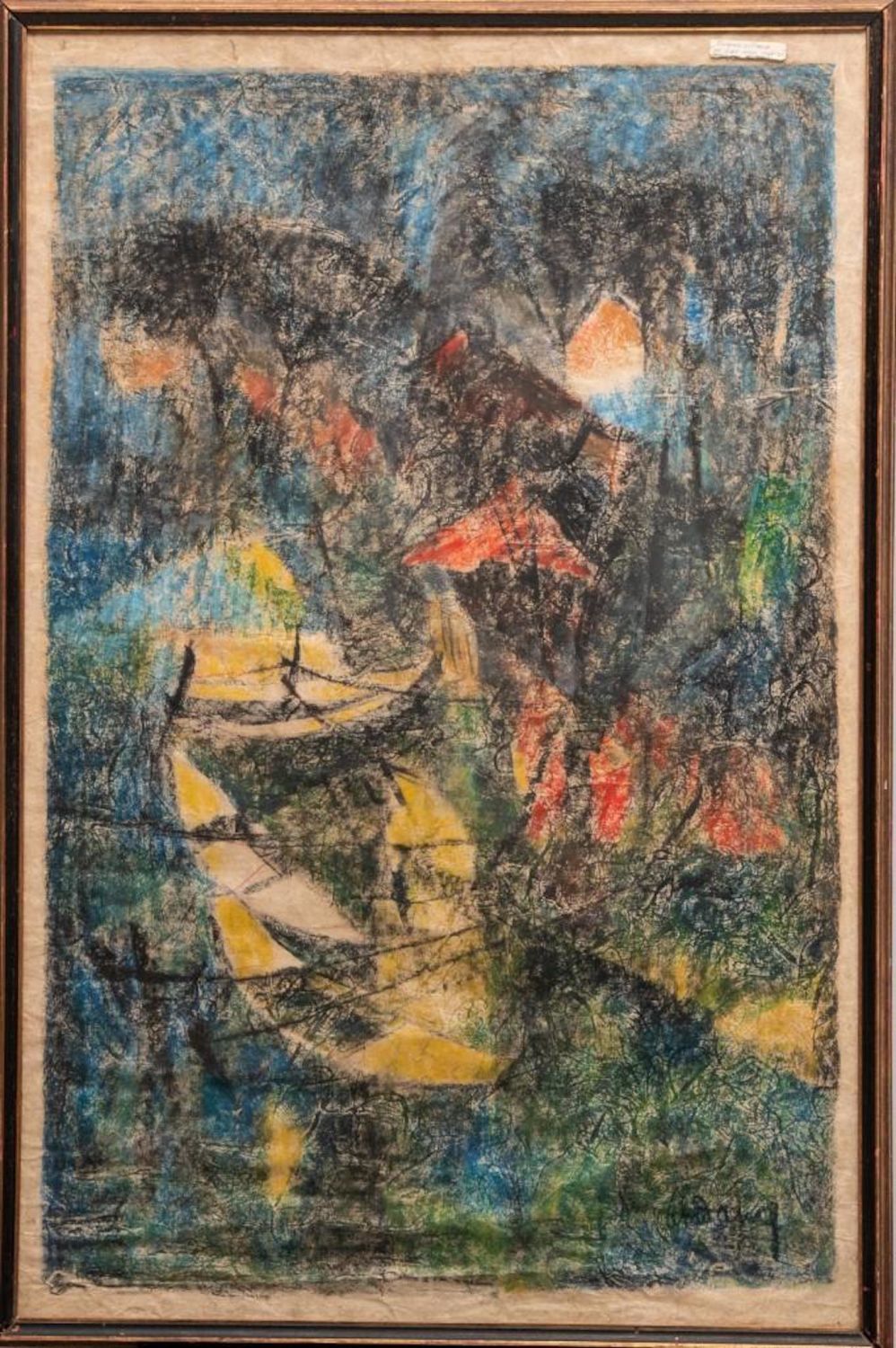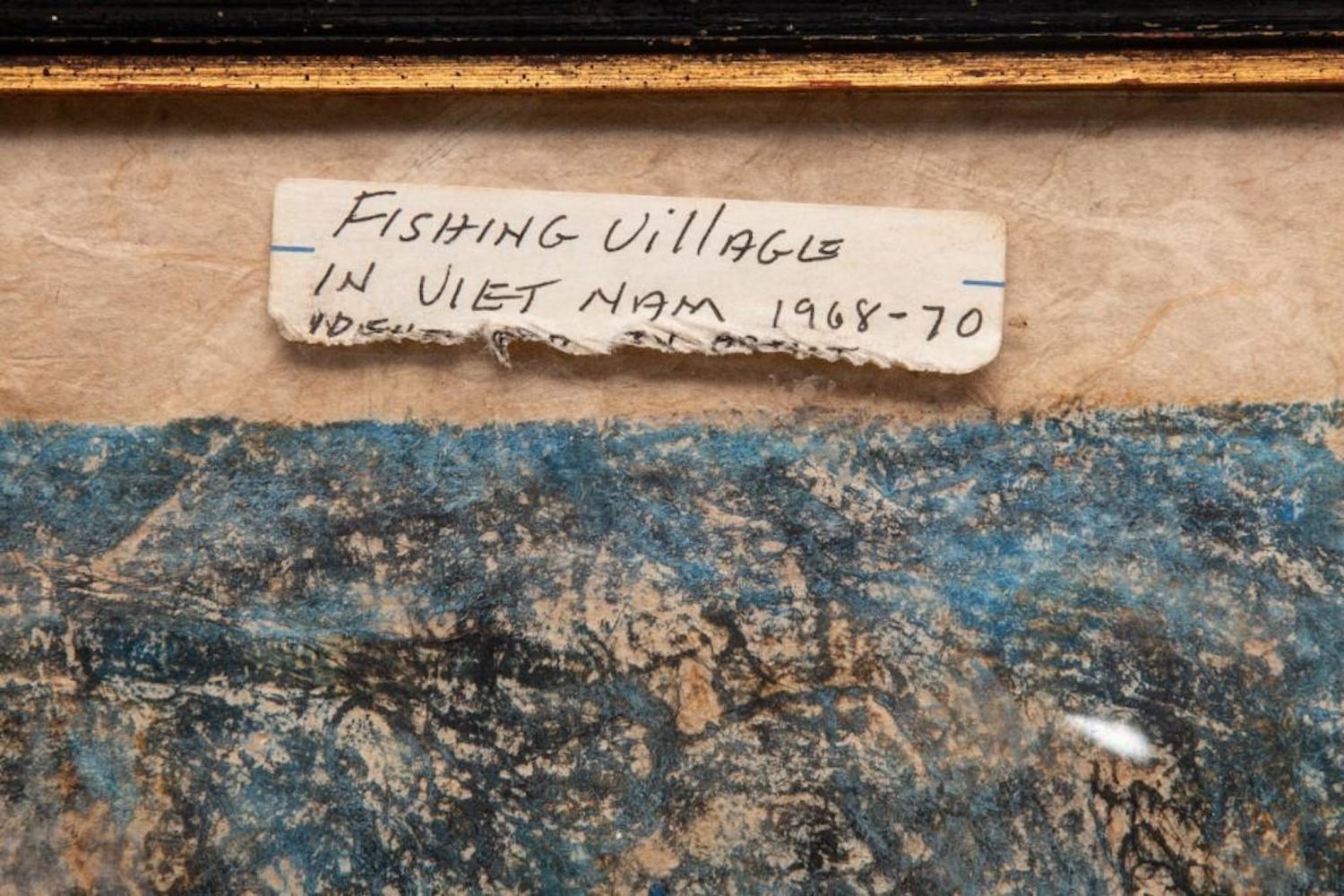"HOI LEBADANG" SIGNED MIXED MEDIA PAINTING ON HANDMADE PRESSED HEAVILY TEXTURED PAPER "FISHING VILLAGE". Framed measures 48 7/8" h x 32 1/2" w x 1 7/8" d. Picture measures 46 1/8" h x 30 1/8" w. approx in good condition overall