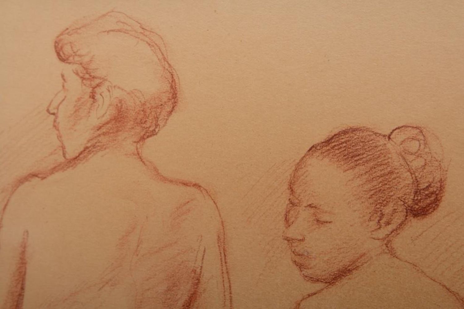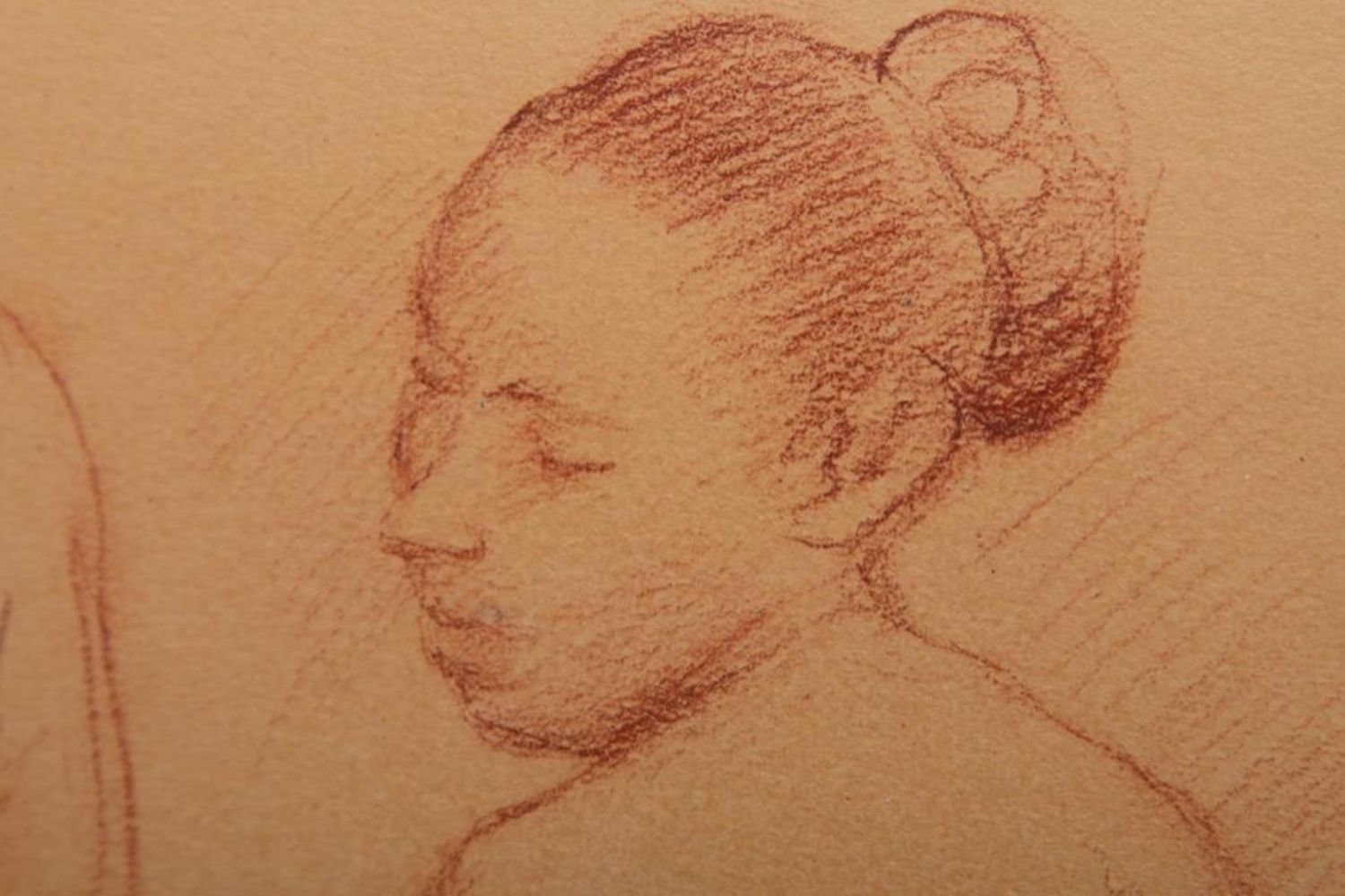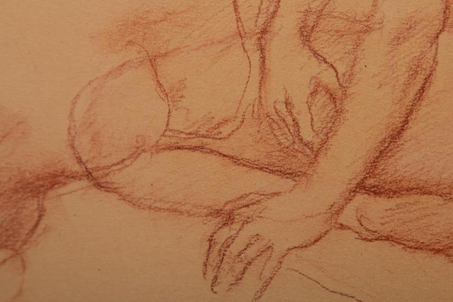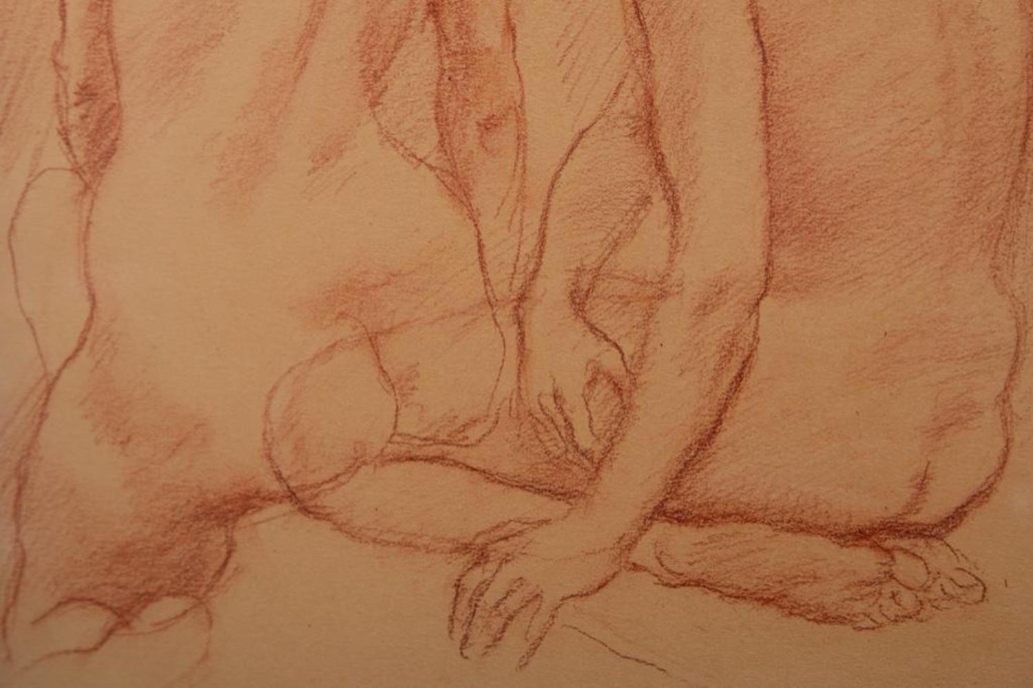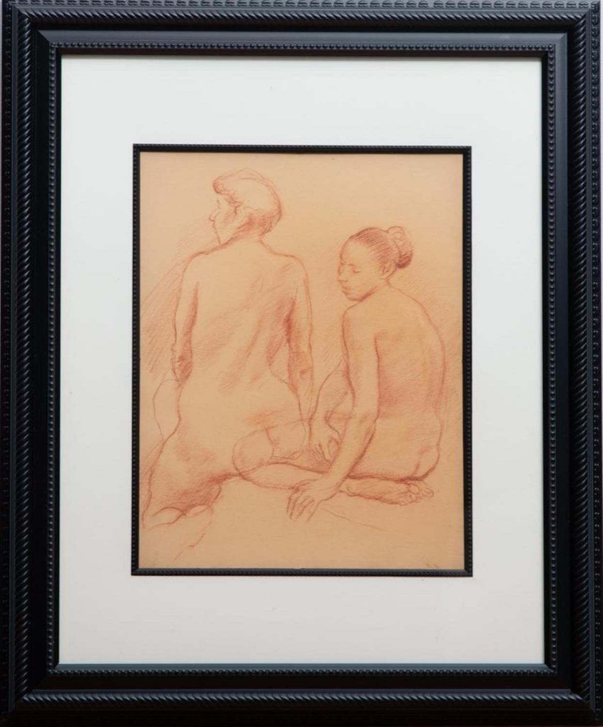 John Fenton graphite on paper drawing of two nude women sitting. Signed bottom right. Measures 19 3/8" x 23.5": Visible 13 3/8 x 10 3/8" Approx. Painter, printmaker and teacher John Fenton was born in Mountaindale, New York. He moved with his family to Mount Vernon, New York, where he lived for some thirty years before settling permanently in Woodstock, New York. He attended The Art Student’s League of New York and Atelier 17, Paris. His work was the focus of a number of one-man shows during the 1950s and 1960s, and was exhibited in numerous museums and galleries including the Art Institute of Chicago, The Museum of Modern Art in New York, The Corcoran Gallery in Washington, D.C. And the Pennsylvania Academy.Fenton taught at New York University and Goddard College. His distinctly surrealist work won awards from the American Academy of Arts and Letters, the National Academy of Design, and numerous other institutions, and is included in the collections of the Smithsonian American Art Museum, the Corcoran Gallery among others. He died at Woodstock, New York.