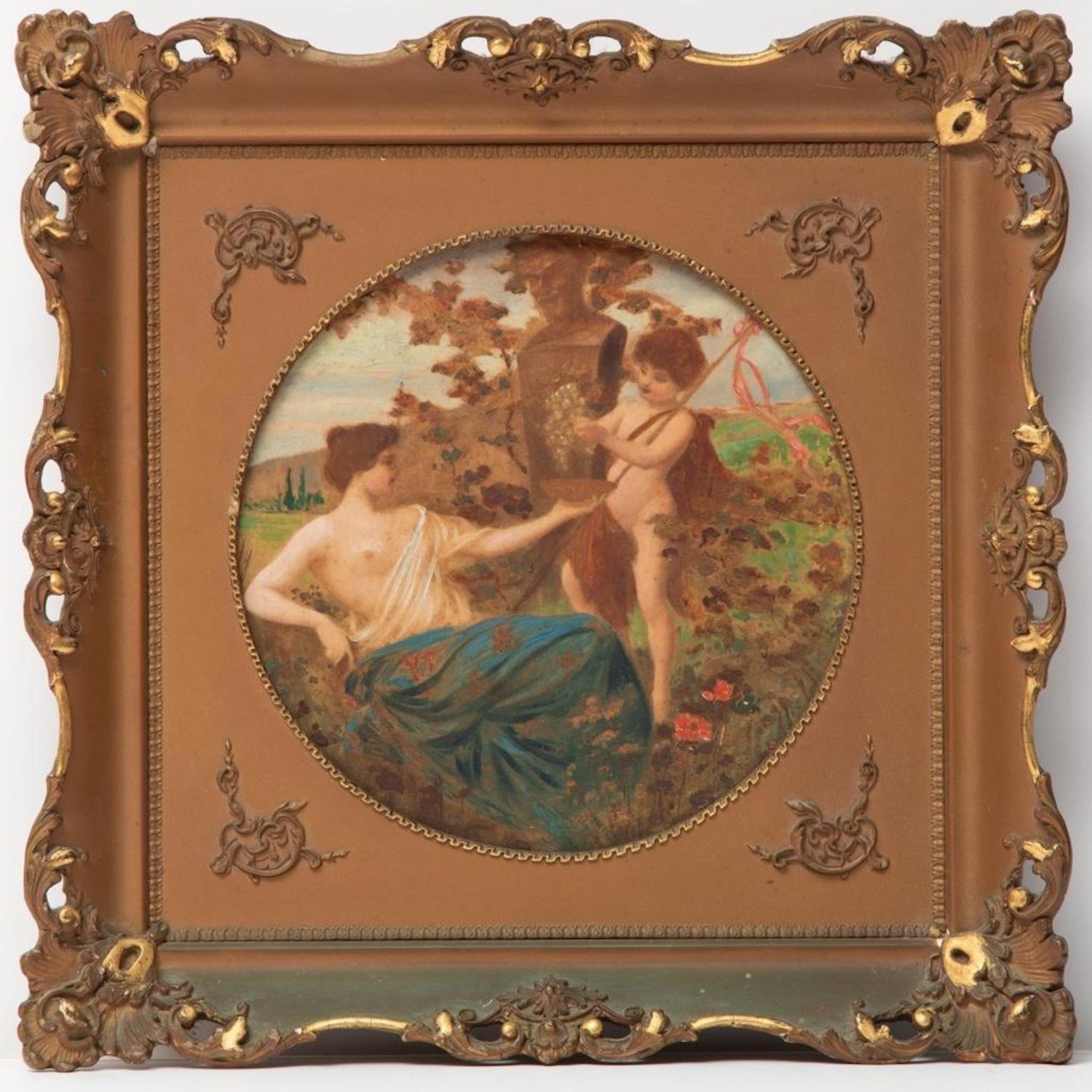 Unsigned 20th Century Paintings Of Classical Figures. Measures 14w X 14h With Frame. 8.5h X 8.5w Visible Area. good condition overall