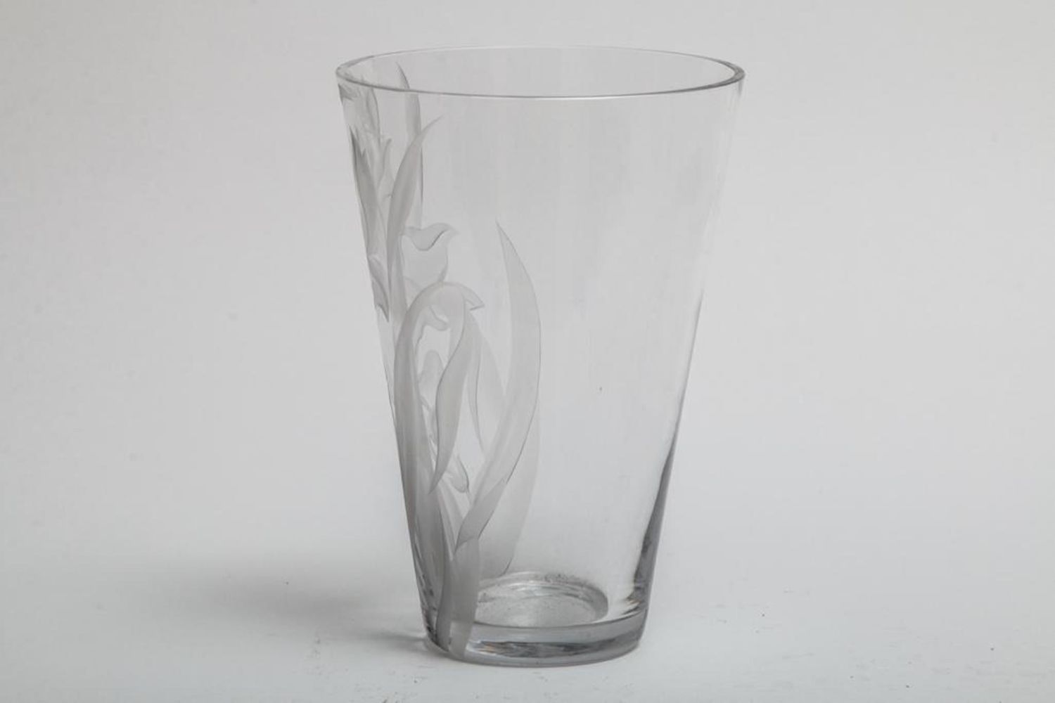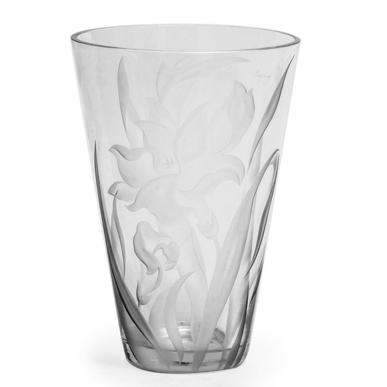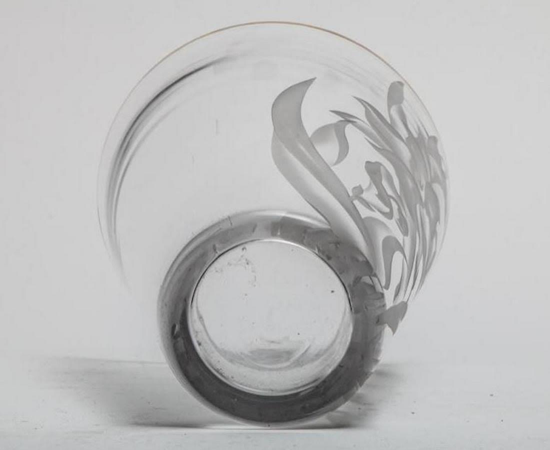 Franz Grosz Signed etched art glass vase. Measures 12"H x 8.25"D. Franz Grosz (b1909) studied at the Art Students League and the National Academy. He had a long and varied career, starting as a WPA artist. He exhibited at the Bodley Gallery in NYC, Galerie Visconti in Paris, Carnegie Institute , etc