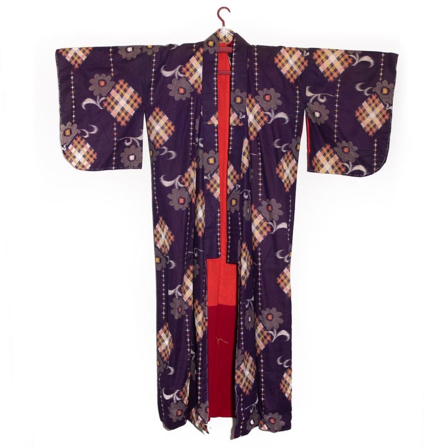 circa 1900 antique ikat handwoven cotton kimono. This purple kimono features yellow, peach and off-white kiri, koushi print diamond and geometric motifs. It is lined in tomato red and brick red cotton. In good condition 48." sleeve span, 60" overall length