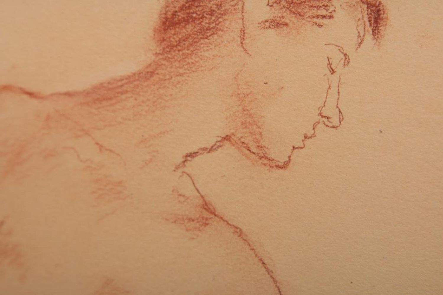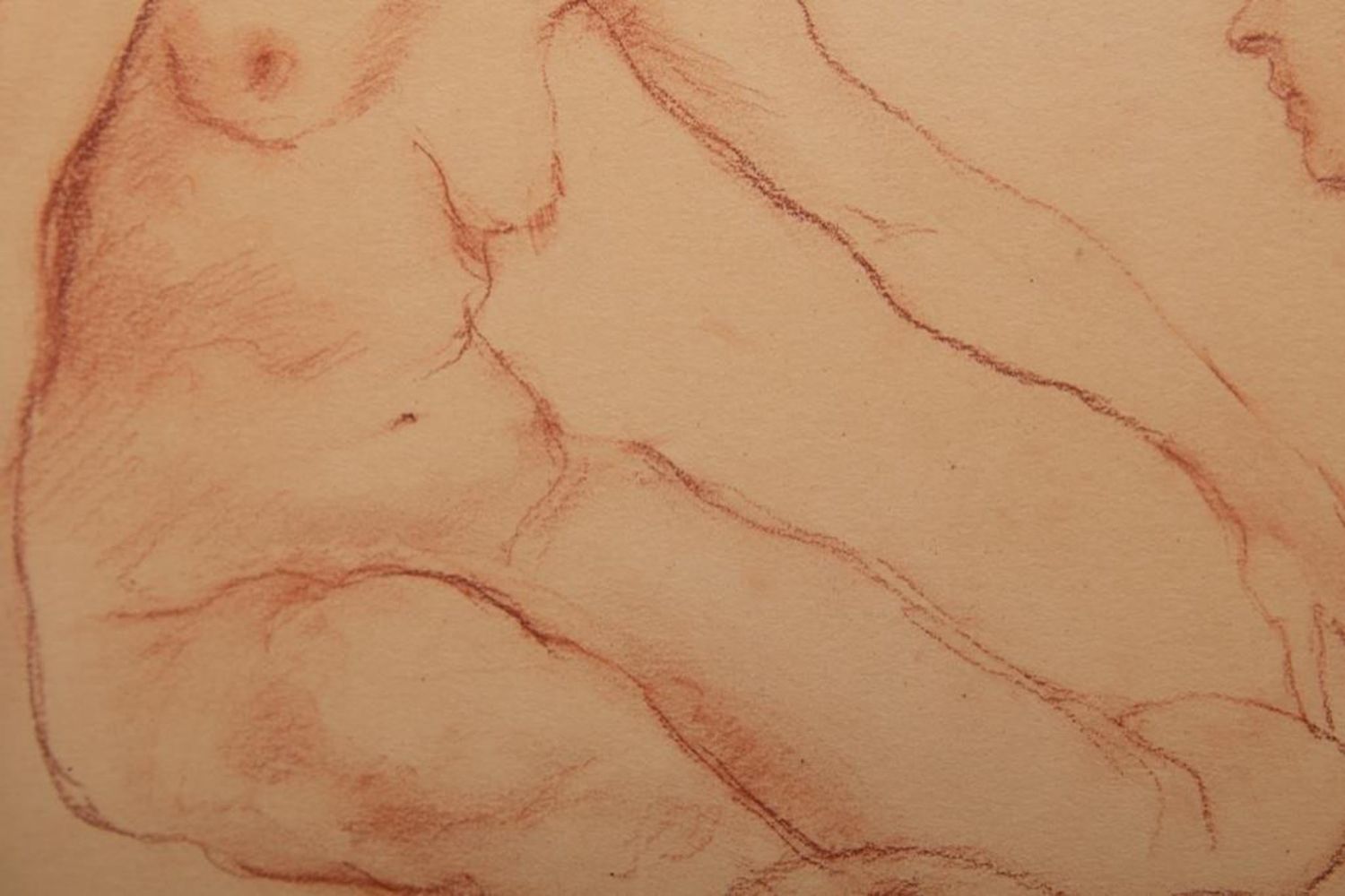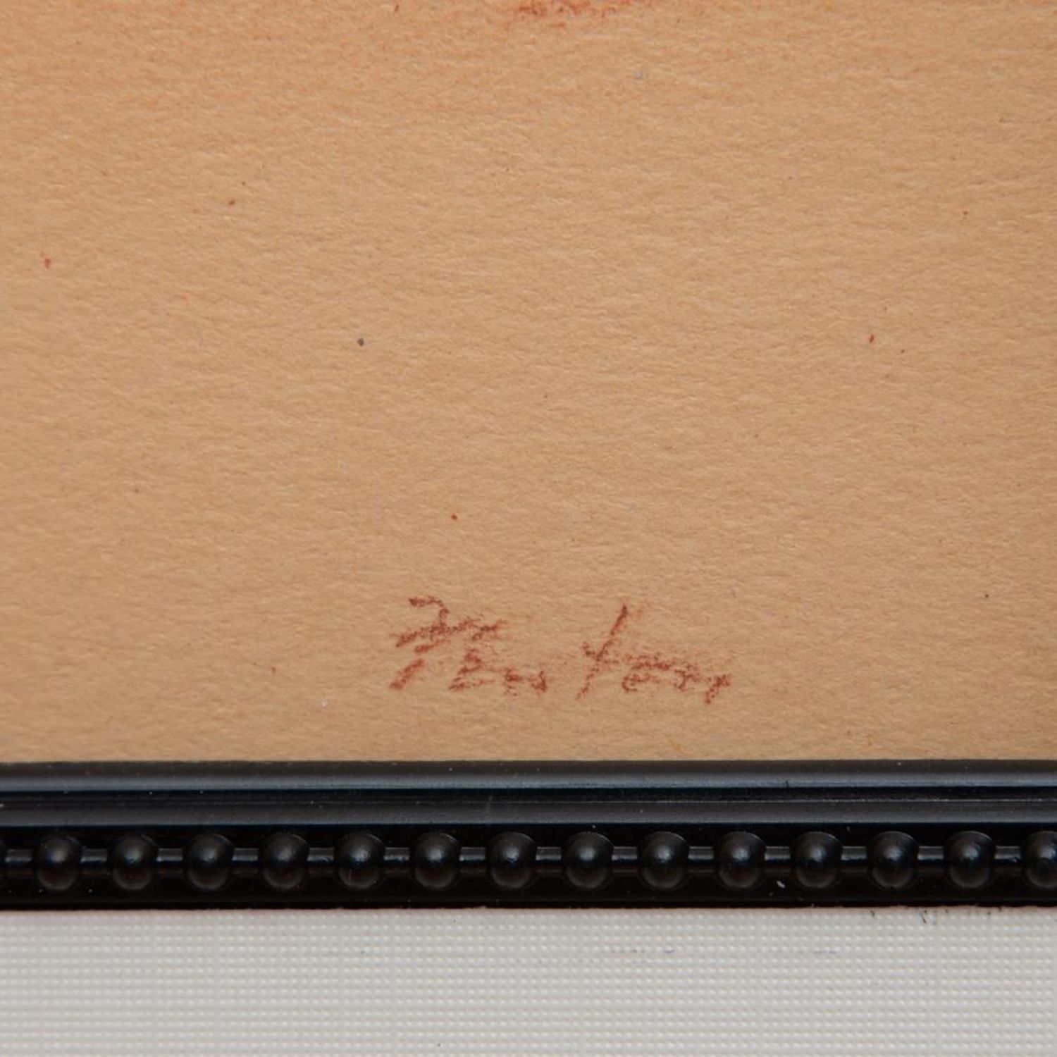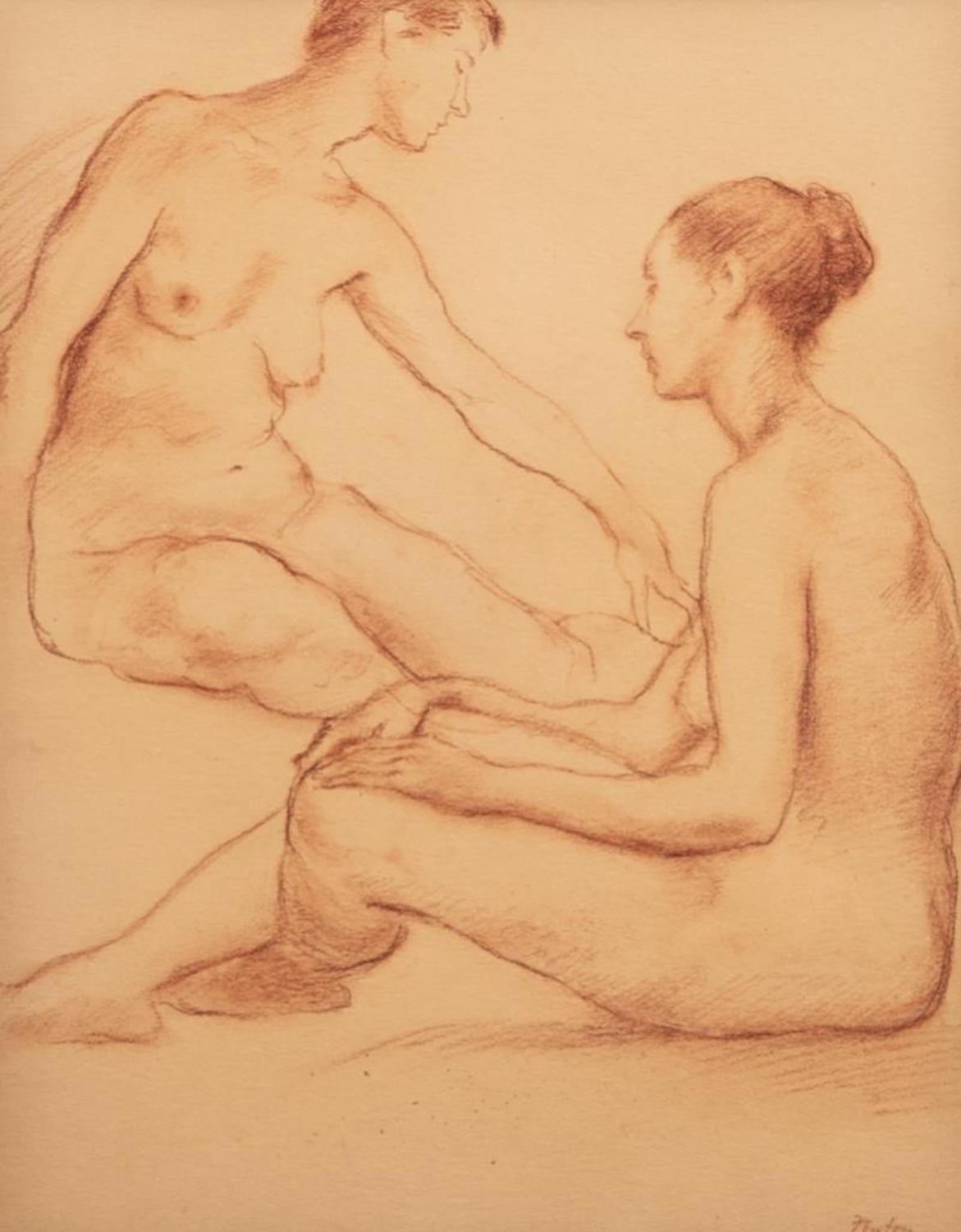 John Fenton crayon on paper drawing of two nude women sitting. Signed bottom right. Measures 19 3/8" x 23.5": Visible 13 3/8 x 10 3/8" Approx. Painter, printmaker and teacher John Fenton was born in Mountaindale, New York. He moved with his family to Mount Vernon, New York, where he lived for some thirty years before settling permanently in Woodstock, New York. He attended The Art Student’s League of New York and Atelier 17, Paris. His work was the focus of a number of one-man shows during the 1950s and 1960s, and was exhibited in numerous museums and galleries including the Art Institute of Chicago, The Museum of Modern Art in New York, The Corcoran Gallery in Washington, D.C. And the Pennsylvania Academy.Fenton taught at New York University and Goddard College. His distinctly surrealist work won awards from the American Academy of Arts and Letters, the National Academy of Design, and numerous other institutions, and is included in the collections of the Smithsonian American Art Museum, the Corcoran Gallery among others. He died at Woodstock, New York.