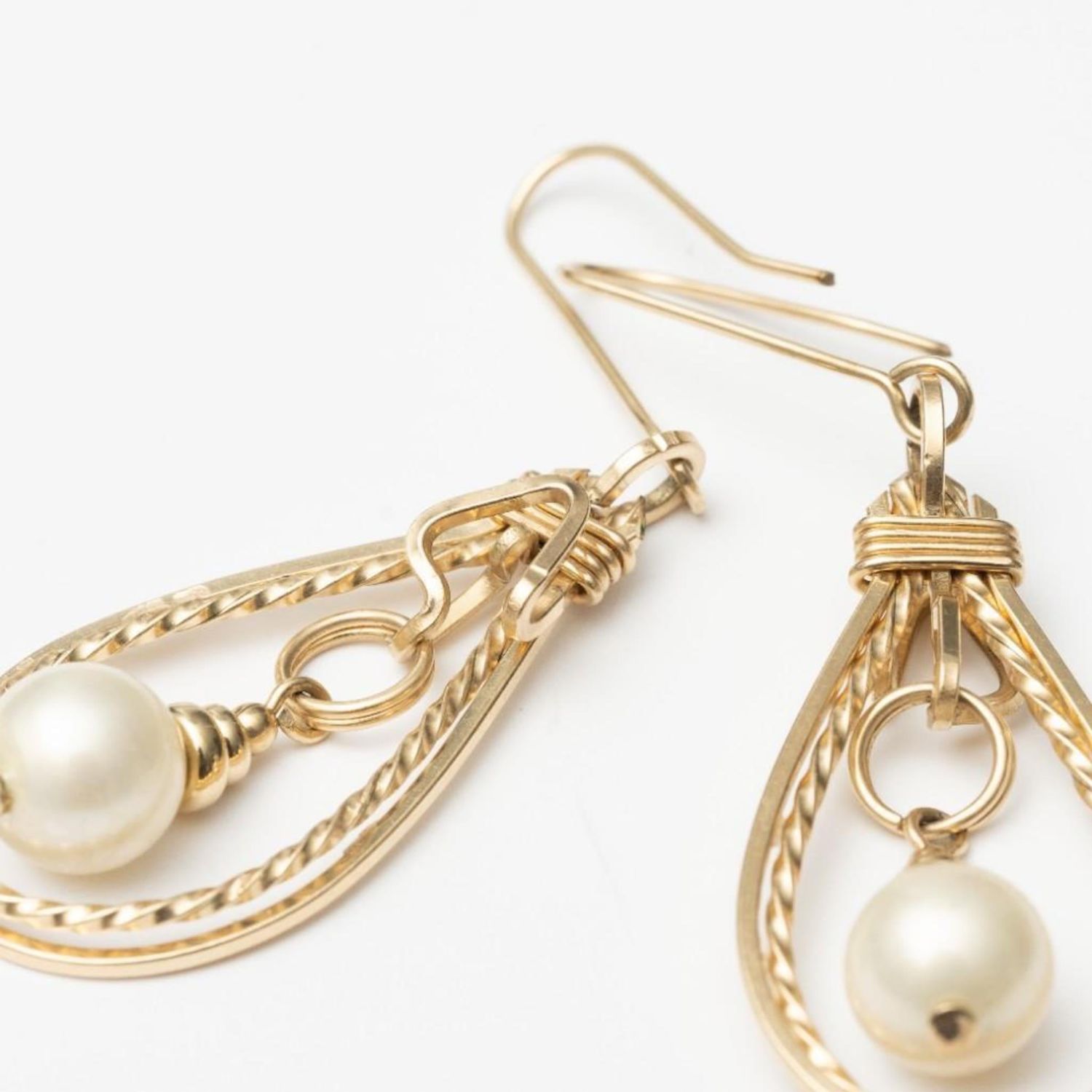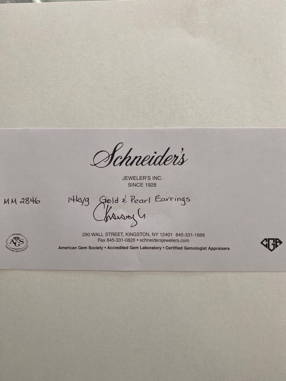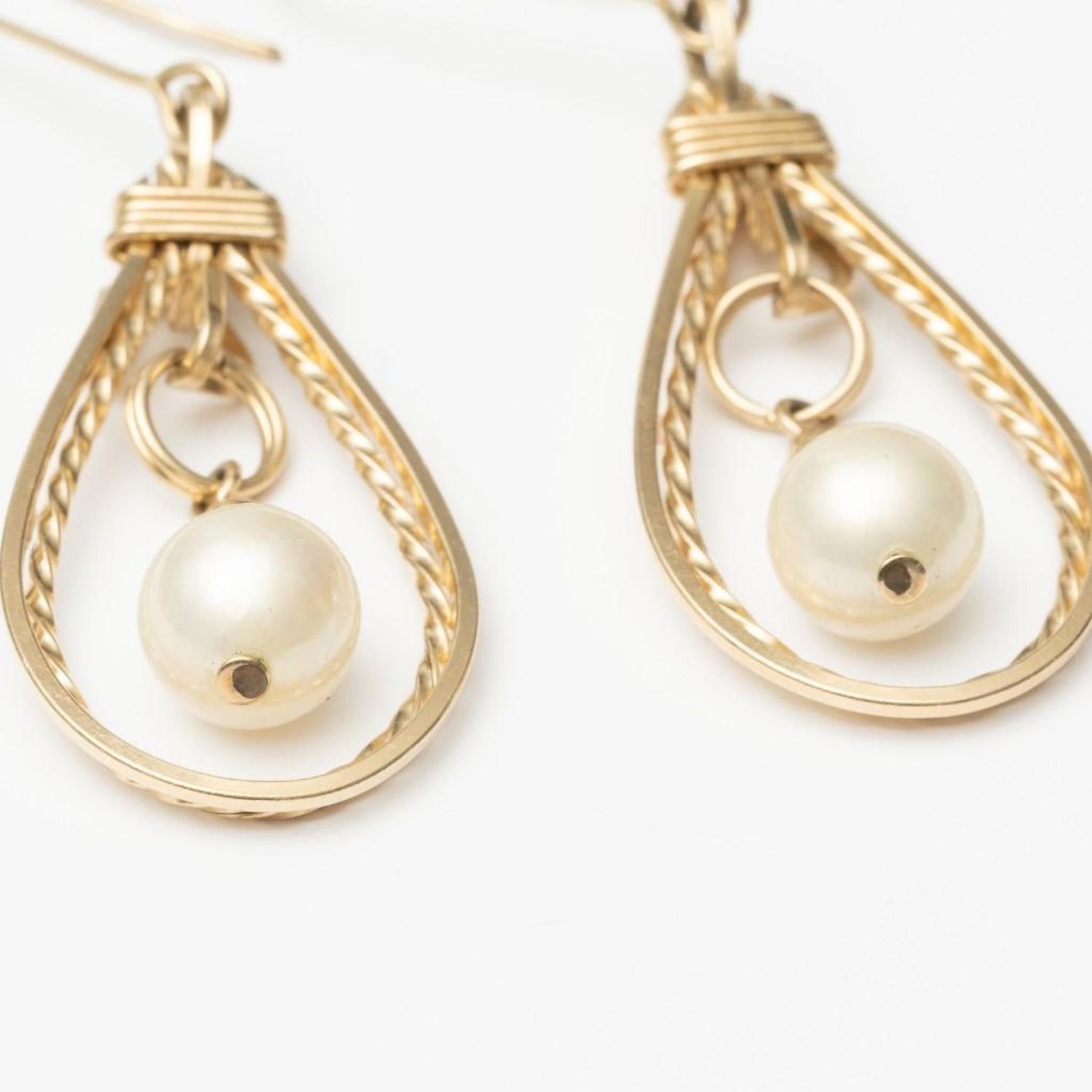 14K Gold and Pearl Earrings. Earring Pendant measure 37.8mm long. 57mm to top of earring hook. The pearl is 8mm. Weighs 5.7 grams good condition overall