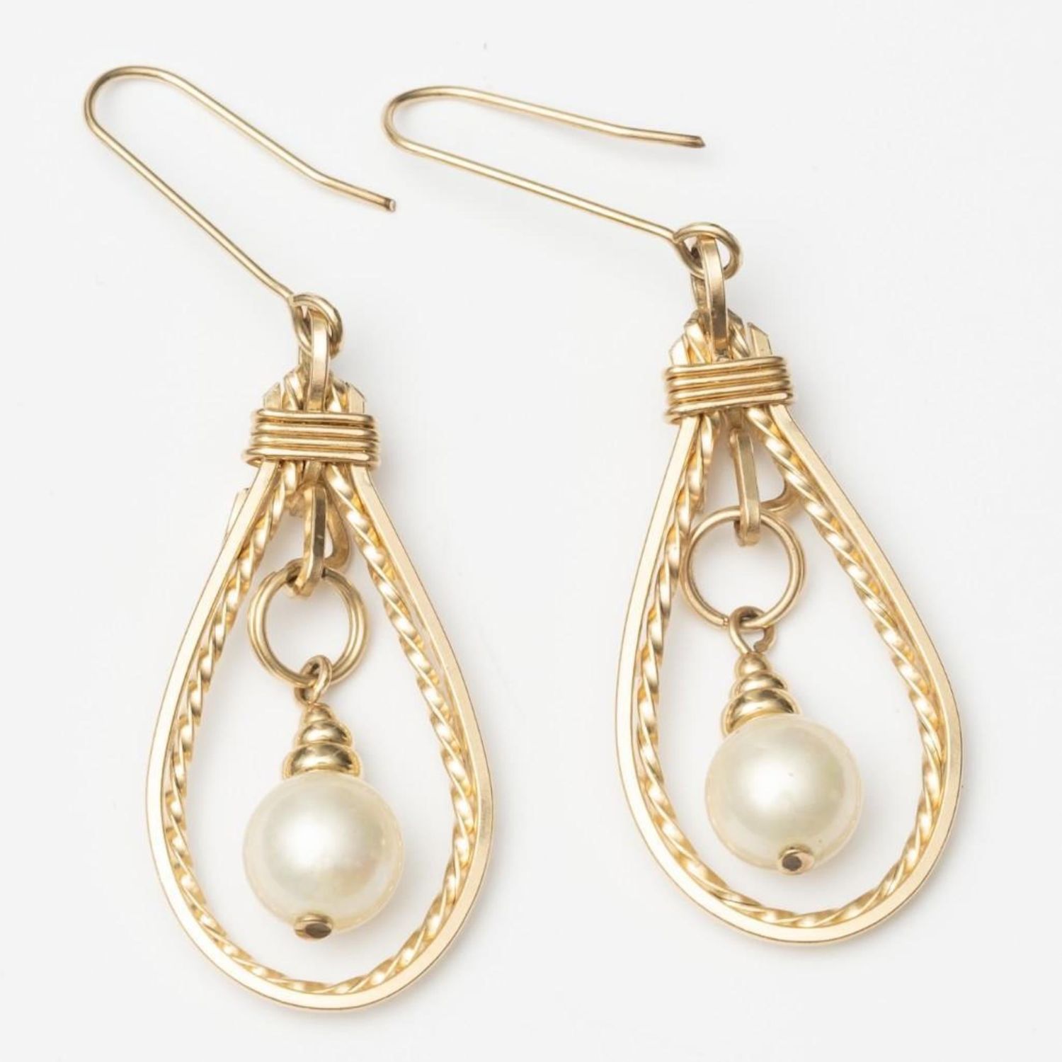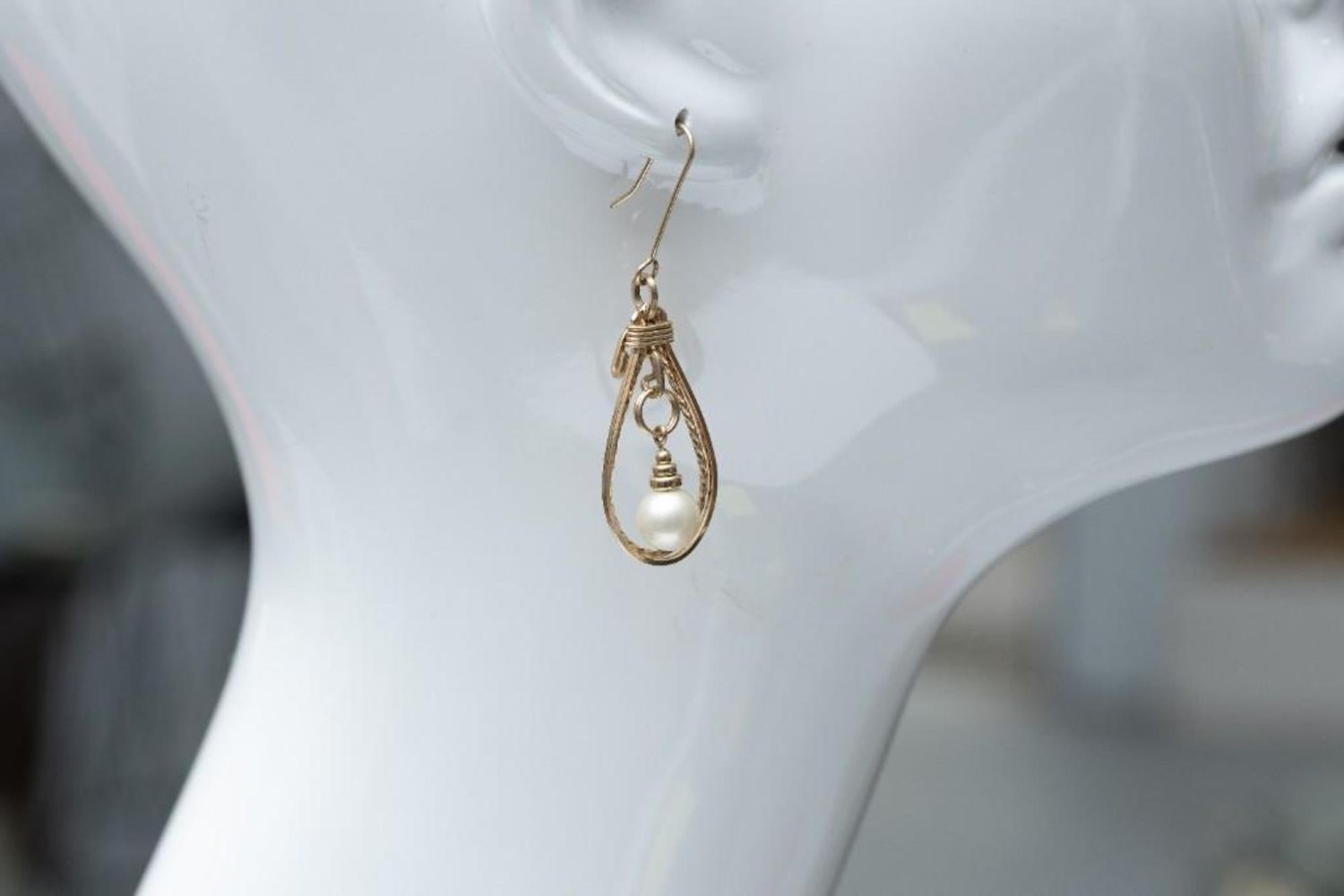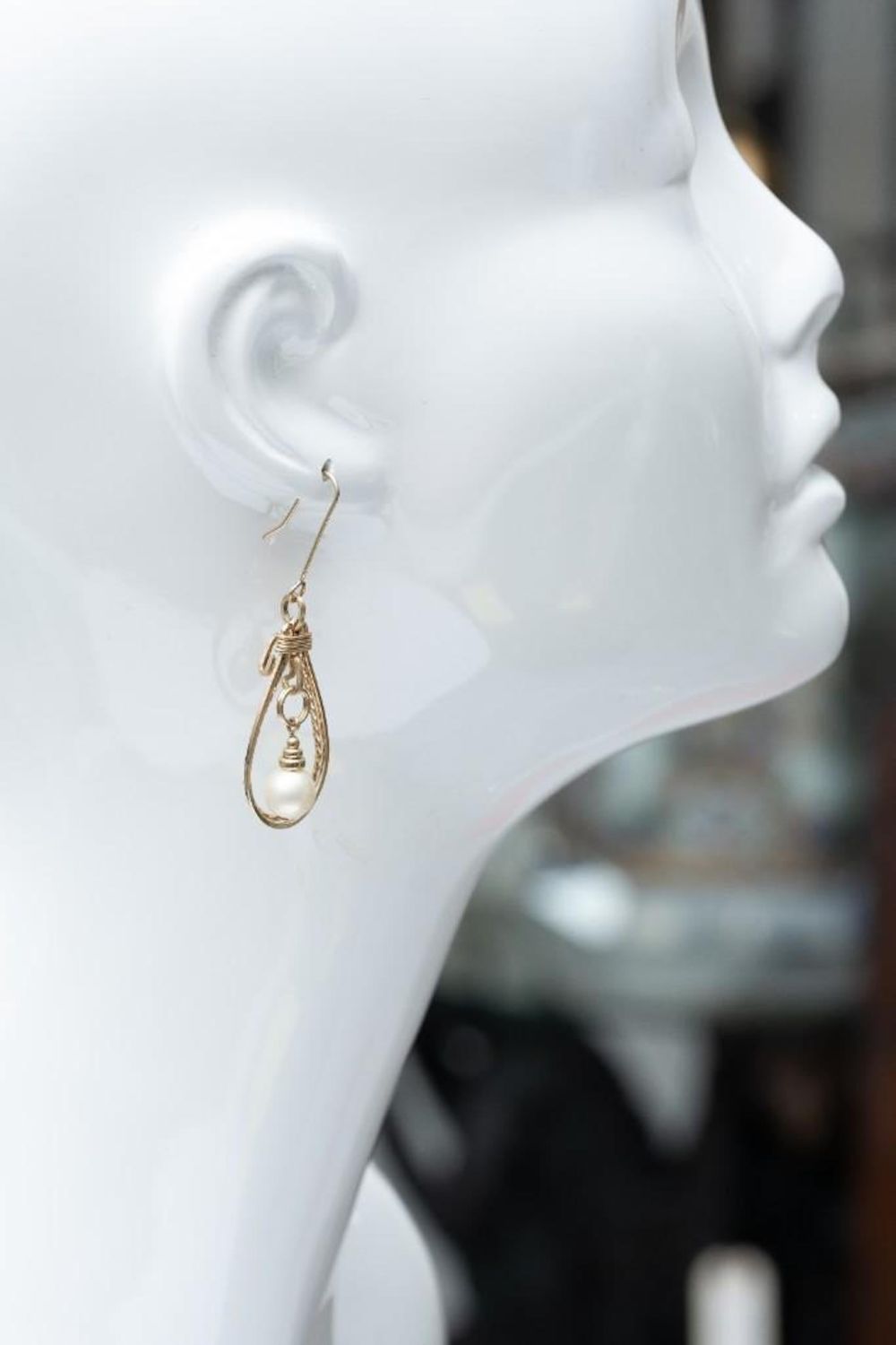 14K Gold and Pearl Earrings. Earring Pendant measure 37.8mm long. 57mm to top of earring hook. The pearl is 8mm. Weighs 5.7 grams good condition overall