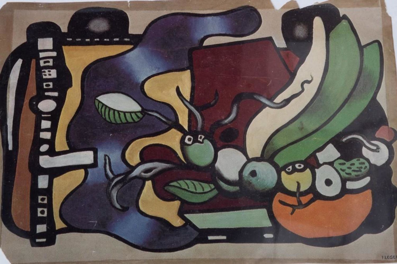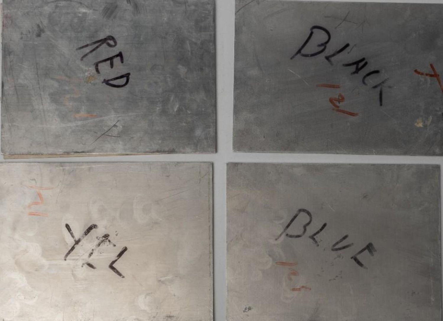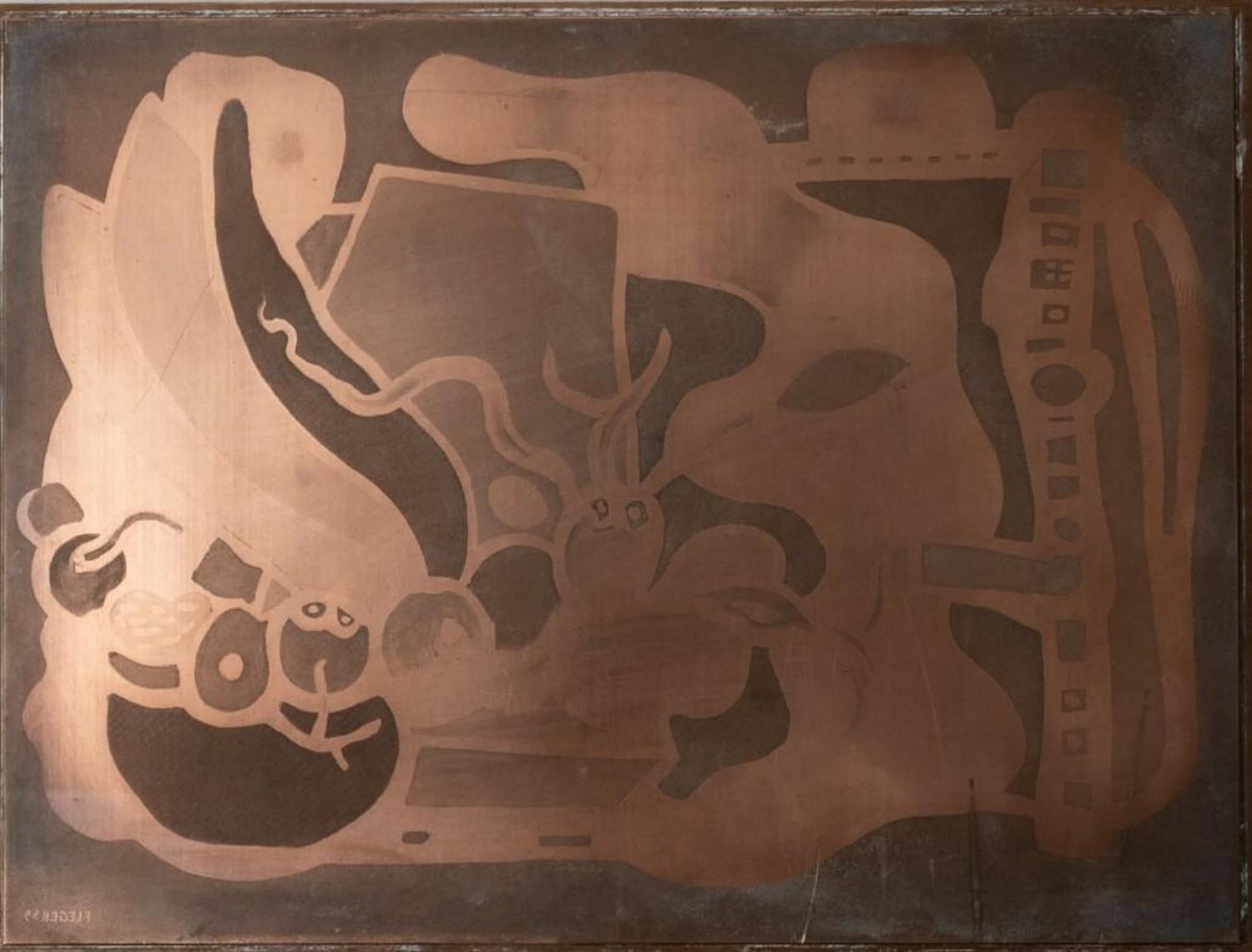 Fernand Leger, set of the original copper printing plates, Fernand Leger (French, 1881-1955), (4) plates, copper layer on steel or similar white metal base, blue, yellow, black and red for a screened offset print of a still life, from an unknown publication, with a printed proof, each plate marked on verso with the color, 5.5"h x 7.25"w